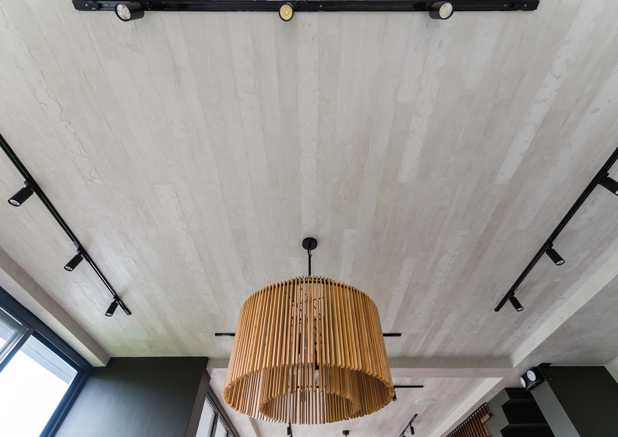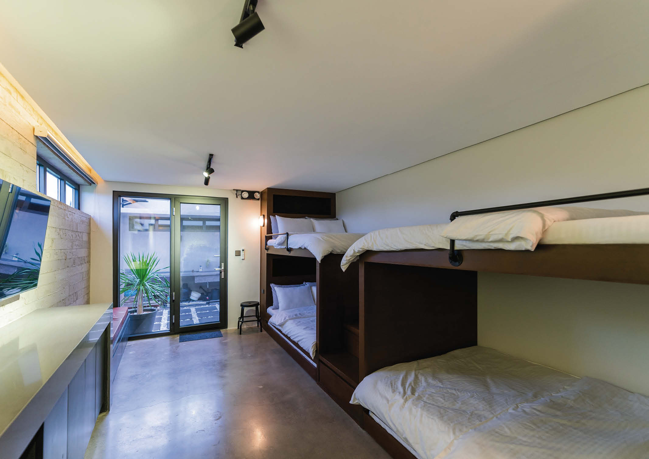 The second level is a private space for the client, anchored by a peninsula counter with a waterfall edge in white quartz that serves as a dining bar and separates the kitchen and living area. From the eaves to the interior, the ceiling is finished with solid merbau wood panels, achieving a warm and intimate atmosphere fit for the area. A sliding frosted glass wooden door separates the adjacent bedroom. The wardrobe, made of repurposed wood, binds its opposite sides. From here, you can access a balcony with a sweeping view of the property. The team used double pane glazing and a stone coated roof to ensure the main house has good heat and sound insulation.