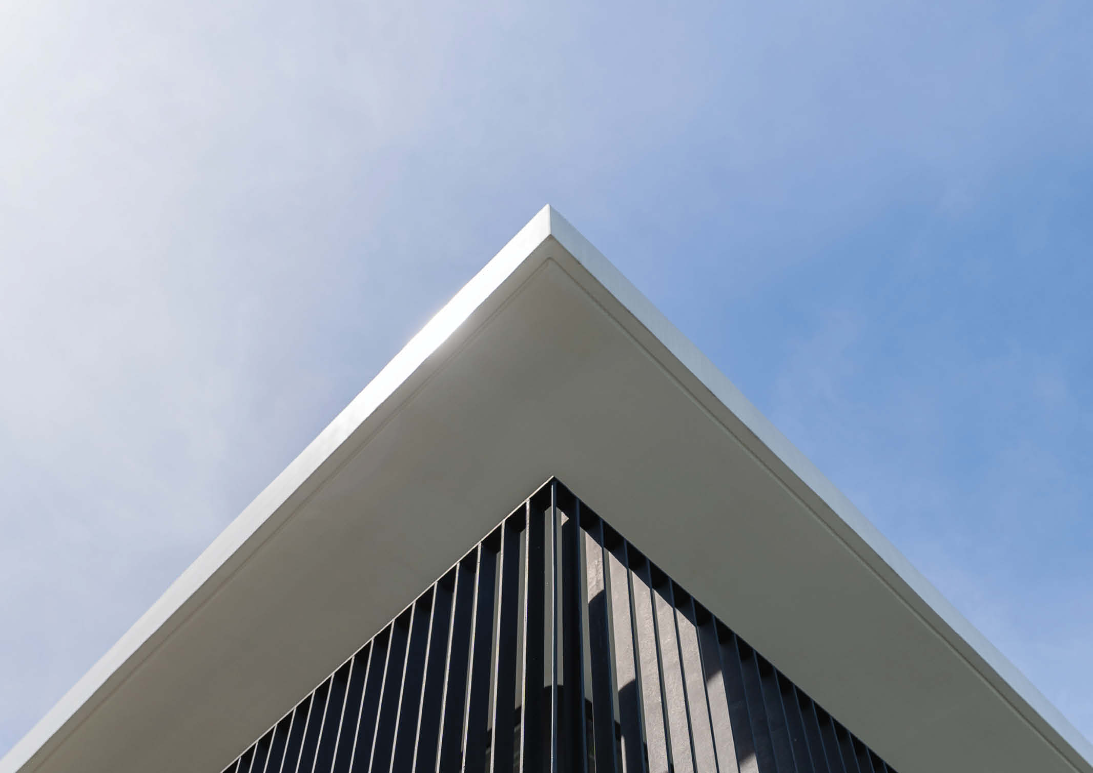 The lot’s shape presented the architects with the initial challenge, as parts of it tapered to as narrow as one meter. To address this, individual structures were zoned around the site’s various corners, each serving its own purpose while remaining symbiotic. The main residence and pool area are the first structures visible upon arrival. These were placed in the center to emphasize their significance in the space hierarchy. Simultaneously, these structures were pushed to the perimeter to create clear sightlines and a central gathering area. The primary residence has an asymmetrical facade with multiple volumes, full-height glazing, wood cladding, and a raw concrete finish. A cantilevered balcony with a simple railing made up of vertical flat bars above the main entrance provides shade as the day progresses. A retractable electric canopy is installed for simple deployment that does not compromise the façade when not in use.