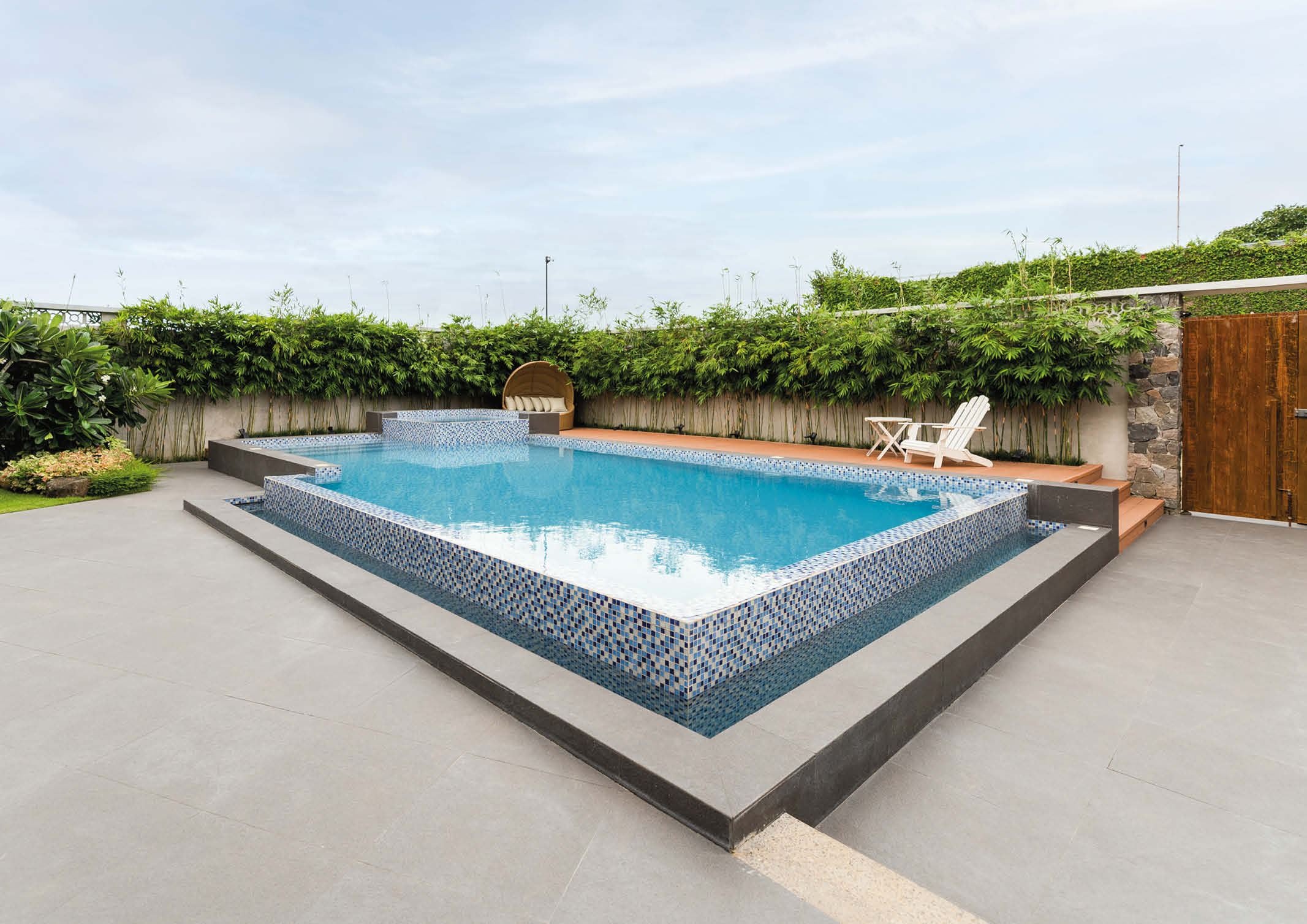 Opposite the main residence is a glass mosaic tiled swimming pool attached to a heated jacuzzi with massage jet function. The outdoor element is elevated by a raised deck for lounging that is bordered by bamboo trees. In addition, a small casita sits to the right of the main house, equipped with a small sitting area and a full bathroom.