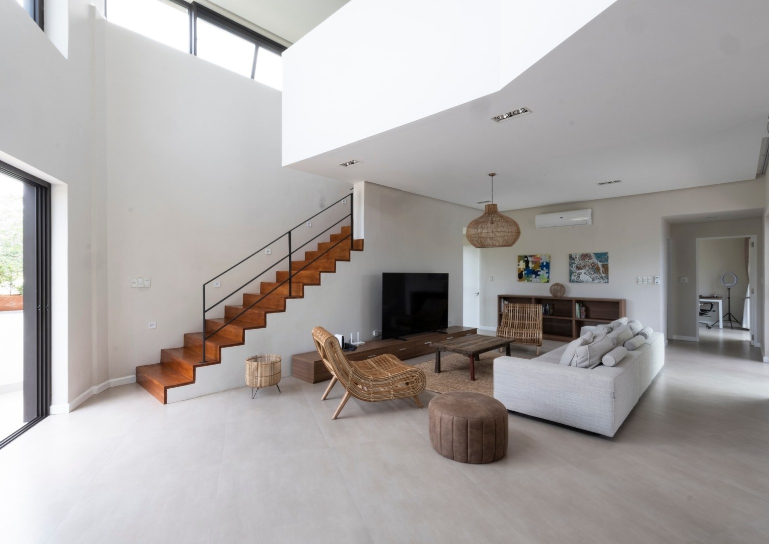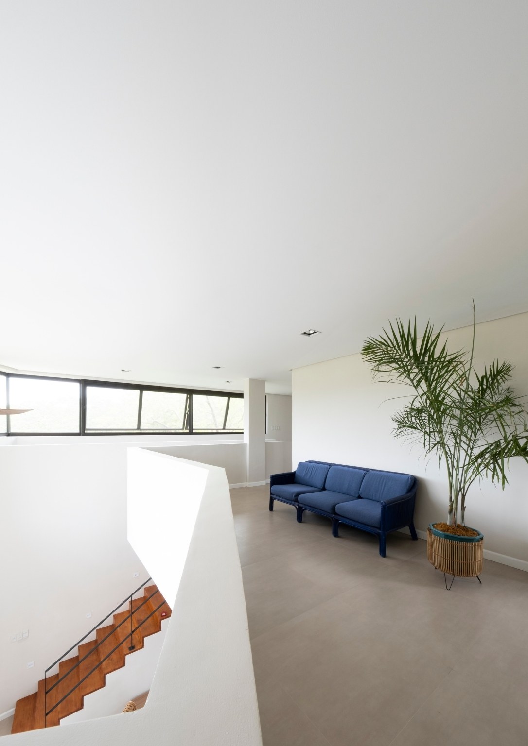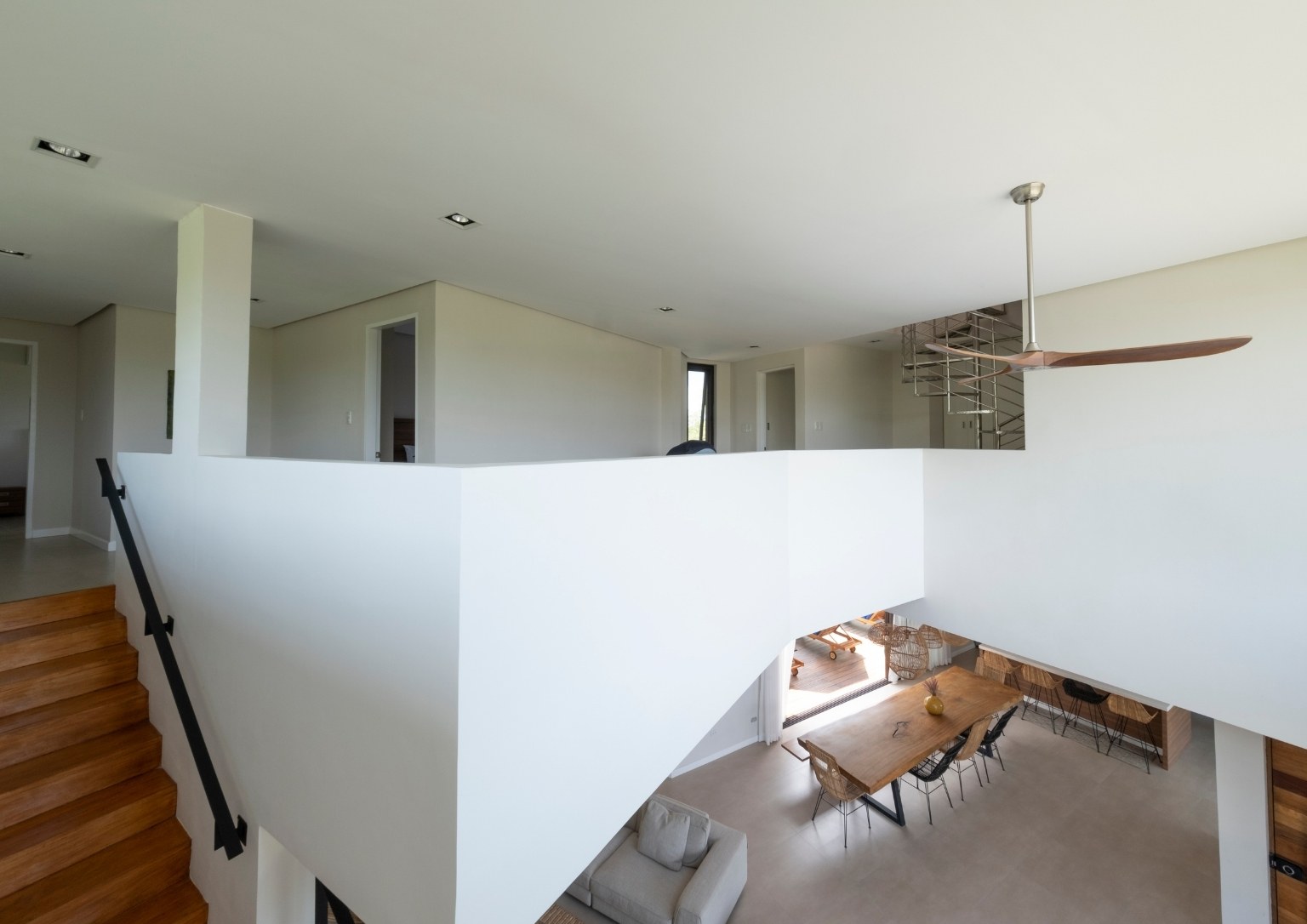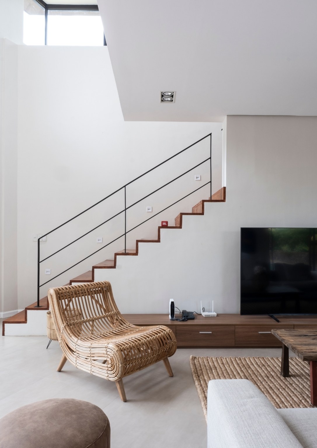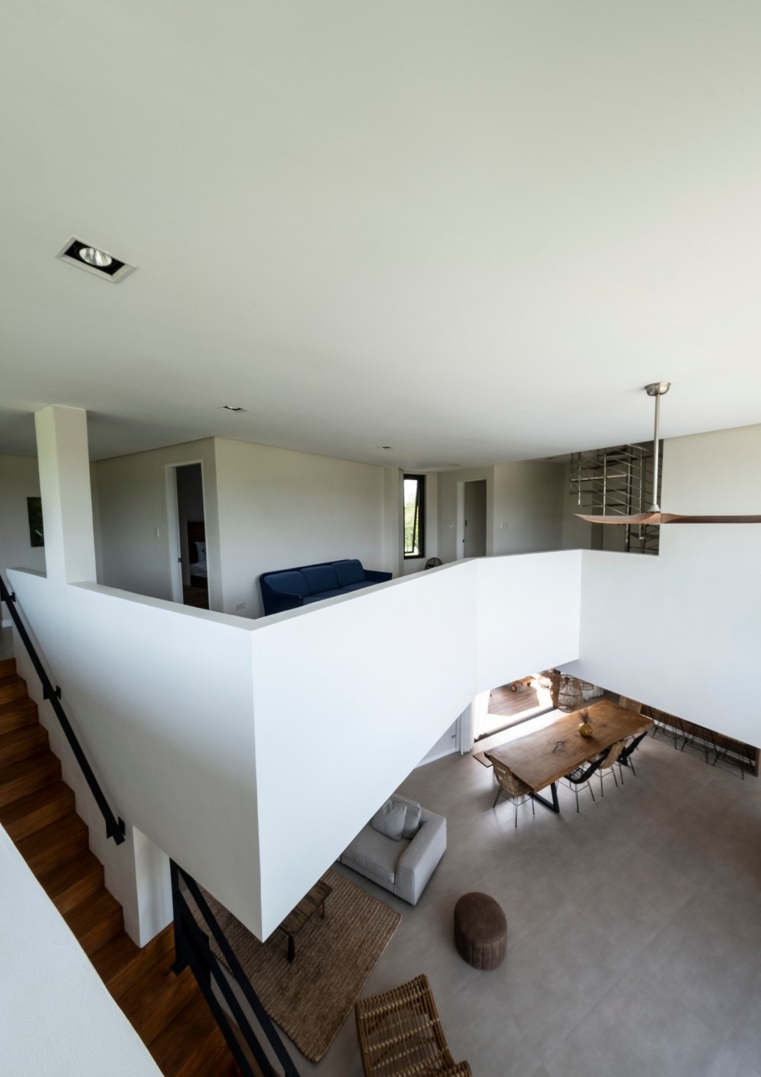 Meanwhile, the upper ground floor hosts the main entrance to the house, with its massive, bespoke wooden door. It opens to the indoor space which features double-height ceilings, big windows, angular interiors, and an open layout. The kitchen, dining area, and living room are all interconnected. The minimalist interior design also allows the staircase to the second level to serve as the area’s stand-out structure. Also, the upper ground floor is where the backyard and the pool are located. Nearby are the storage area, bathroom, and spare room that can be converted as a makeshift office. In addition, a staircase hidden behind a wall connects the lower and upper ground floors.