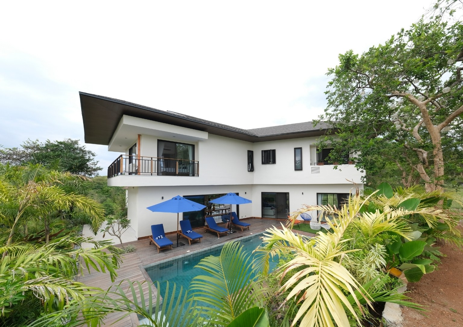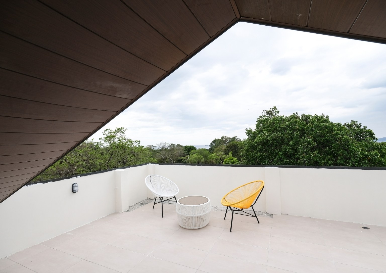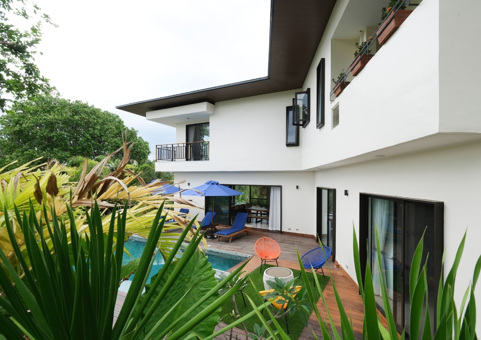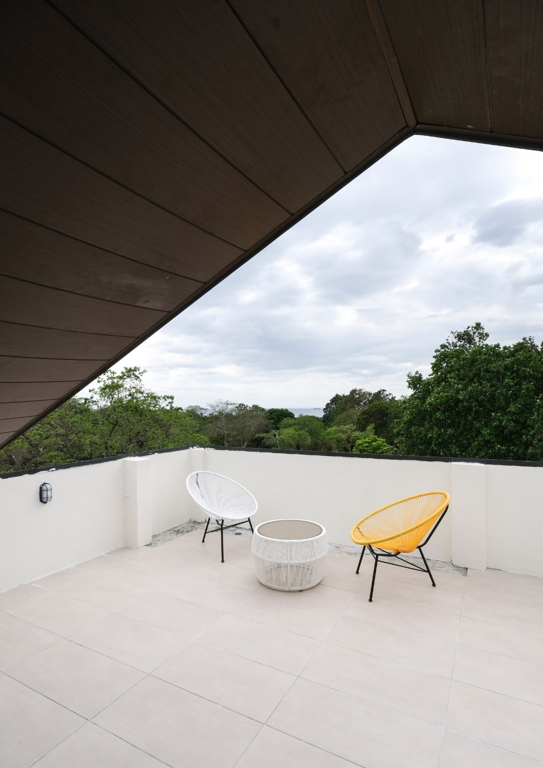 The second floor also has three bedrooms: a main guest room with a private balcony with sea and pool view; a smaller bedroom with a sea and pool view; and the master bedroom, which has an outdoor terrace that boasts of a 180-degree panoramic view of the property. Outside the master bedroom is a metal staircase that leads to the roof deck. It has a small room but is complete with a bathroom. Also, its private terrace treats guests with stunning views of Subic Bay and the mountain ranges of Bataan.
