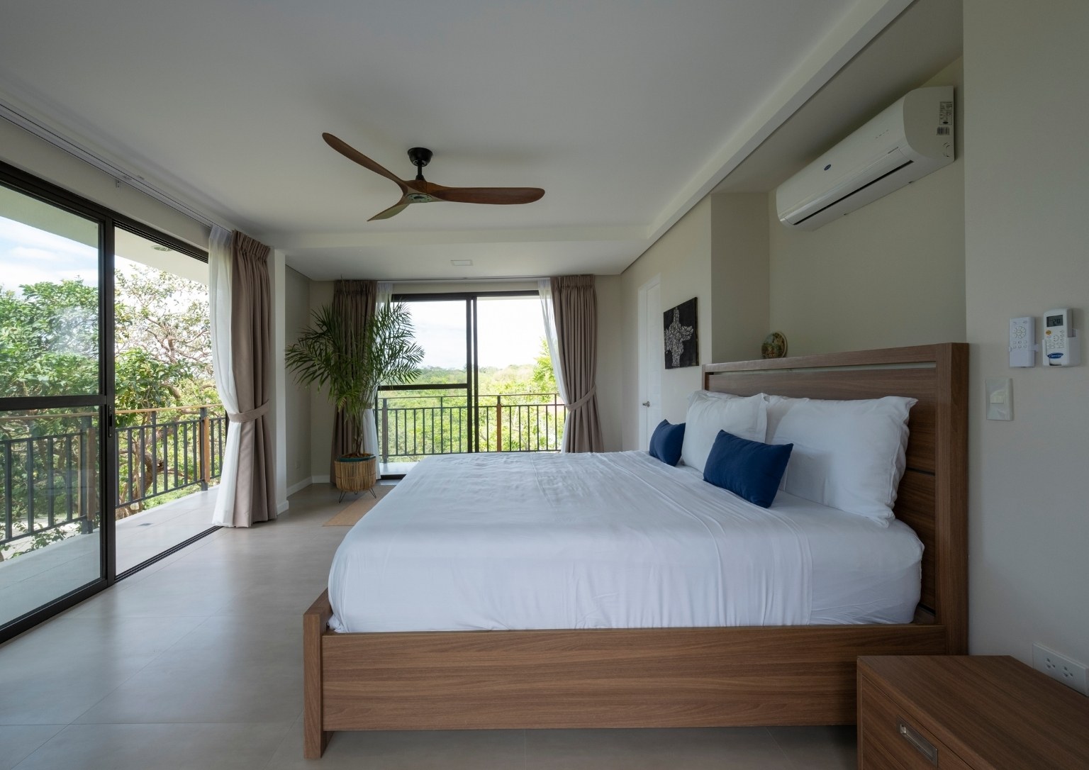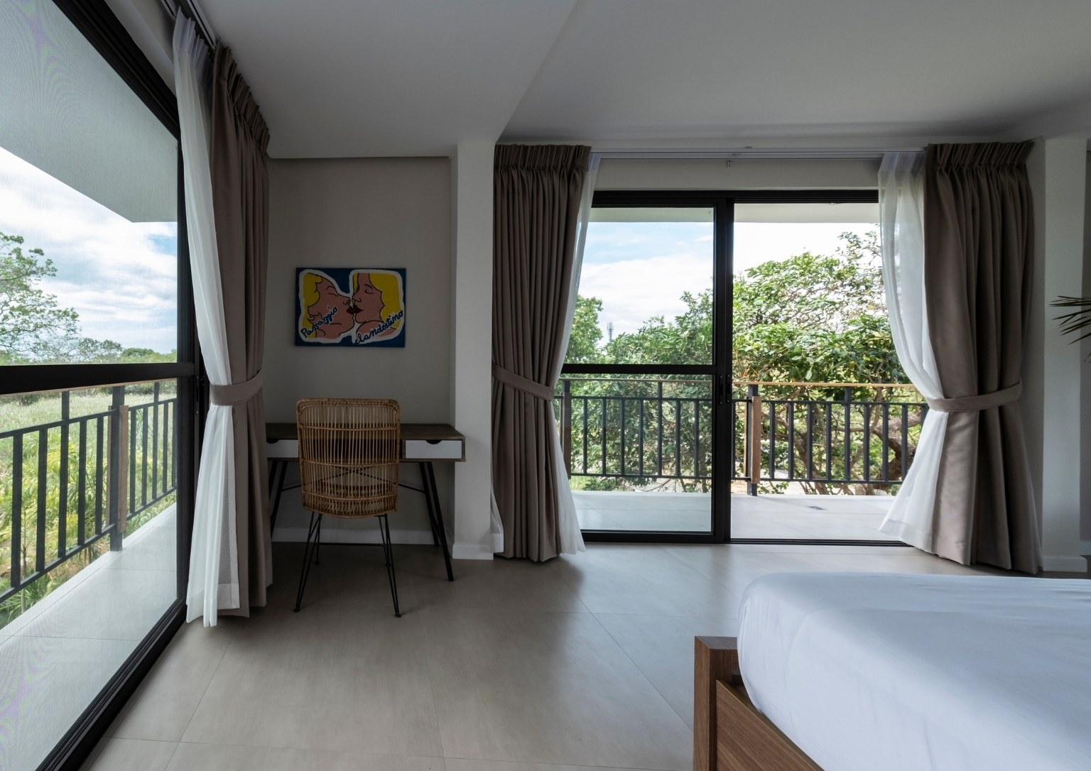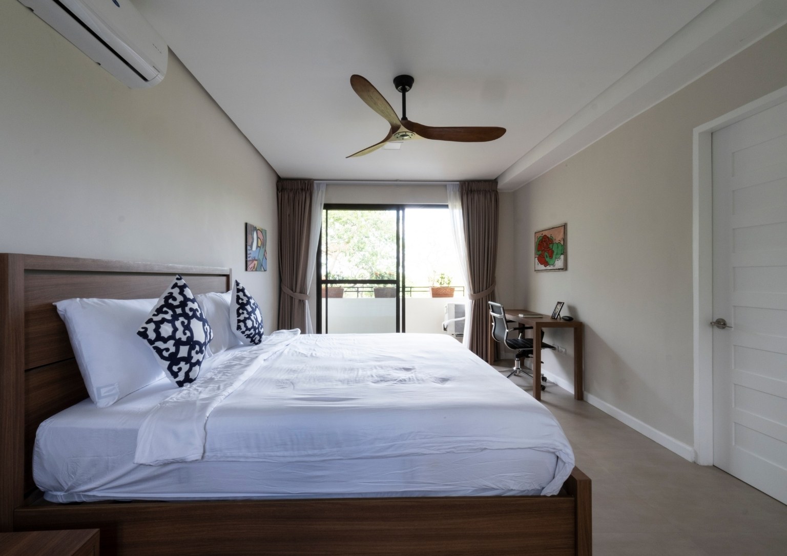 The second floor also has three bedrooms: a main guest room with a private balcony with sea and pool view; a smaller bedroom with a sea and pool view; and the master bedroom, which has an outdoor terrace that boasts of a 180-degree panoramic view of the property. Outside the master bedroom is a metal staircase that leads to the roof deck. It has a small room but is complete with a bathroom. Also, its private terrace treats guests with stunning views of Subic Bay and the mountain ranges of Bataan.
