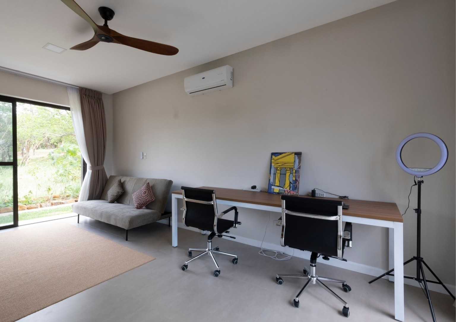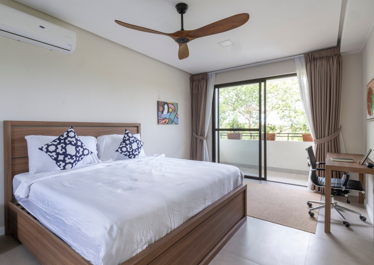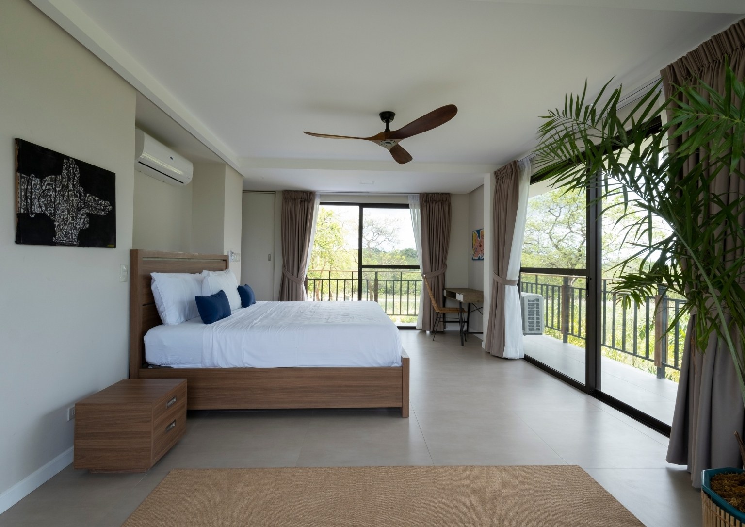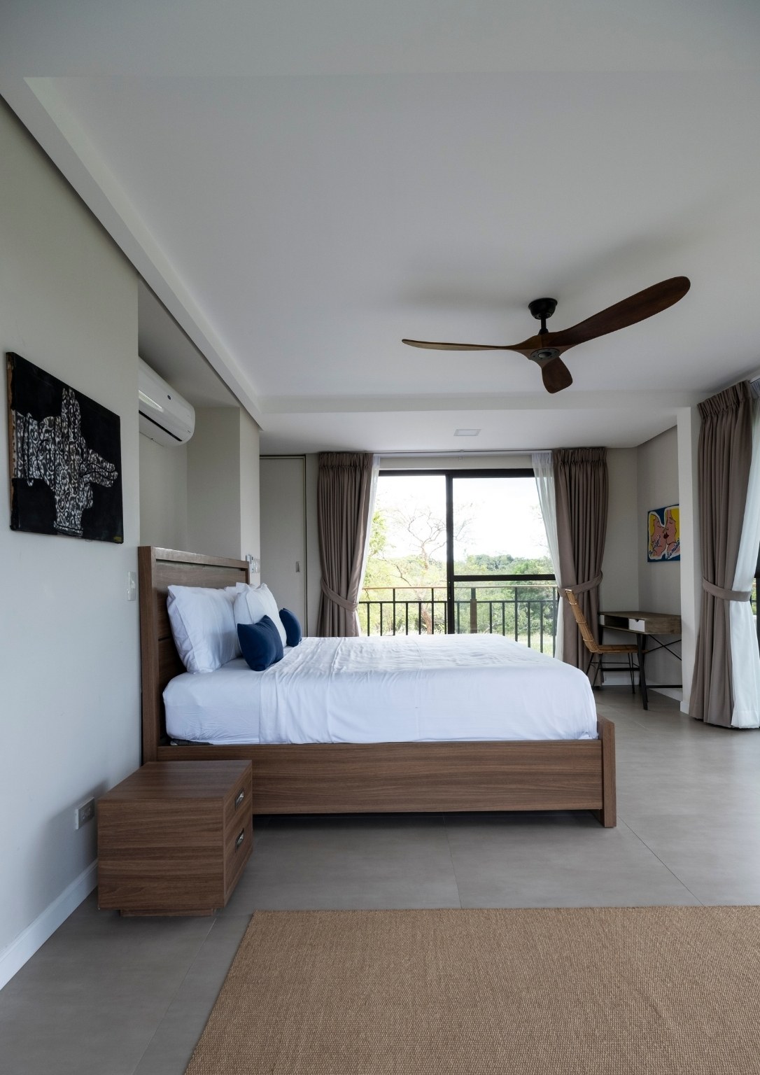 The second floor also has three bedrooms: a main guest room with a private balcony with sea and pool view; a smaller bedroom with a sea and pool view; and the master bedroom, which has an outdoor terrace that boasts of a 180-degree panoramic view of the property. Outside the master bedroom is a metal staircase that leads to the roof deck. It has a small room but is complete with a bathroom. Also, its private terrace treats guests with stunning views of Subic Bay and the mountain ranges of Bataan.