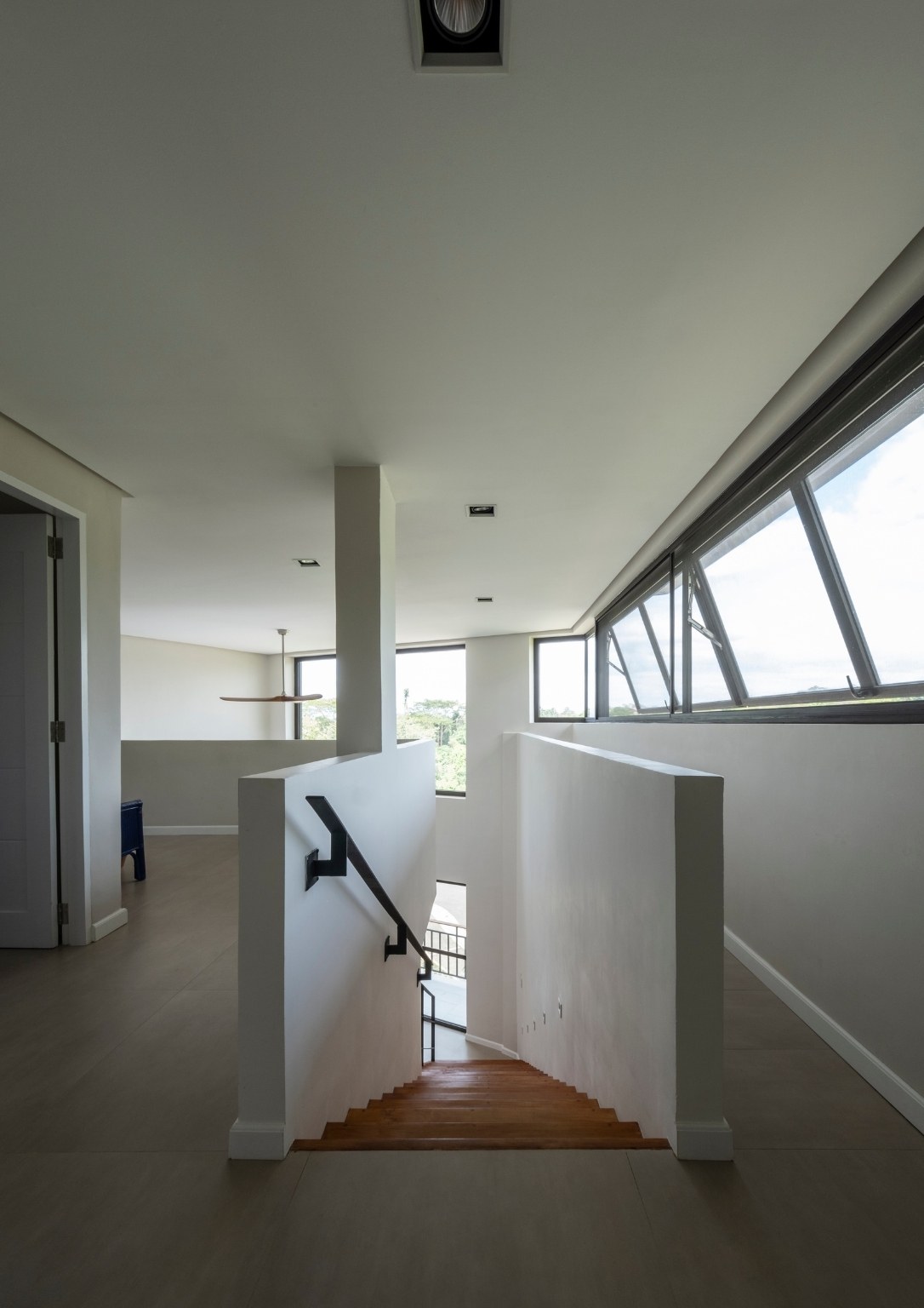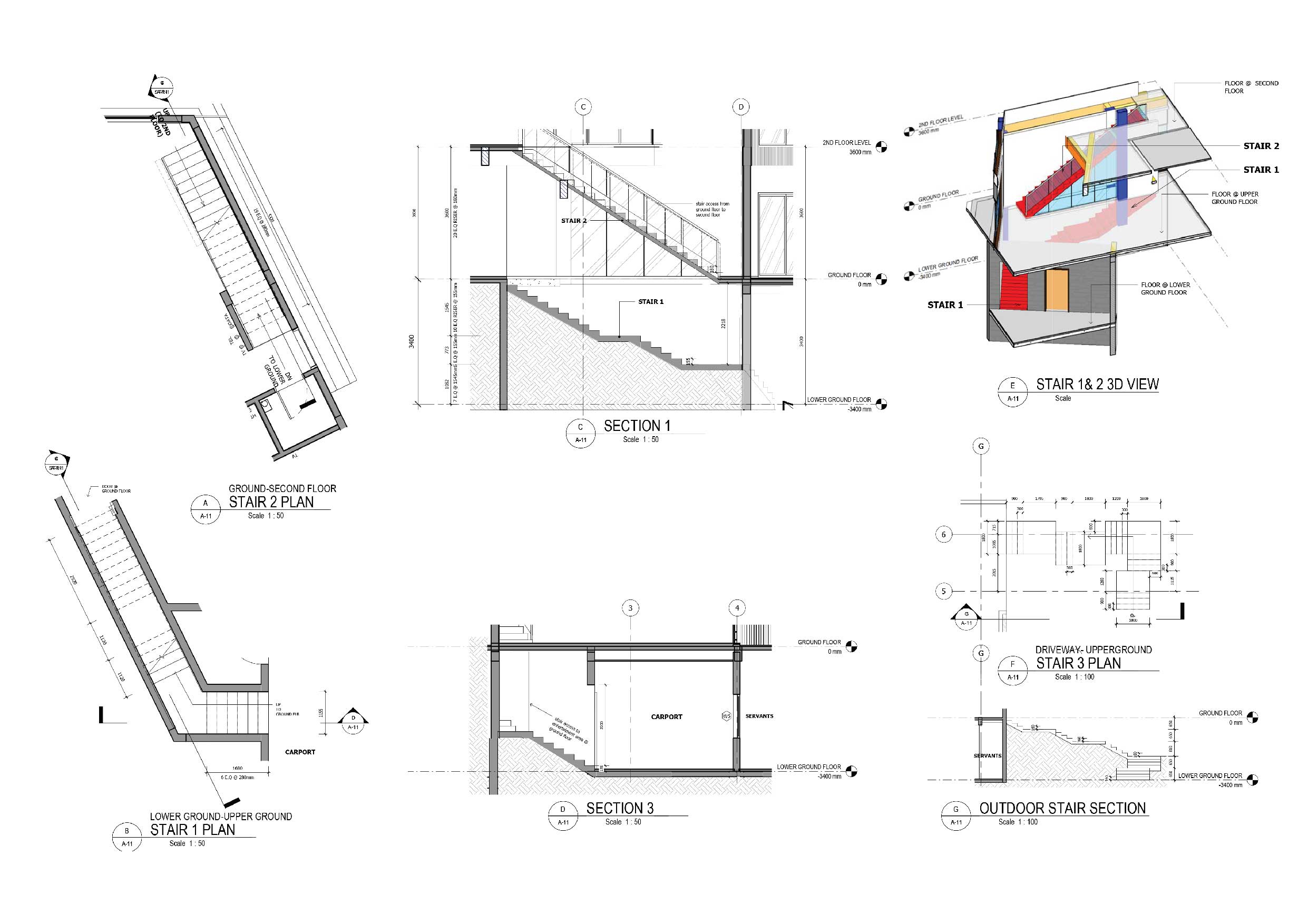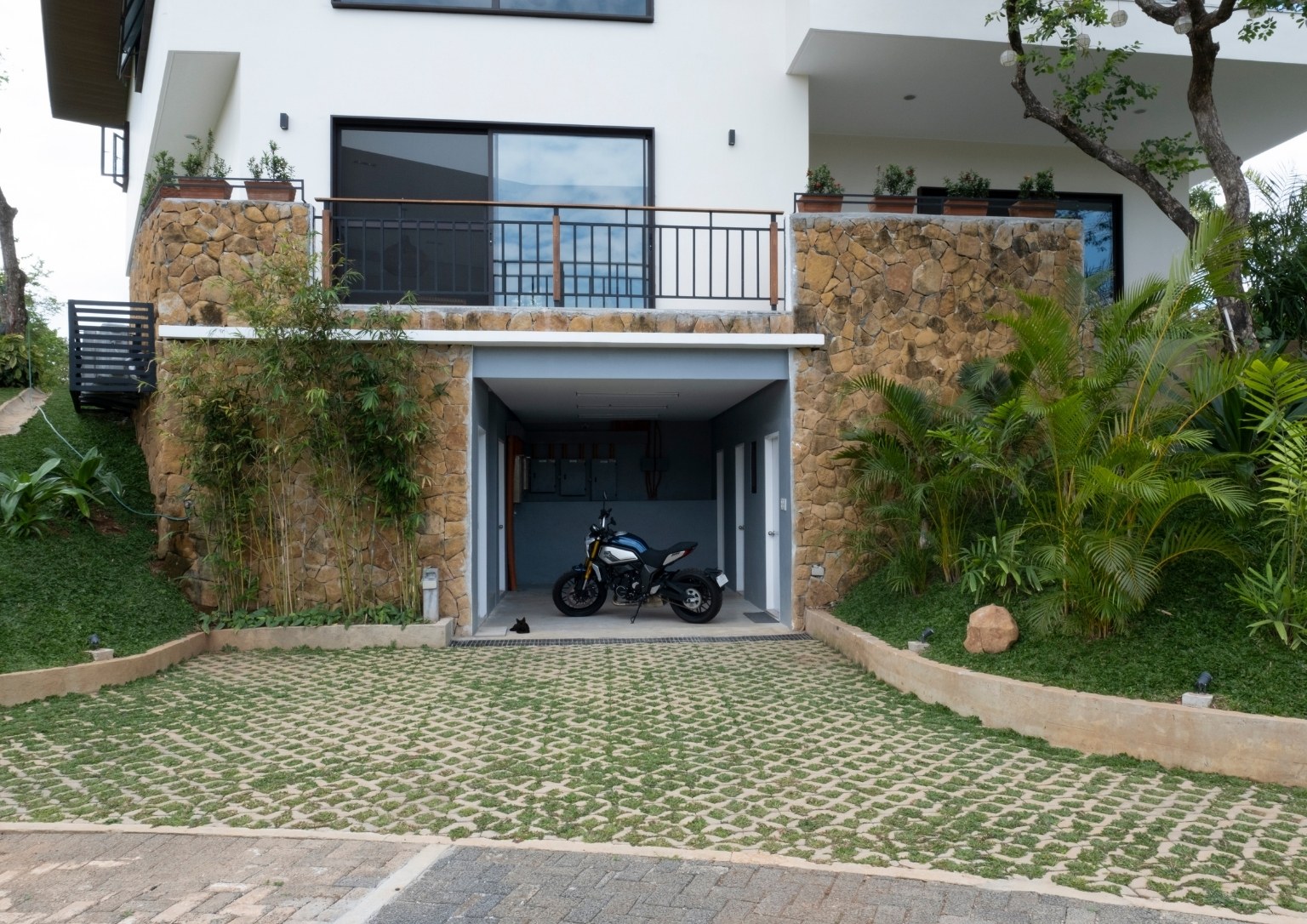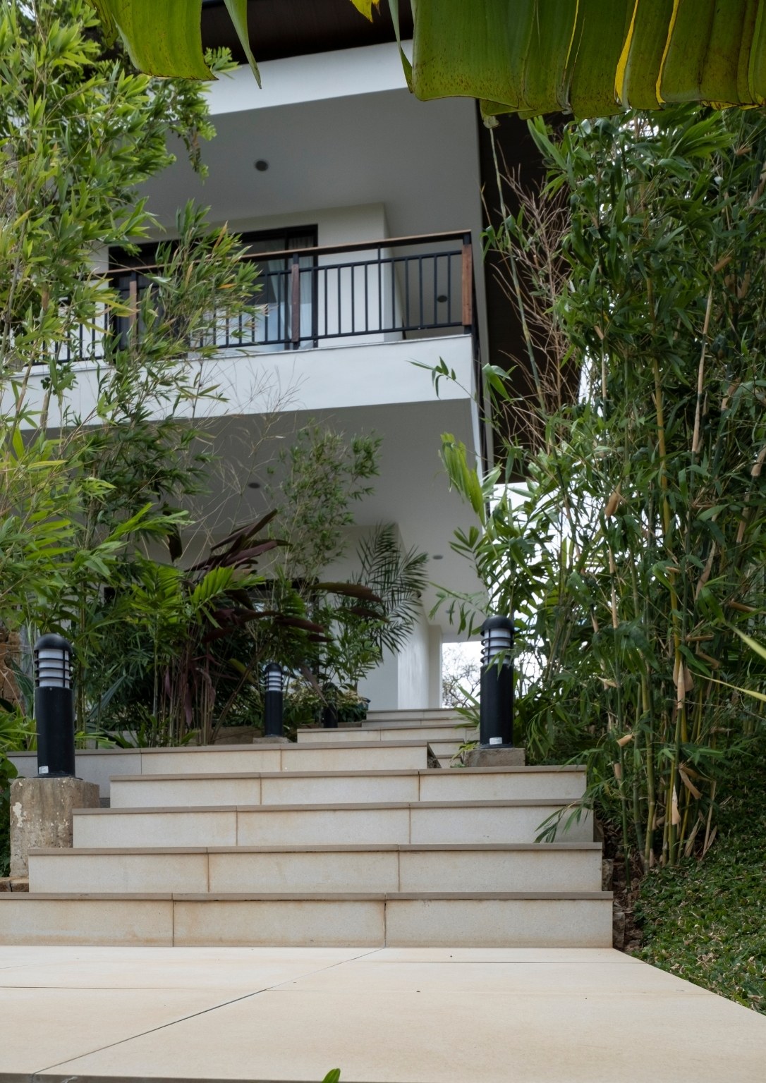 The lower ground floor of the 397.15 sqm house contains the garage and utility spaces (pump room, electrical panels, and laundry area. The maid’s quarter on this level also has its own bedroom, bathroom, and kitchen/pantry. Indoor stairs and a landscaped outdoor staircase from this level provide access to the upper ground floor. The outdoor stairs were designed to connect the outdoors with the indoors through a natural tunnel made of vegetation.