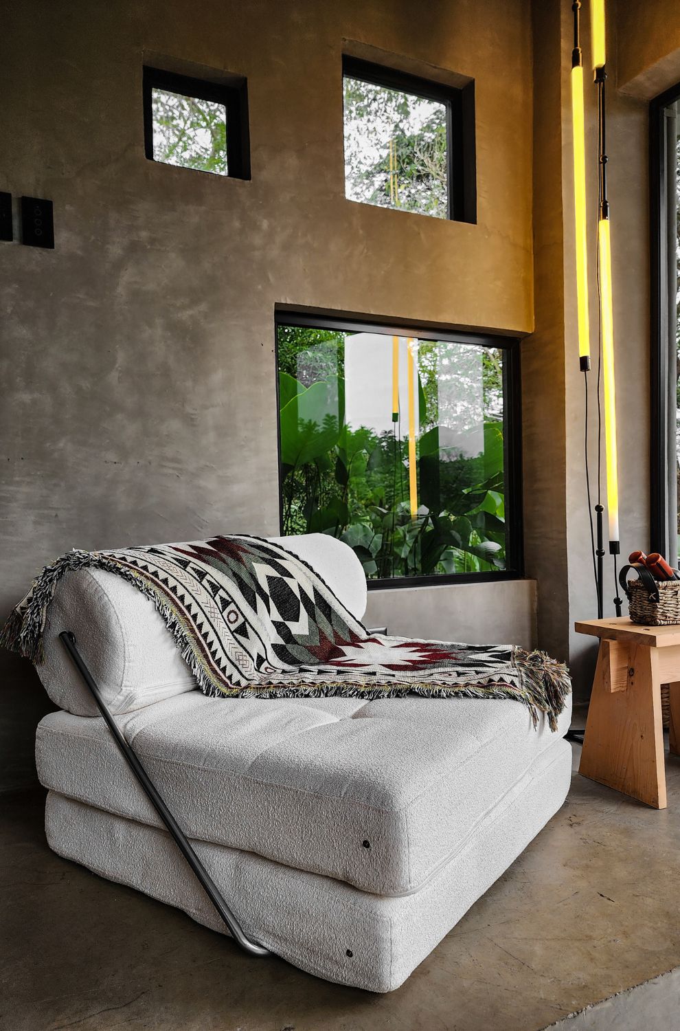 A sculptural concrete statement greets visitors from the street. Built on a sloping lot, the home’s dynamic protrusions cantilever above the ground floor, minimizing its footprint while maximizing living space. Recessed windows within concrete frames shade the interior and combat heat gain. The architect emphasizes: “I like to put the feature of big windows… you don’t get the hot interior.”