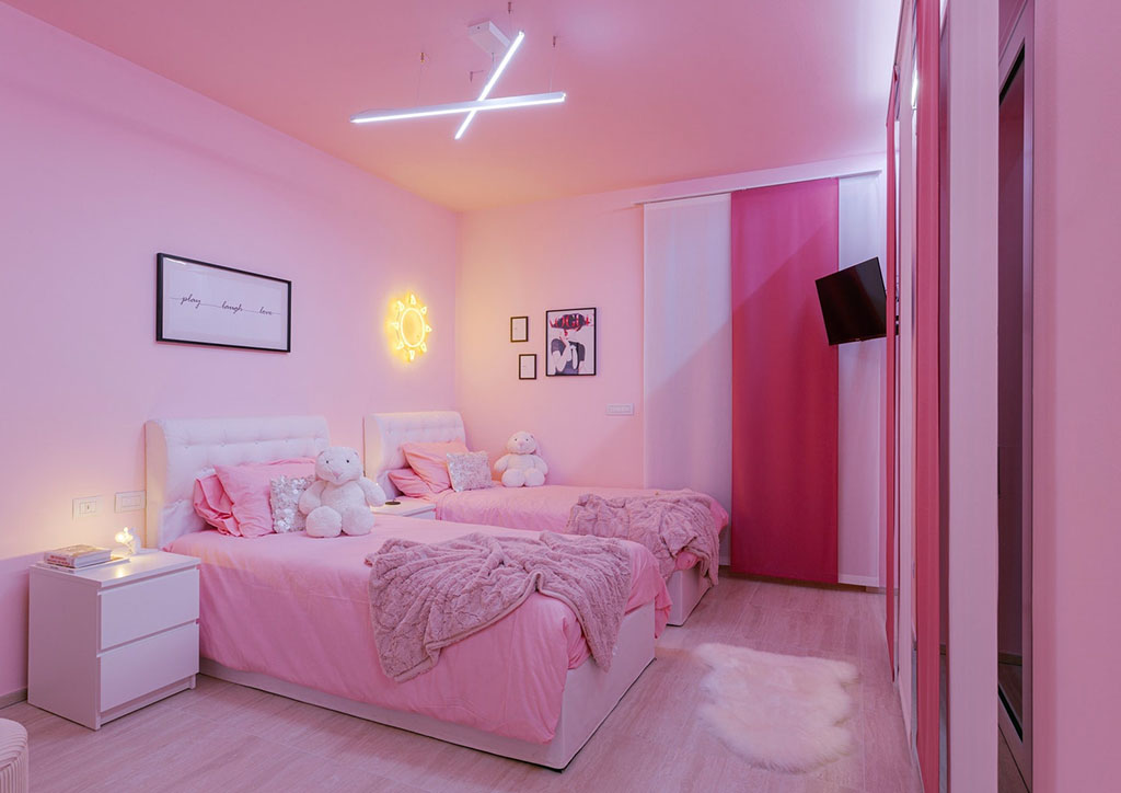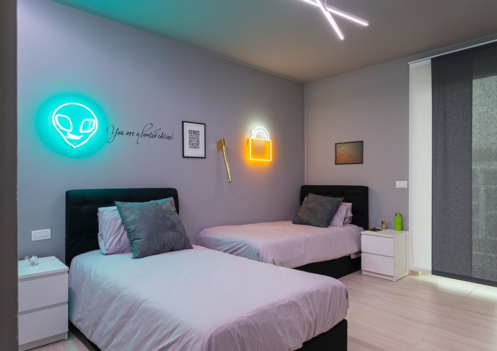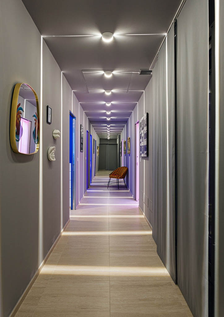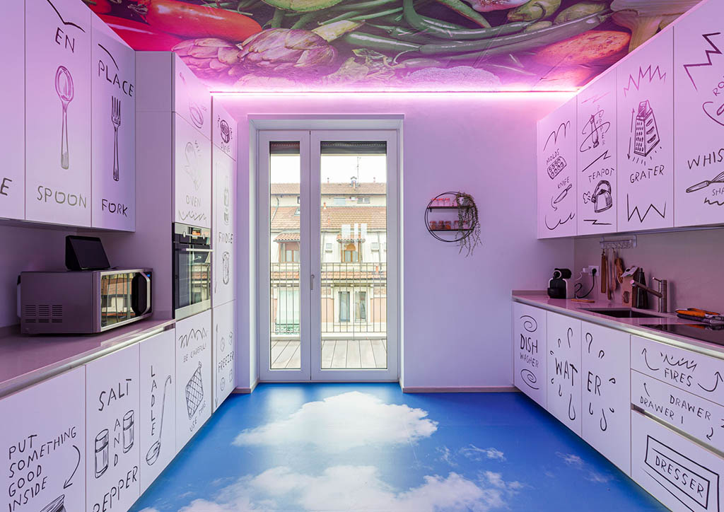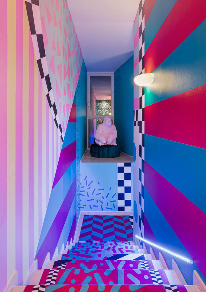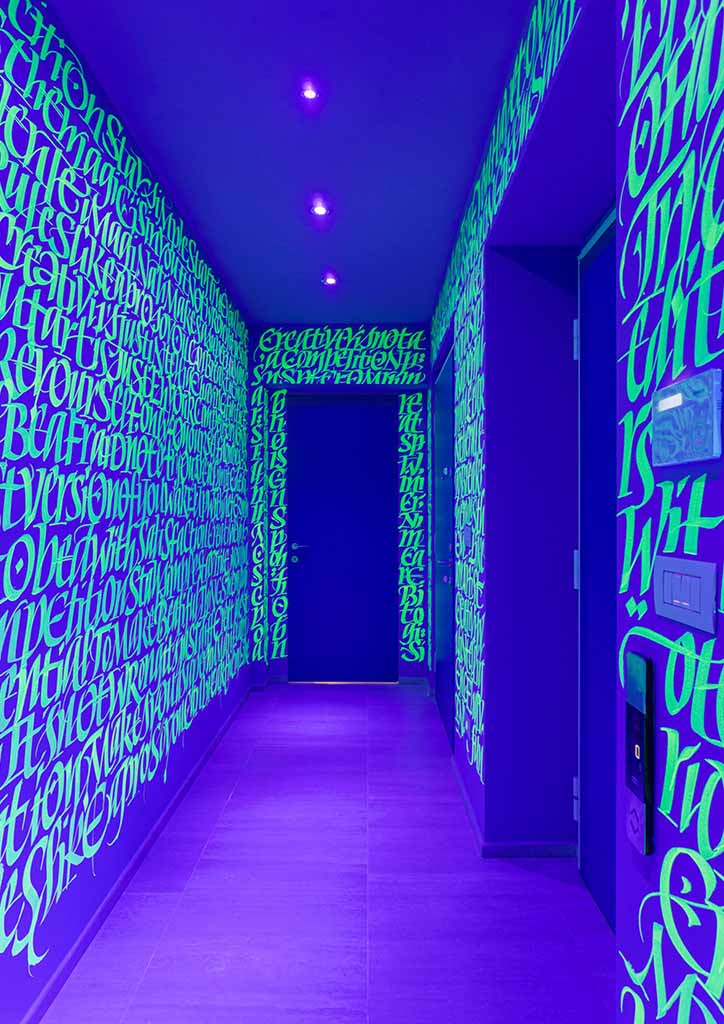 The areas of the house are connected with eccentric linkages, from cloud-print floors to glow-in-the-dark walls. While one hallway is back painted in neon purple animated by photoluminescent scribbles of world-renowned Italian calligrapher Luca Barcellona, another walkway leading to the kitchen is rendered straight from a distorted chessboard. The stairways, on the other hand, is a splash of juxtaposed patterns ranging from stripes to polka dots, furnished with vibrant neon lights – a prevalent fil rouge in the whole house.