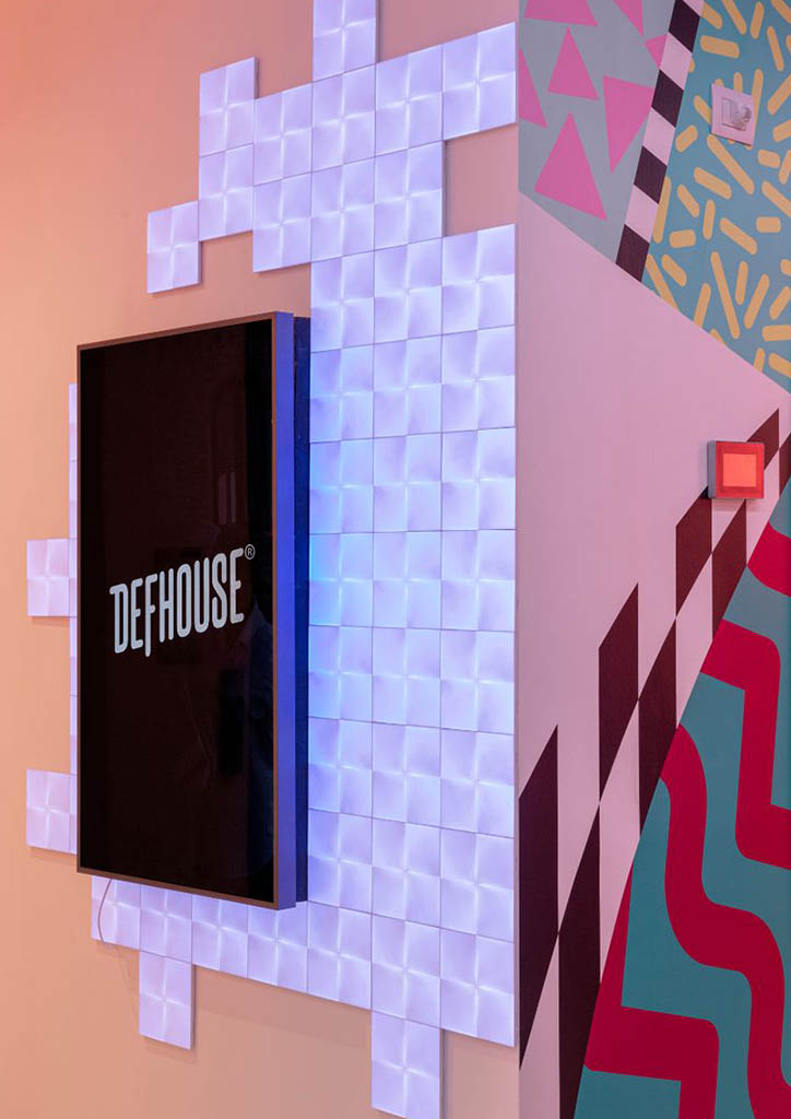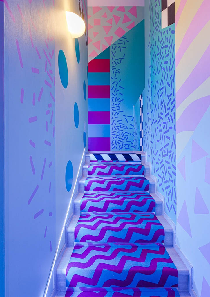 The youthful interior of Defhouse is prompted by the WSC art director John Pentassuglia aided by the technical support of Milan-based studio Tresoldi & Architetti. Envisioned with a strong fusion of luxury and pop aesthetics, the house is inspired by significant artistic movements from the past like Alchimia and Memphis from the 80’s mixed with the vibes of Miami Beach art deco. From vivid geometric patterns, non-trivial graphics to fluorescent colors ubiquitous around, Defhouse becomes a post-modern visual stimulus perfect for curated posts on social media.