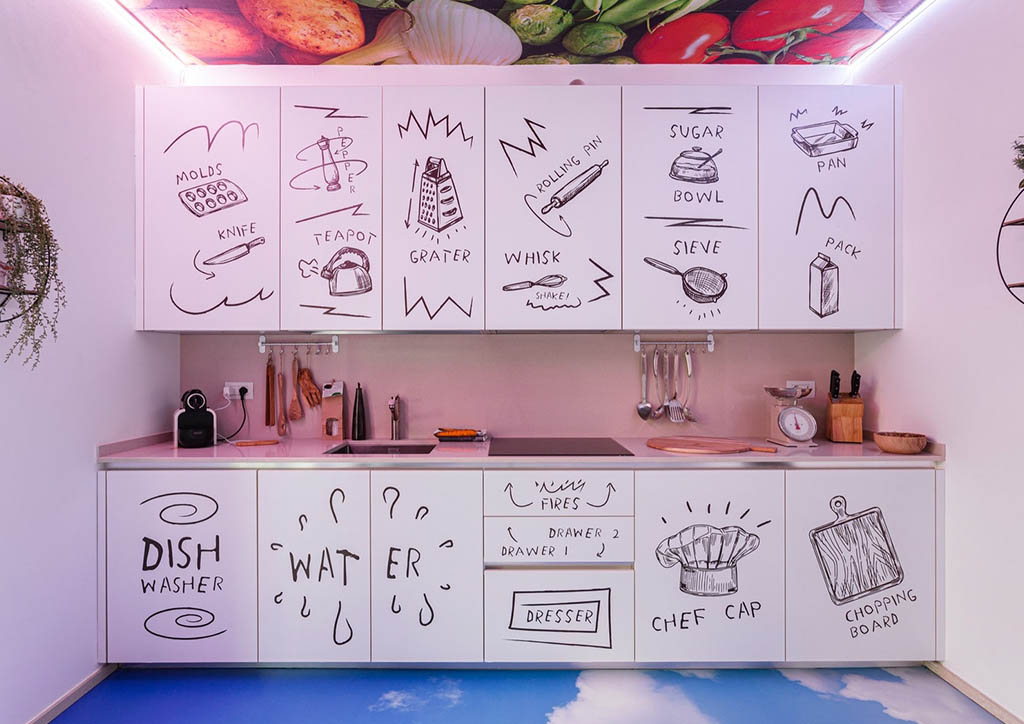 Clouds on the laminated floor can be found again in the kitchen, and as you look above, the ceiling flaunts its eye-catching feature of printed vegetables. While they keep themselves busy on cooking, tenants are given ease as the white storage cabinets are playfully decorated with doodles indicating the placement of cooking utensils and ingredients.