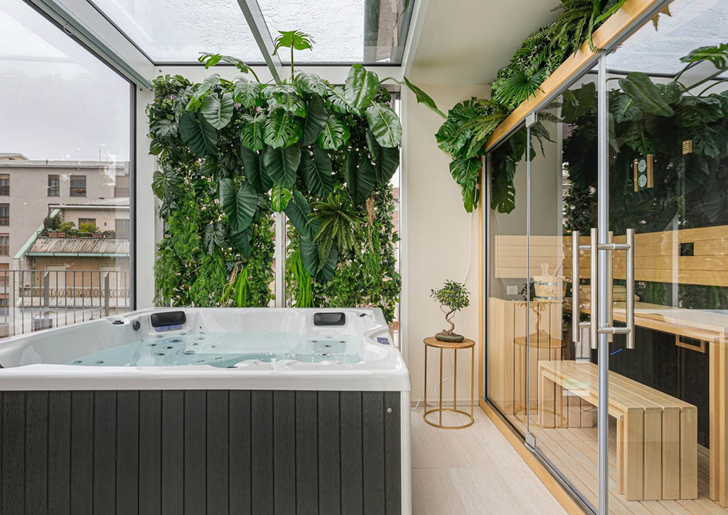 On the opposite side of the living area is the outdoor terrace accessible by glazed doors where inhabitants can relax in the hydromassage tub and jacuzzi and enjoy a generous space for gathering.