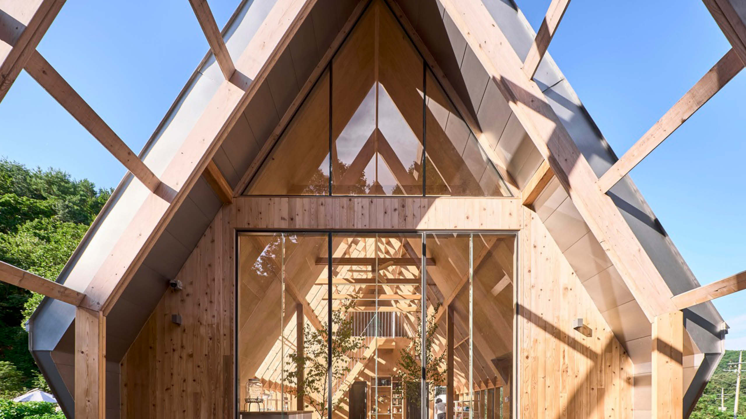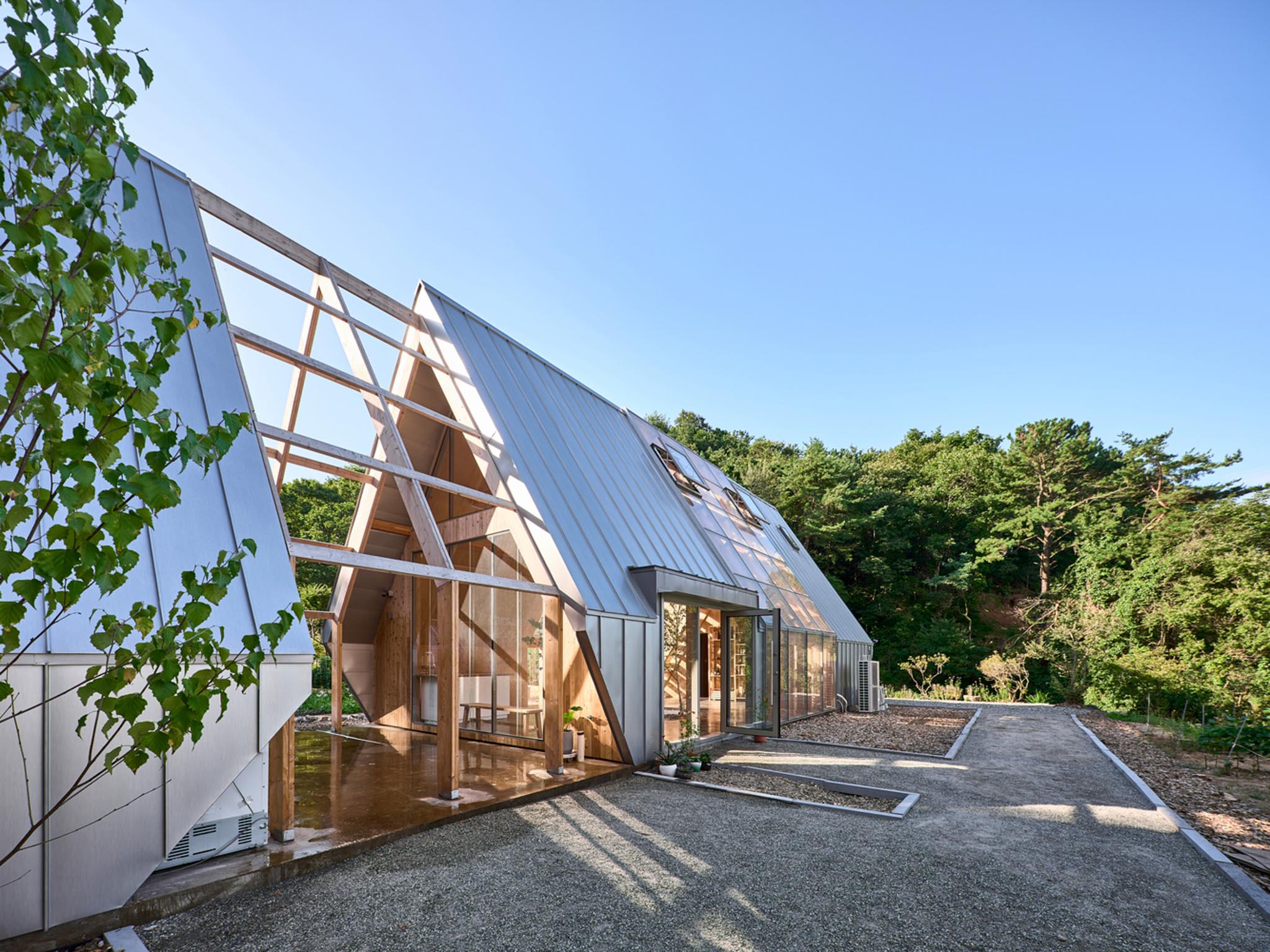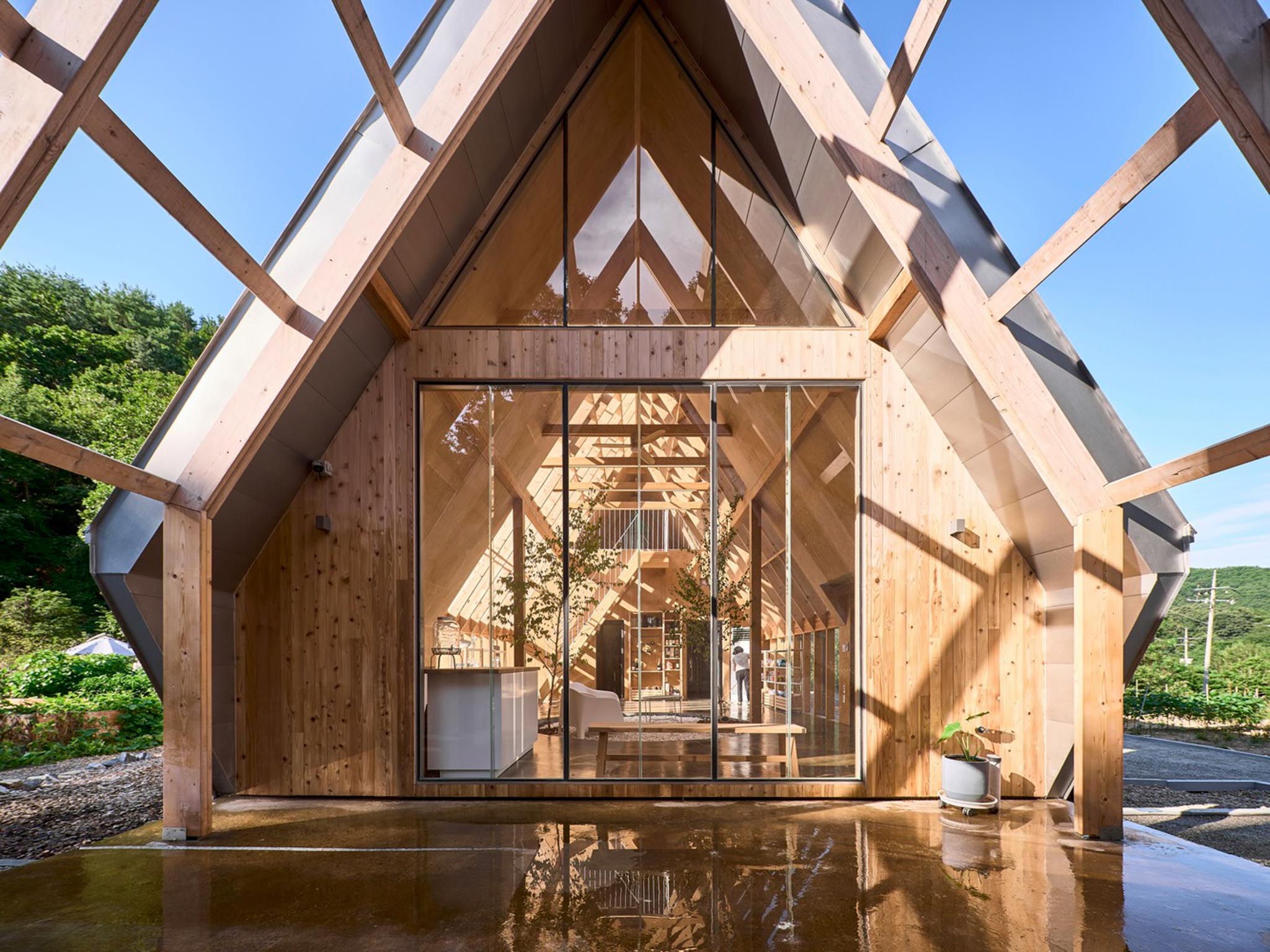 This farm in Mangmi Village, Yangpyeong, South Korea is in a valley surrounded by three mountains. Set within the deep mountains, it’s a peaceful place that’s perfect as a getaway from the noisy city. The project is an extension of the forest around it. This same forest has been rooted in the site for so long that trees and their branches contain memories of the past. The project was commissioned by a retired couple who have been living there growing fruit trees. Soon, they asked for a community facility and a glasshouse along with a campsite.