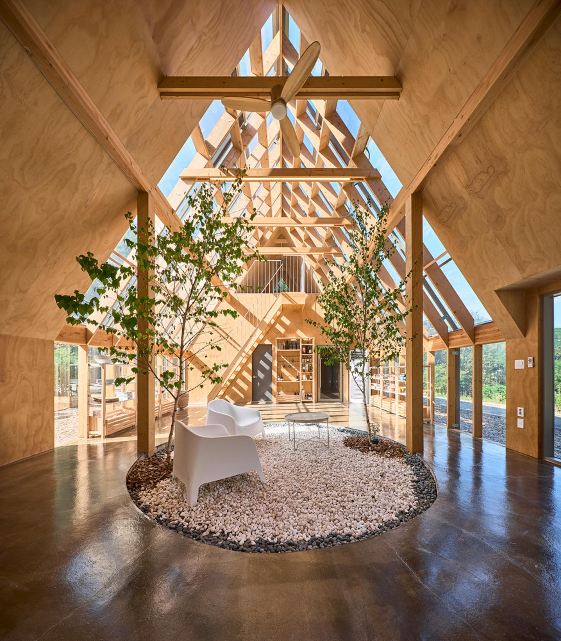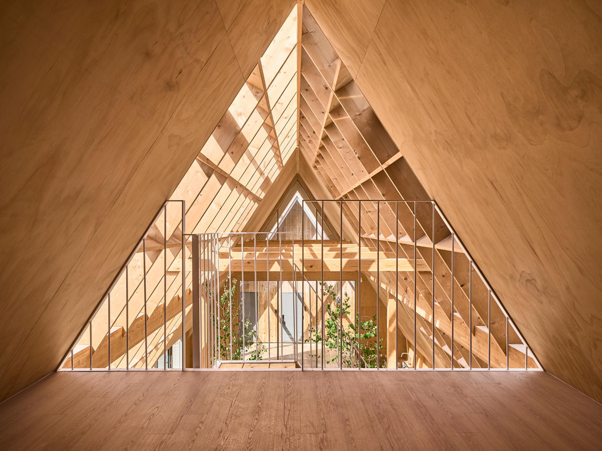 Wood materials dominate the Mangmi Farmhouse to capture the same warmth their texture brings. These include the exterior and interior walls, the roof structure, the floor finish, and even the stair treads. Installed at 400mm into the roof, there are spruce wood studs that also act as structural elements, louvers, and other architectural elements. The pine tree plywood for the interior finishes meanwhile has knots and a bright tone that gives a natural look when combined with the spruce rafters.