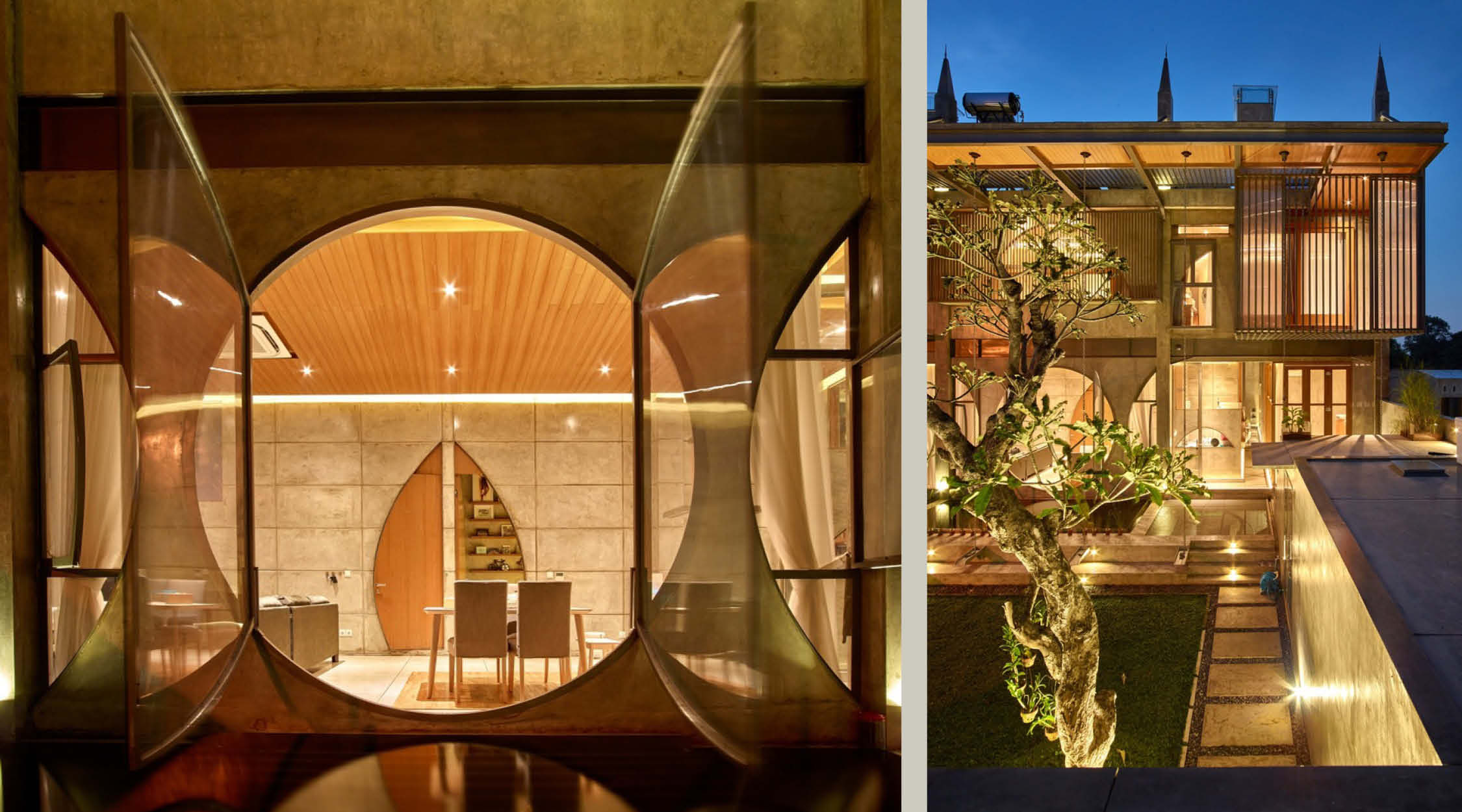 The founder and principal of Raw Architecture, Realrich Sjarief, designed a home, a library, and an architectural studio on a 250-square-meter lot in Jakarta, Indonesia. The multipurpose building, called The Guild, is heavily distinguished by concrete and geometrical forms as seen in the circular and arch-shaped windows. The property is tucked away behind a modest concrete fence in an Indonesian residential area, giving it an air of seclusion. From the street, the visible elevations present a harmony of windows overlooking the central courtyard.