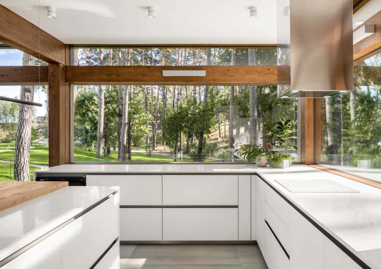 The double-height ceiling dining area fits between the lounge room and the kitchen. To add, a skylight is visible directly above the huge 10-person wood table. The kitchen cabinets are a mix of wood and white scheme that complement the white marbled countertop perfectly. Full glass windows serve as a backdrop and make the flora outside one with the space.