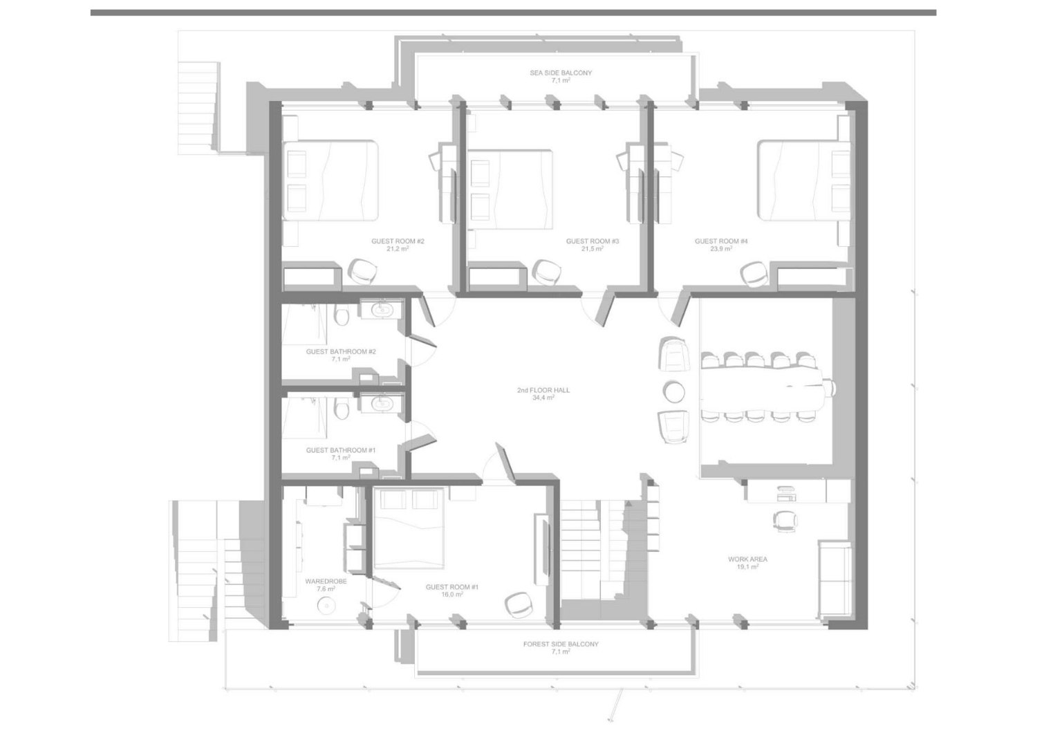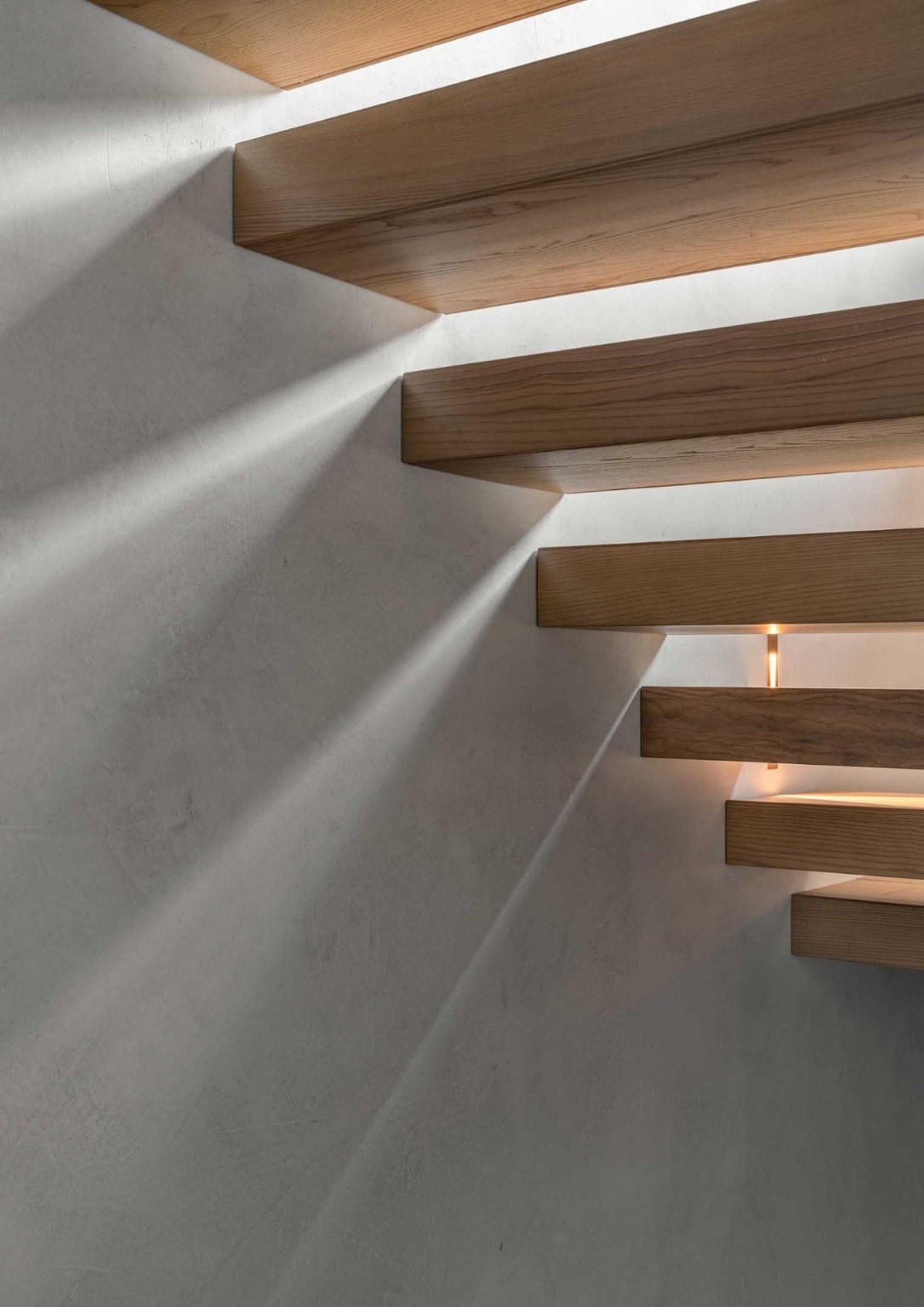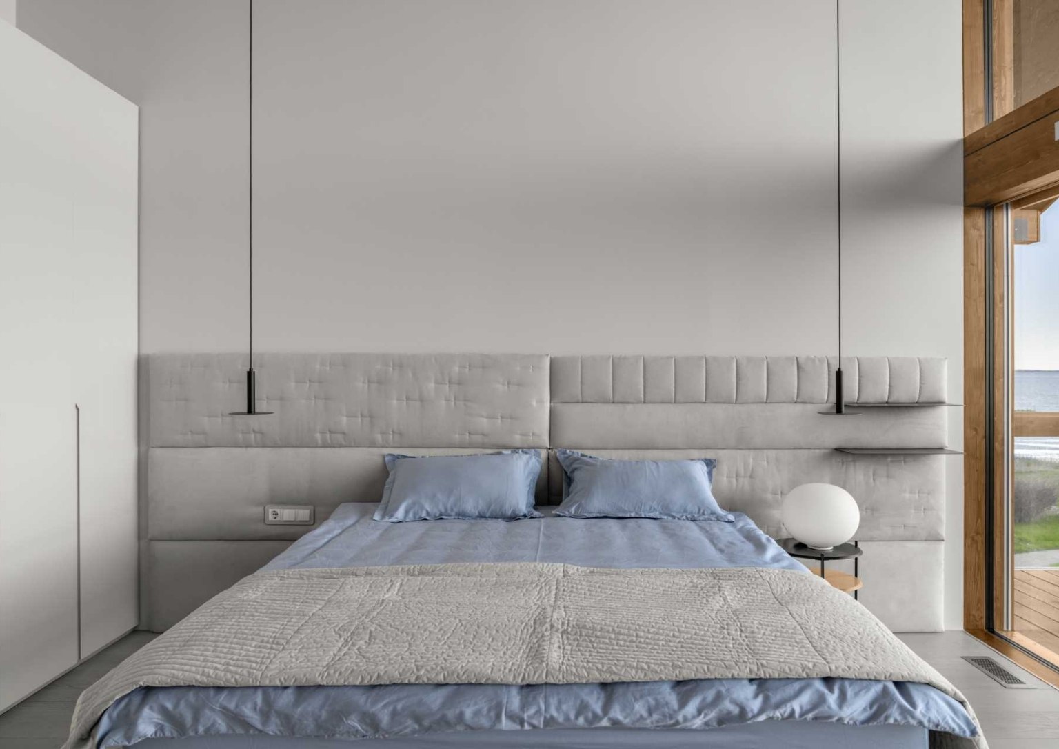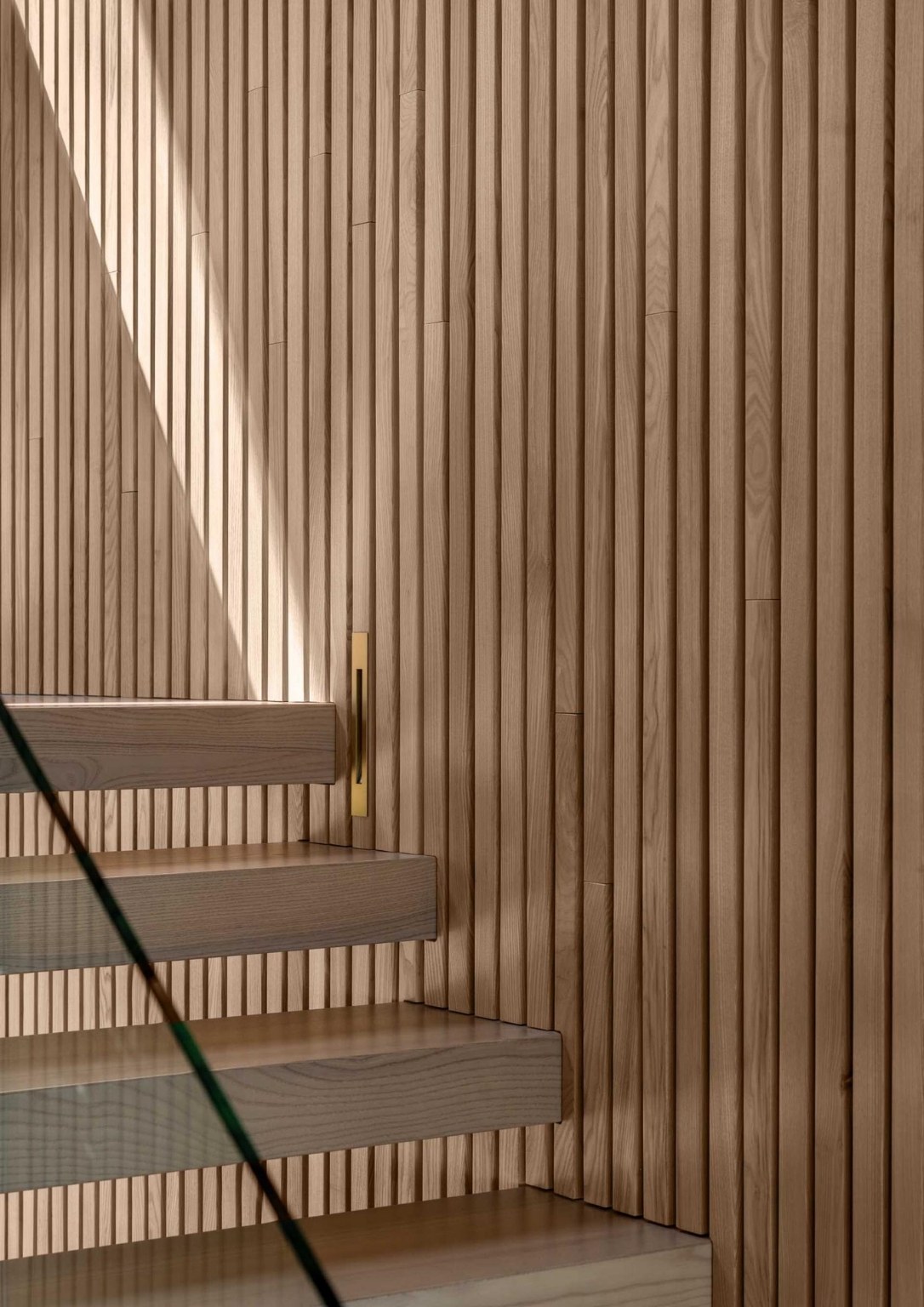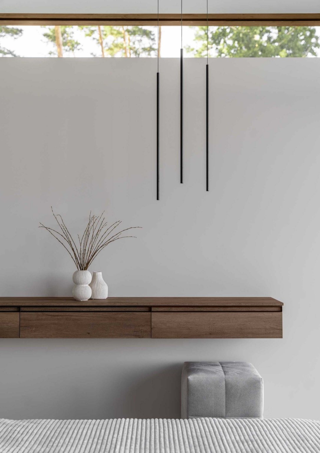 More vertical wood slats are present along the side of the wood stairs and this accent continues upon landing on the open seating area. The bedrooms on the second floor are all endowed with the same color scheme and wood accents. The lighting fixtures all throughout the house are all modern minimalist. It adds a sleek modern feel to each room.