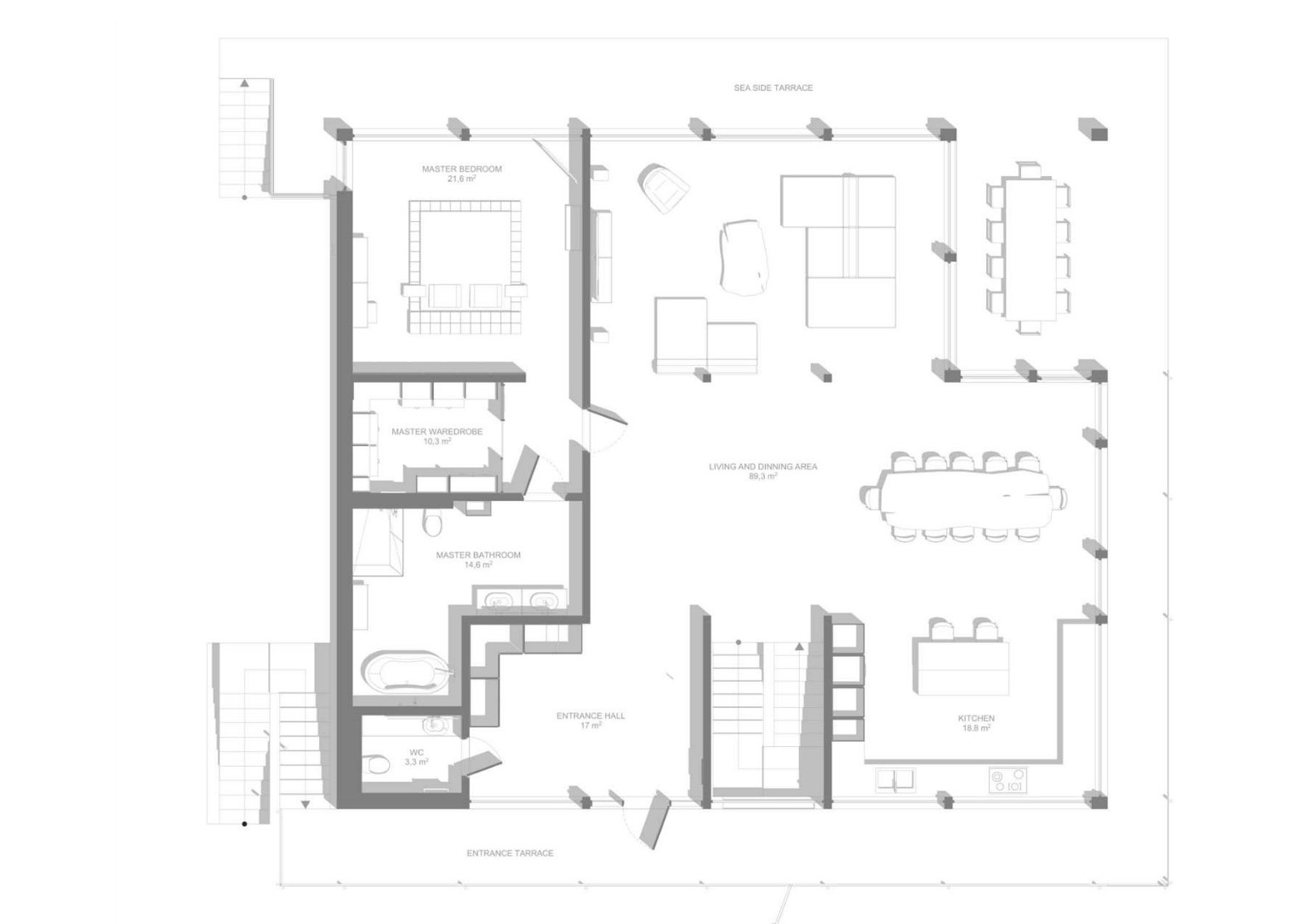 The main floor of this structure is open as with every house meant to cater to large gatherings. The living room, dining, and kitchen all share the same space. The floor-to-ceiling glazing ensures that all spaces are well lit. In the lounge area, an accent wall made of wood slats acts as a TV backdrop.