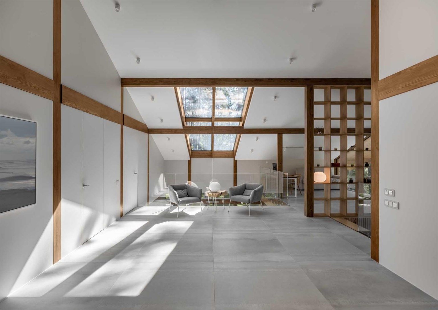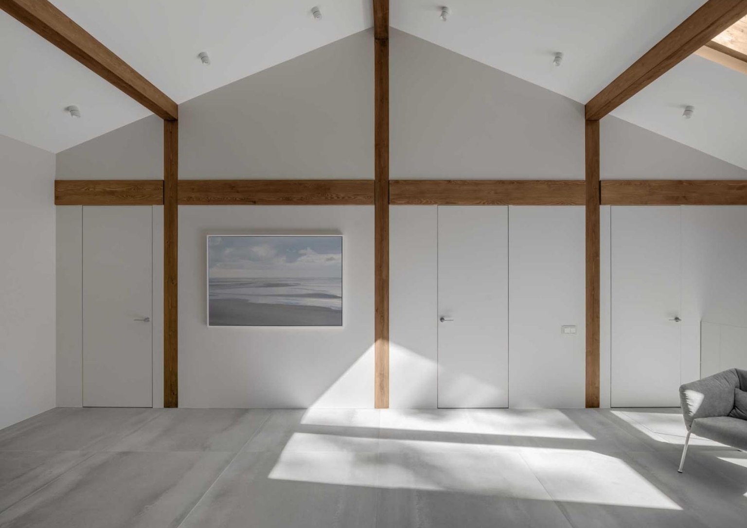Exposed oak-hued wood beams and posts are the dominant element inside the house. The design that seamlessly continues into every room creates a unanimous feel all throughout. The Scandinavian color palette of white, soft brown, and gray elegantly complements the wood accents.