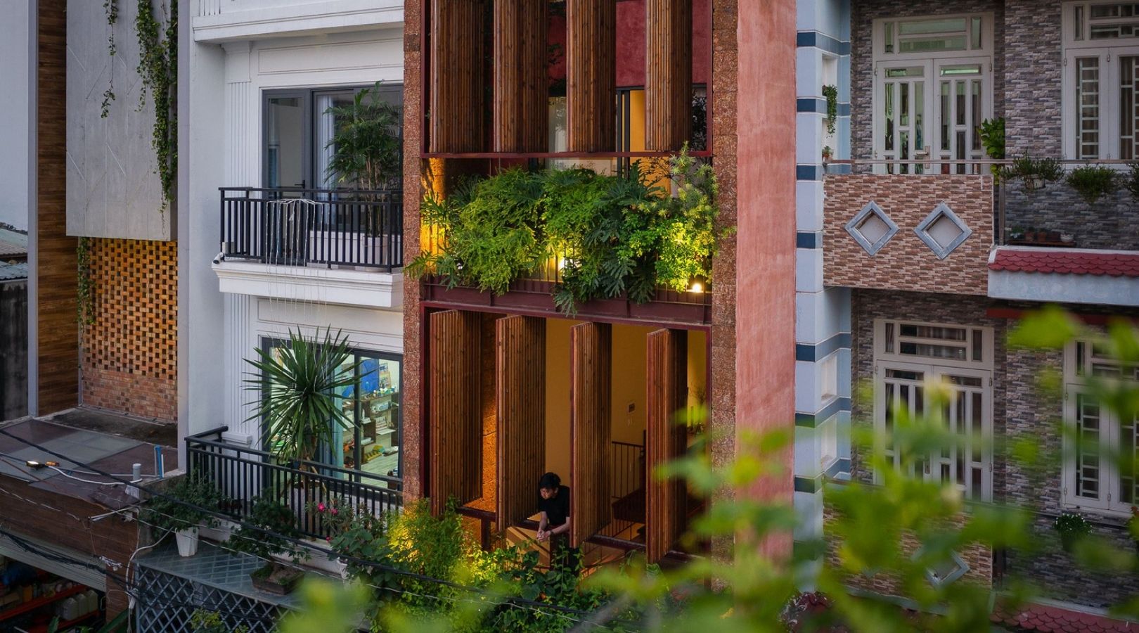 H House was built in this area. Created by AD9 Architects for a young couple, the house design was inspired by local houses in central Vietnam. The house facade boasts a revolving door system. It invites natural light to envelope the whole house. The 8 revolving doors also regulate outside environmental factors like dust, noise and uncertain weather.