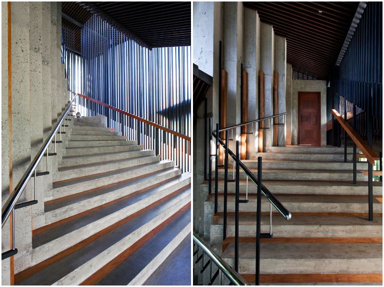 The lower floor is designated as a library but can easily serve a multitude of functions. It is a cool, calm, shady space. The metal slatted ceiling gives the impression of timber and endows the room with a sense of intimacy. A glazed gable end provides occupants a glimpse of sky. As in the dining hall, a robust acacia section from the same tree serves as a counter. Supported by a mirrored substructure, the hefty slab here seems to float weightlessly above the soothing glow of the wooden floor. The raw concrete backdrop lends the space with an almost primal sense of shelter while the vertical corrugations on the southwestern corner hint at the interstitial dynamics performed at the stairs outside.