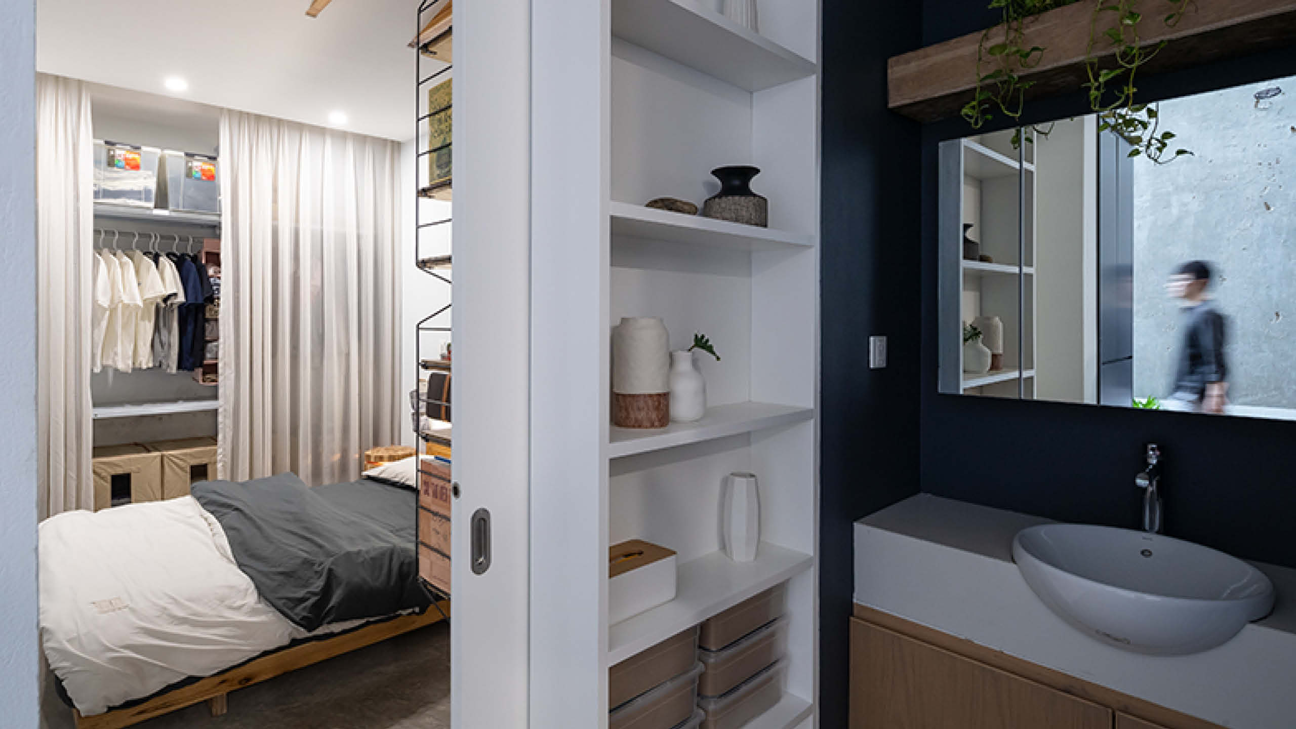 The home has two floors–the ground floor where the bedroom, bathroom, kitchen, and entry corridor that serves as the buffer space between the other houses are situated, and the second floor where the workspace, laundry area, and rooftop are found. These two levels are connected by perforated metal stairs that allow light to flood into the kitchen during the day.