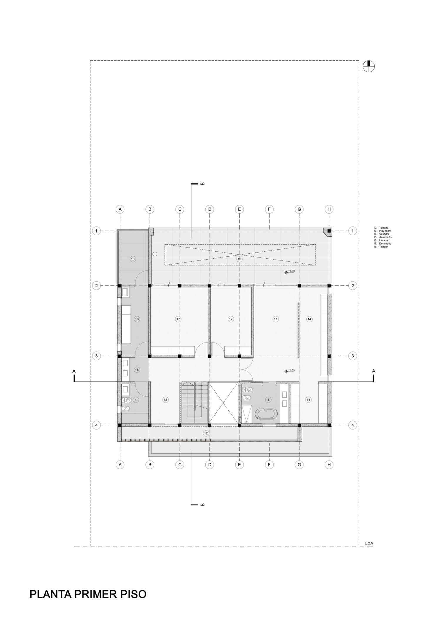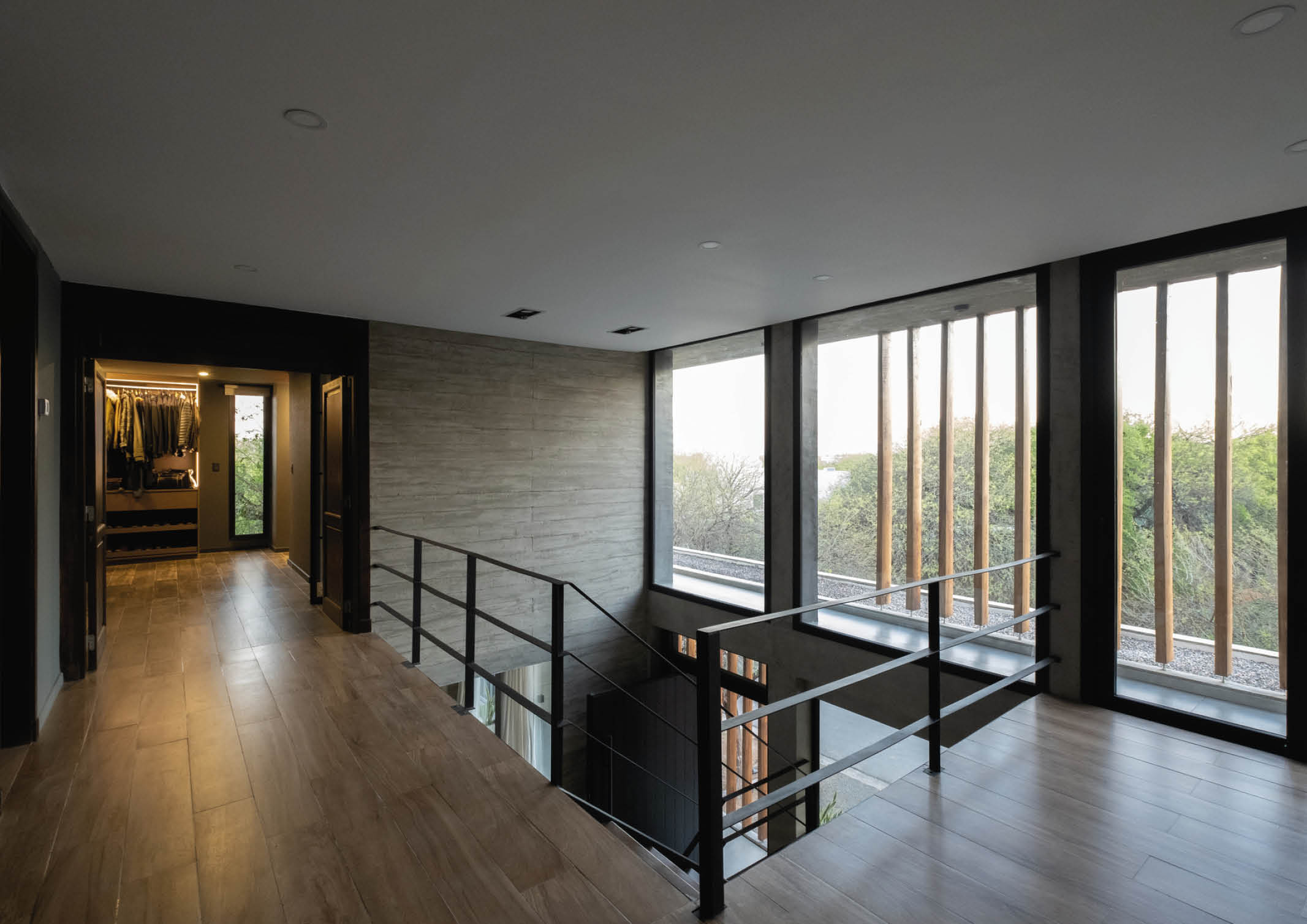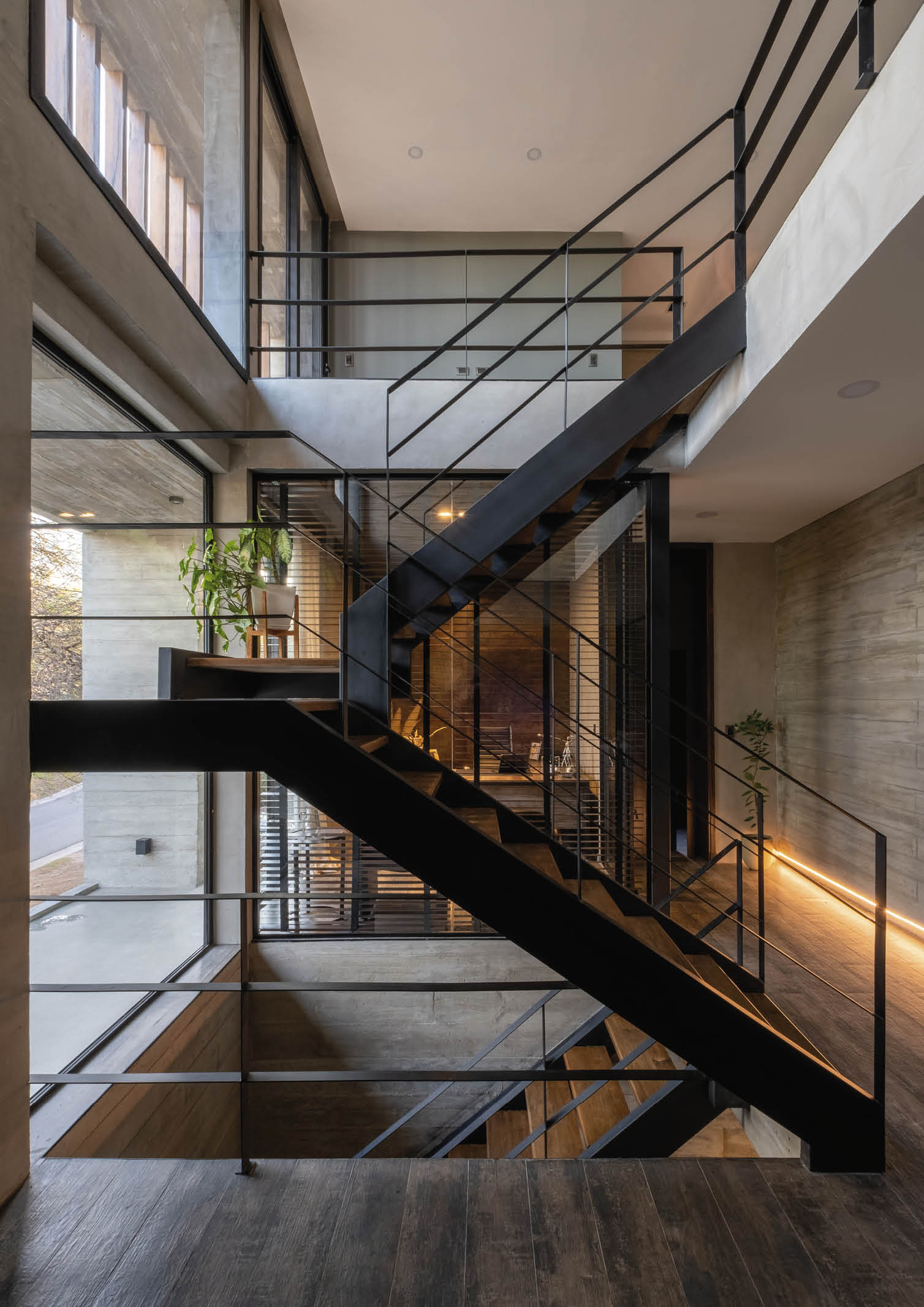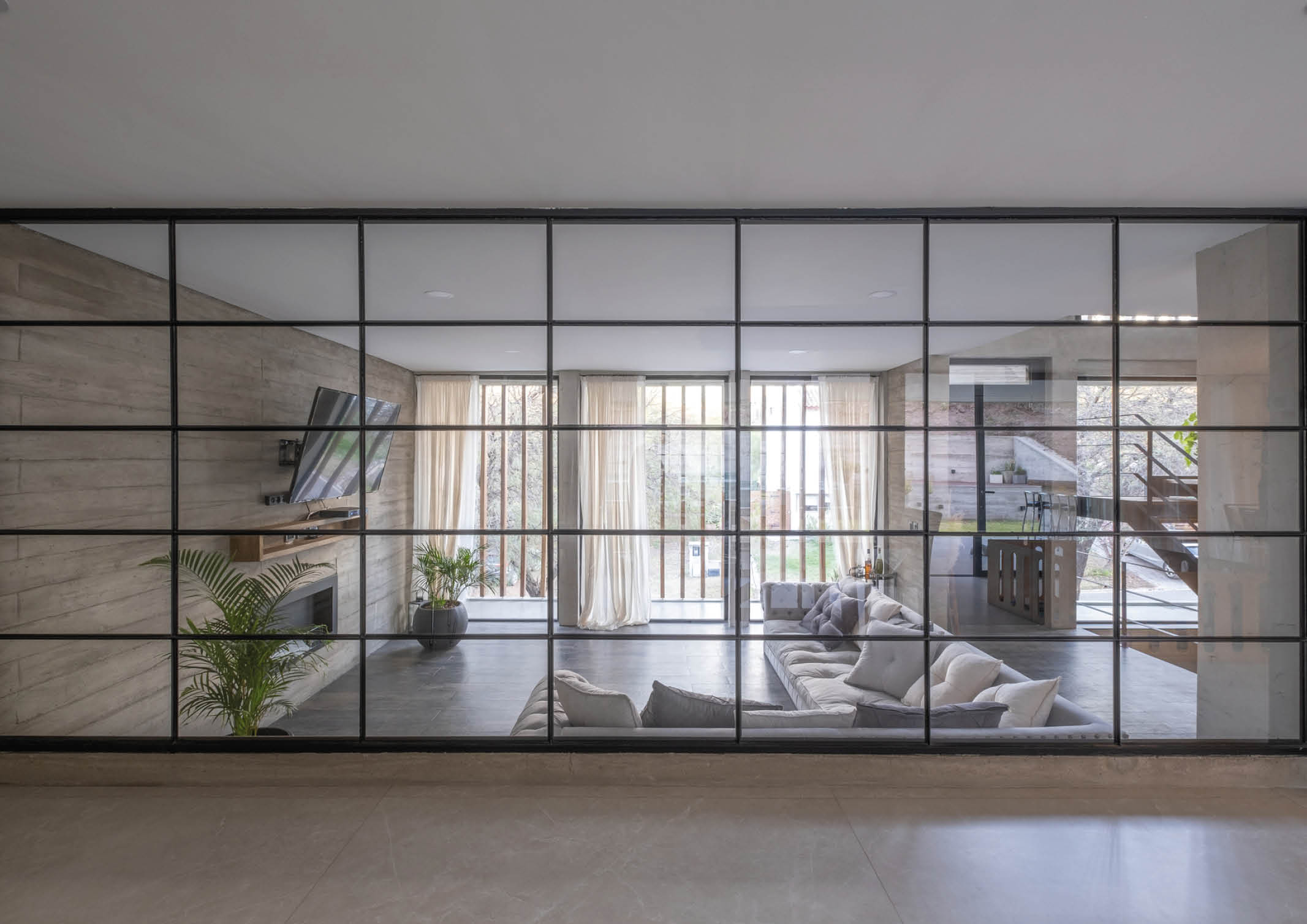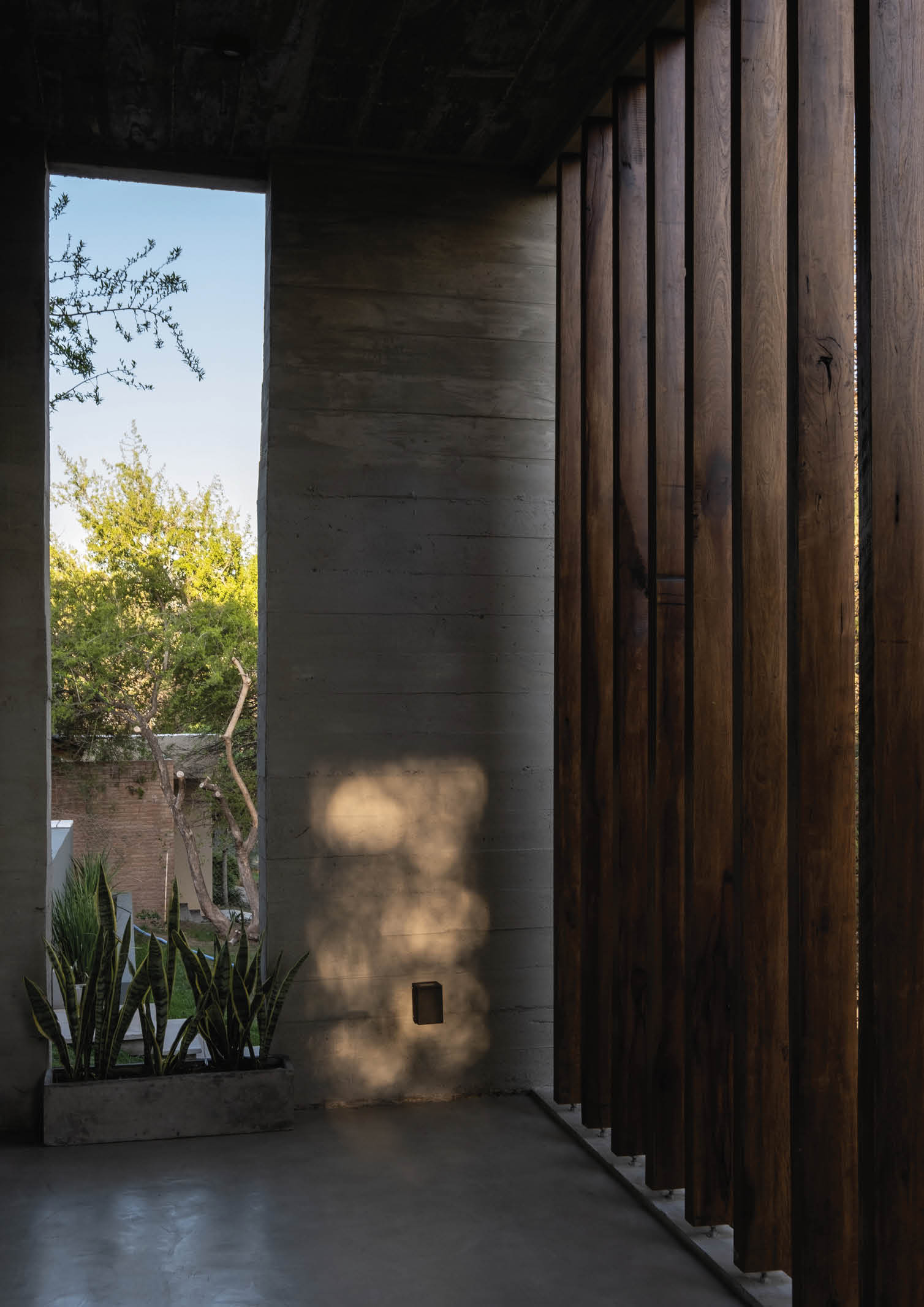 A low, dim, and underground space leads to the triple height of the next floor, over the entrance hall and living room, with great entrances of natural light and transparencies obtained in the front and the back. These allow continuous visuals towards the neighborhood and towards the patio provided through vertical wooden filters.