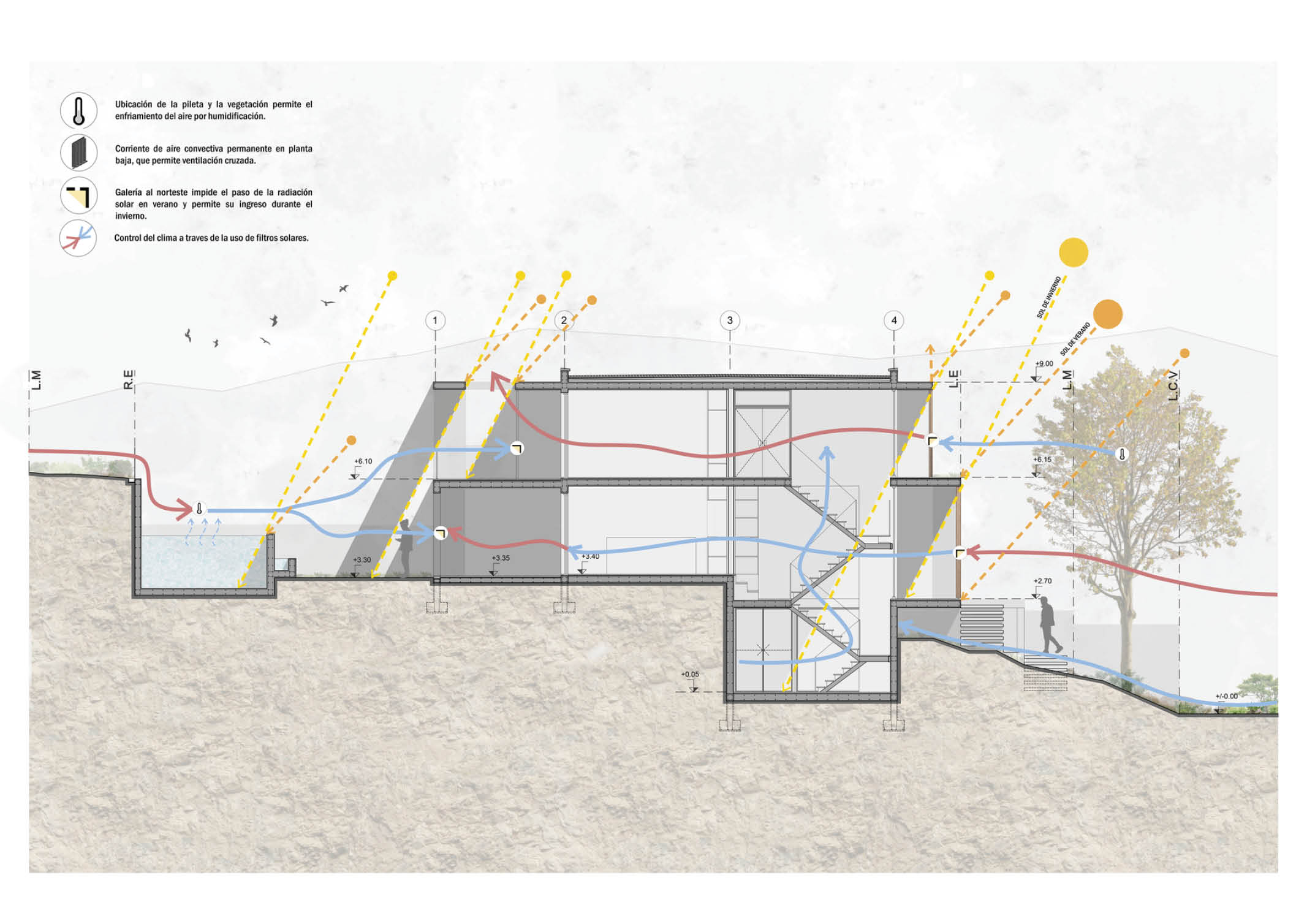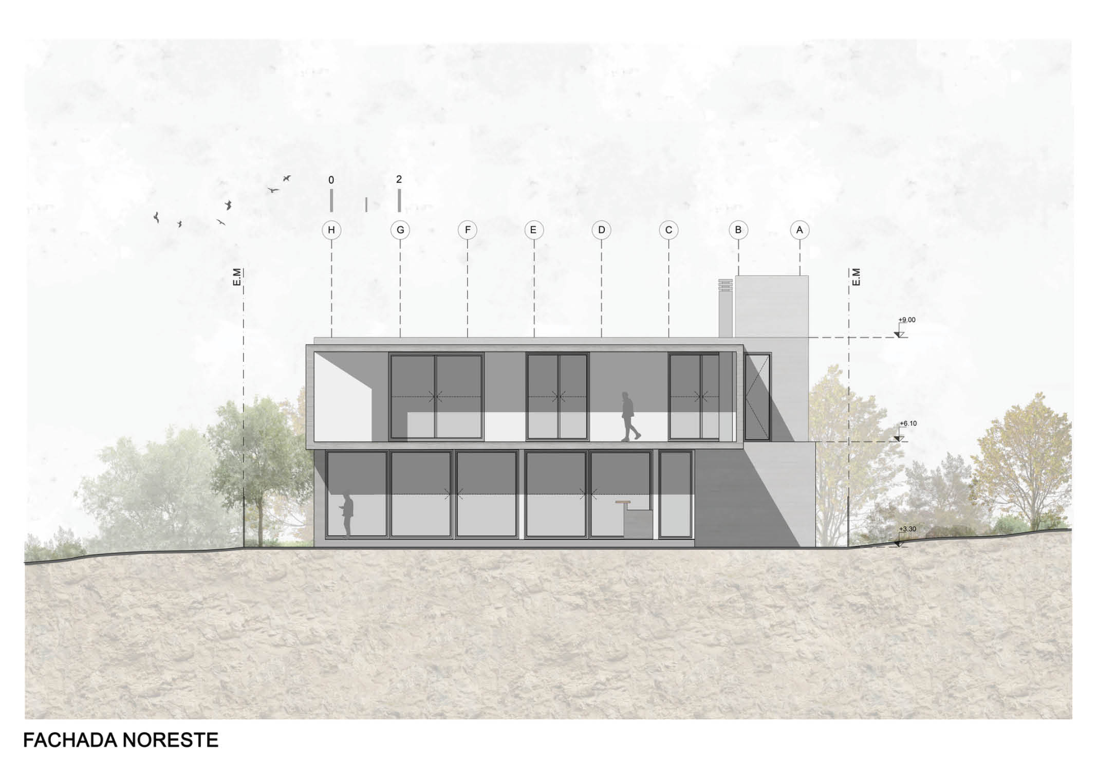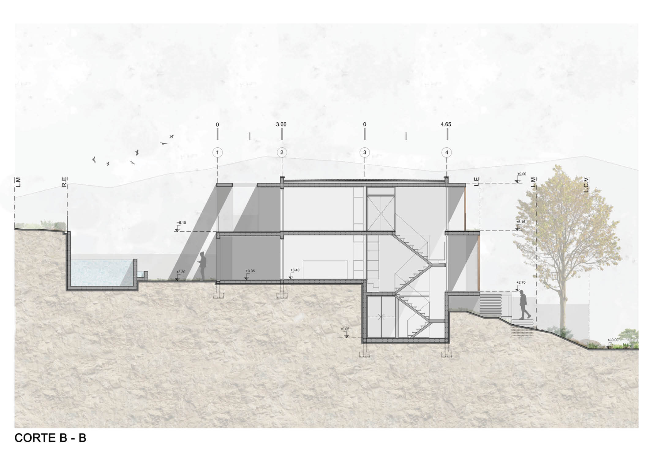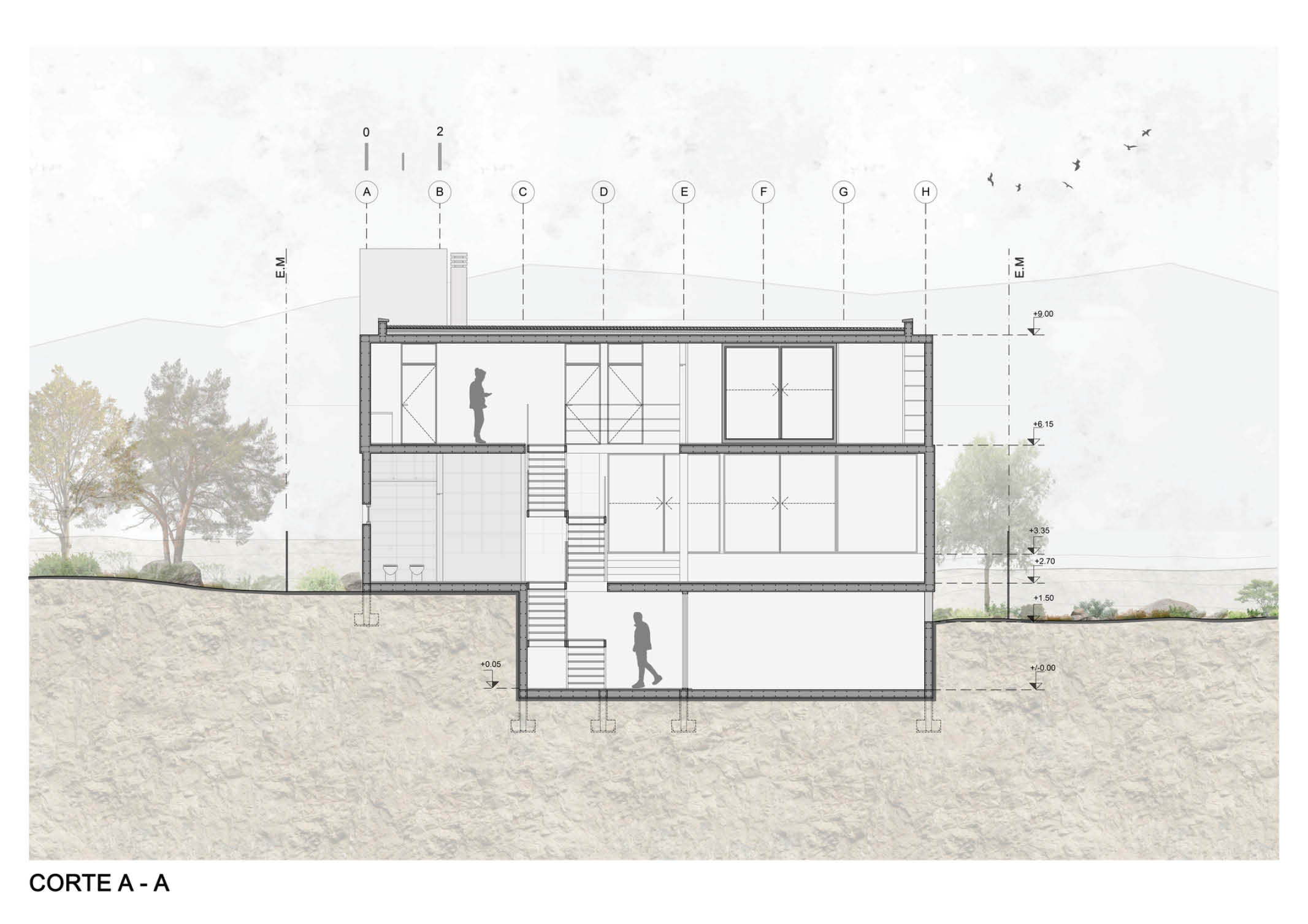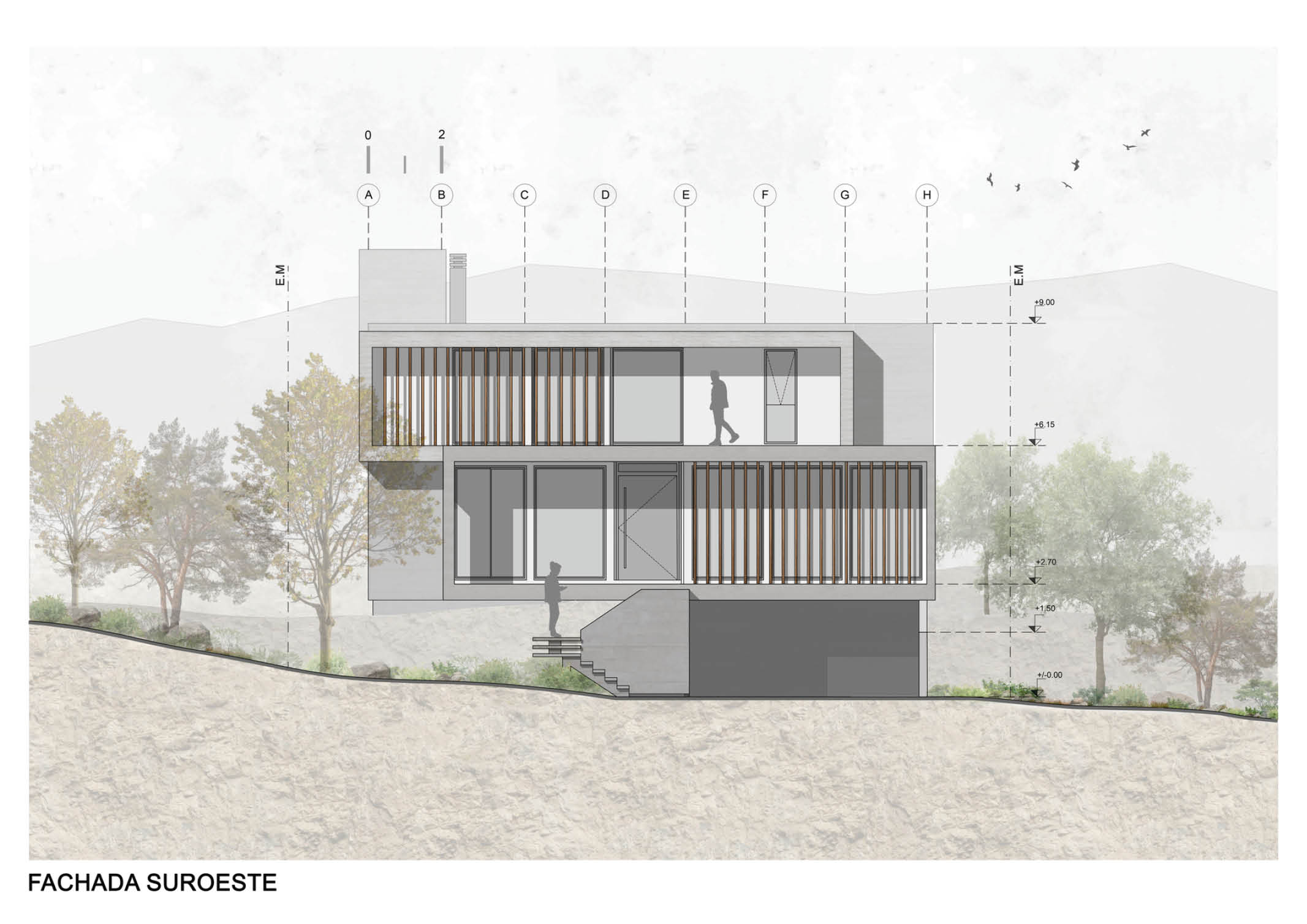 The architect explains that the hilly environment of the location provides beautiful views of the city. It has steep slopes that became strong conditioning factors during the designing and building process. It seeks a balance of caring for the environmental value of the site.