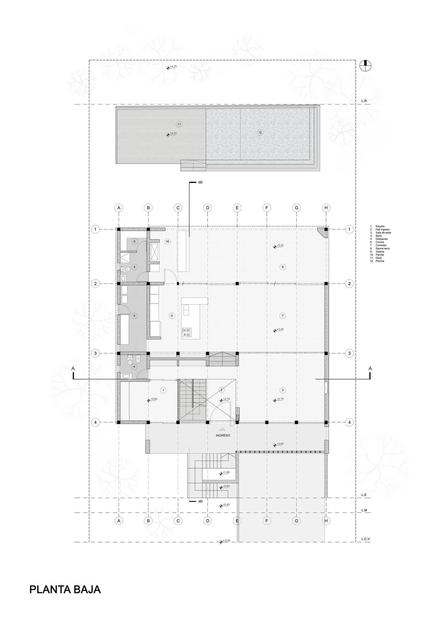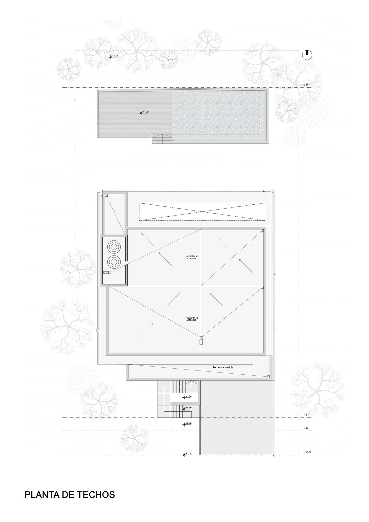 Through the movement of the soil, the architect has generated two esplanades, one for access on which the house floats and the other that links the main gallery, patio and pool.