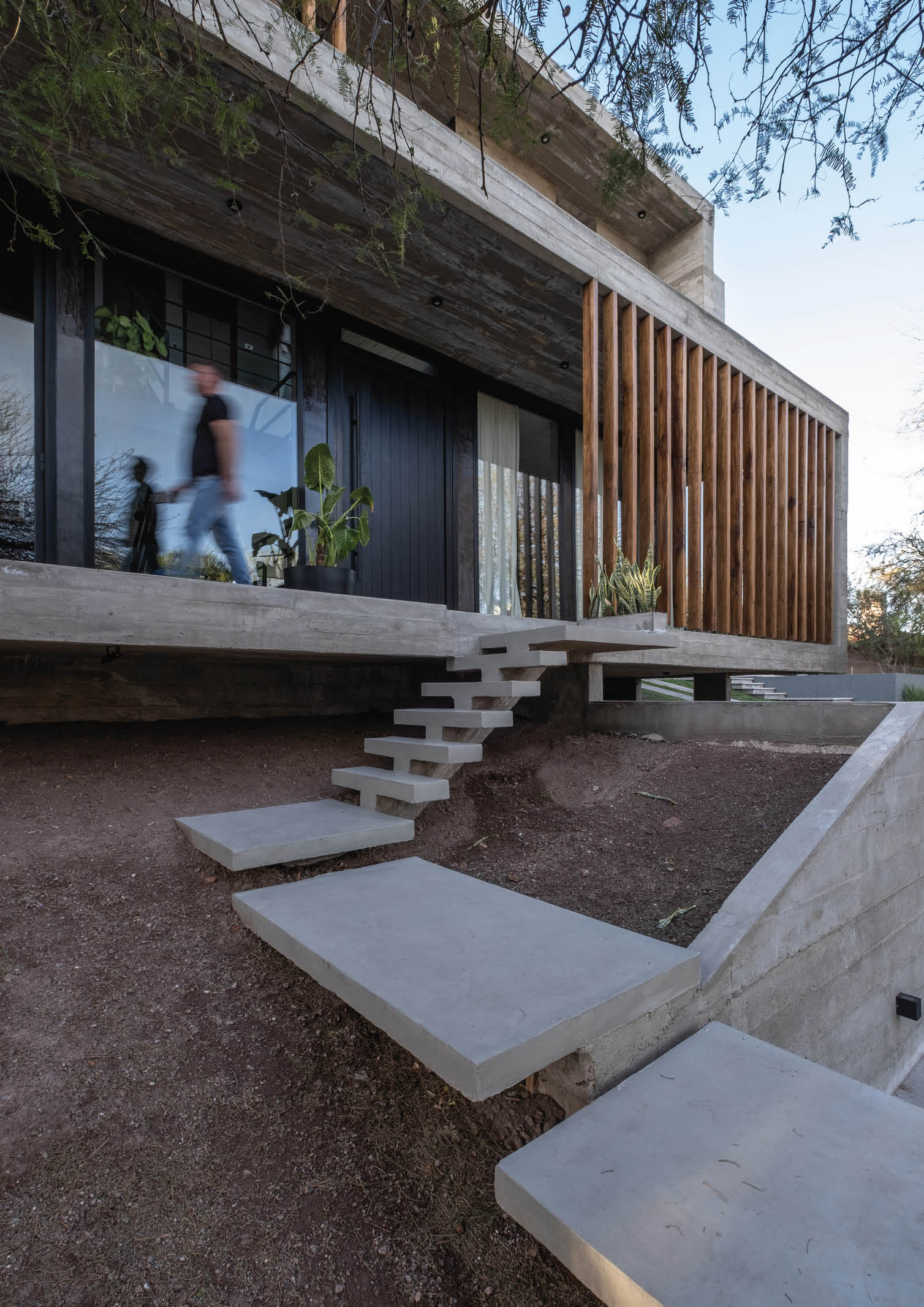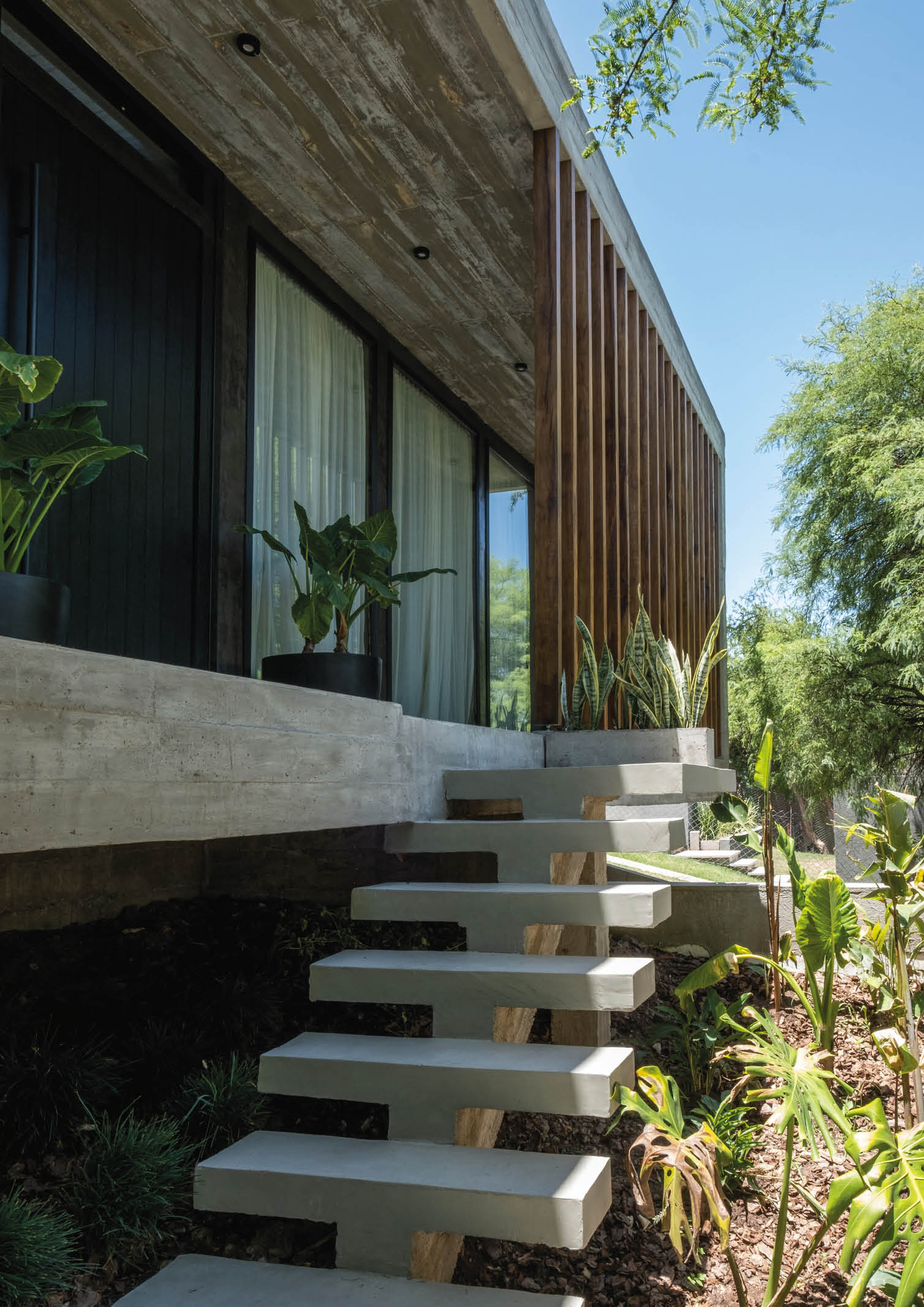 The architect designed the main entrance of the house to be raised. This allows it to find its own level on the first floor which bridges the gap with a floating concrete staircase that forms a walkway under the trees.