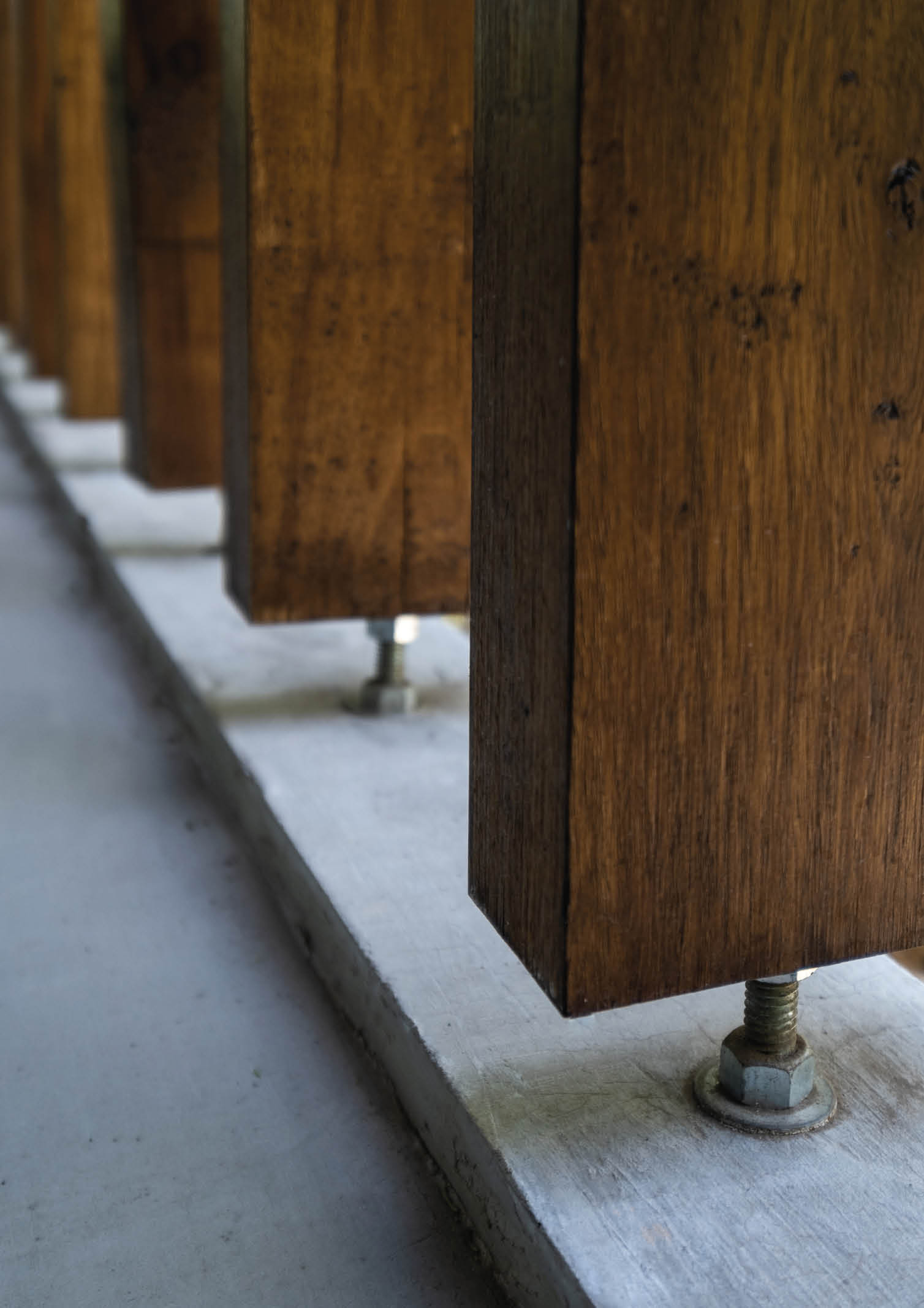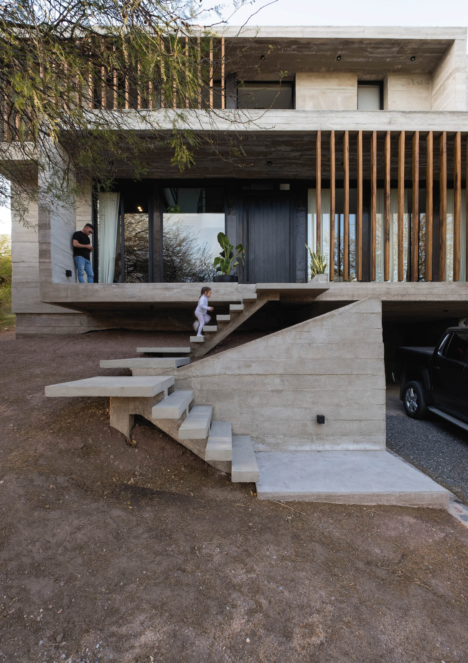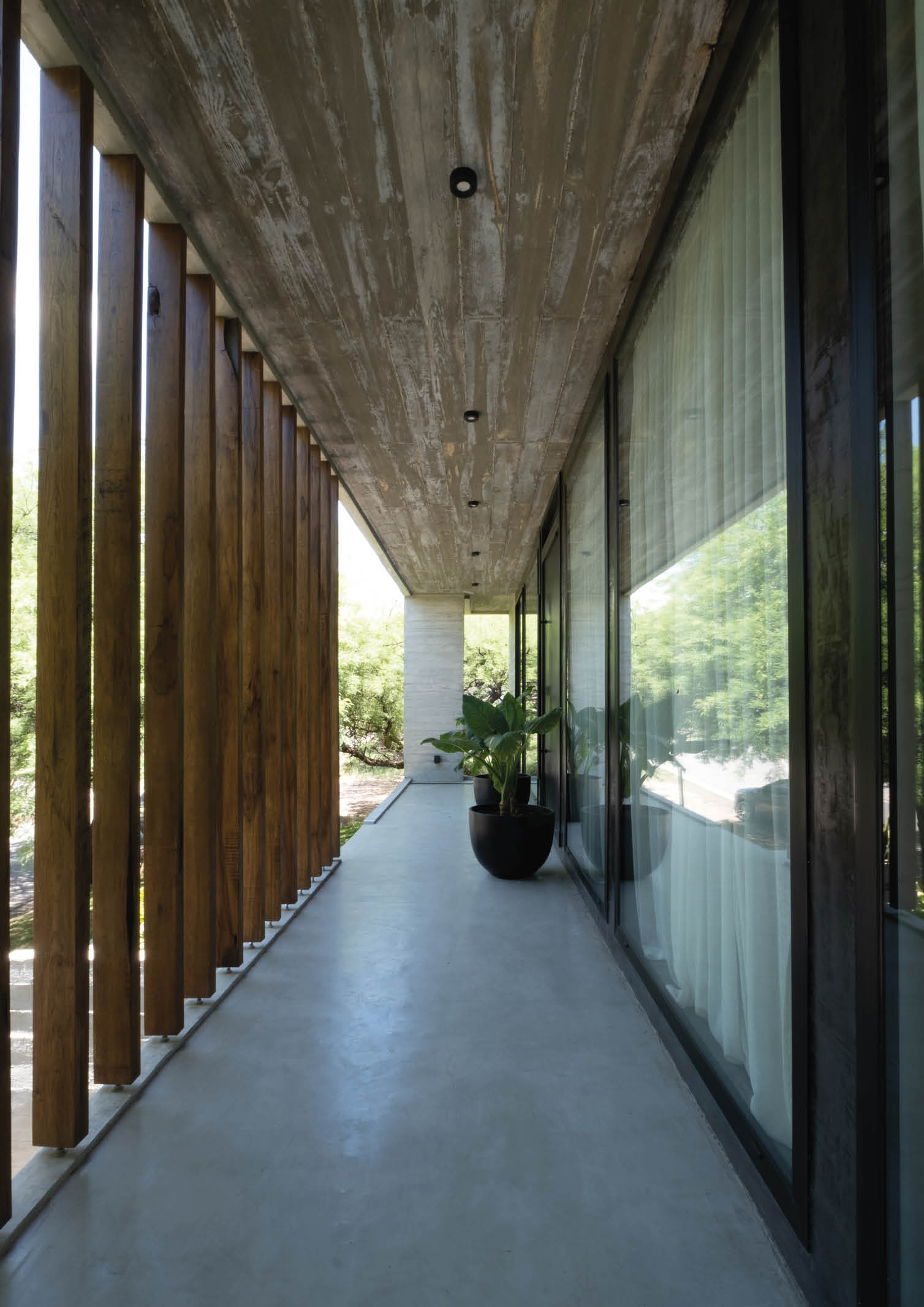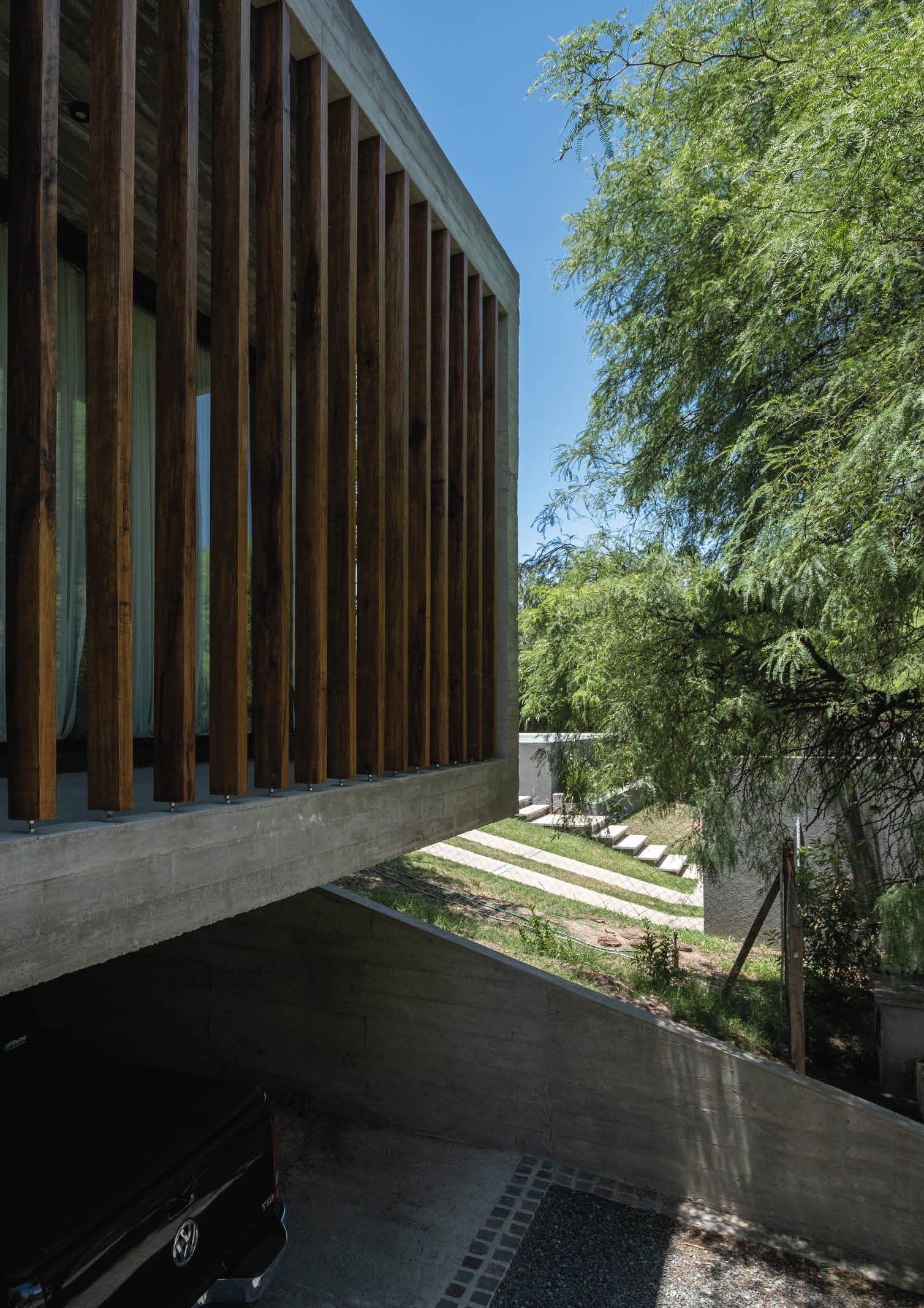 The house is developed as an independent structure block of reinforced concrete, which allows large overhangs through inverted reinforced concrete beams. The enclosing walls are covered on the inside and outside by a 5cm plate of reinforced concrete with ceramic brick, providing a monolithic image with good thermal performance. These material conditions are complemented by wooden filters on the facades, with openings located in a way that allows cross ventilation, and native vegetation that protects from extreme weather depending on the season of the year, consolidating a unique and natural atmosphere of the house.