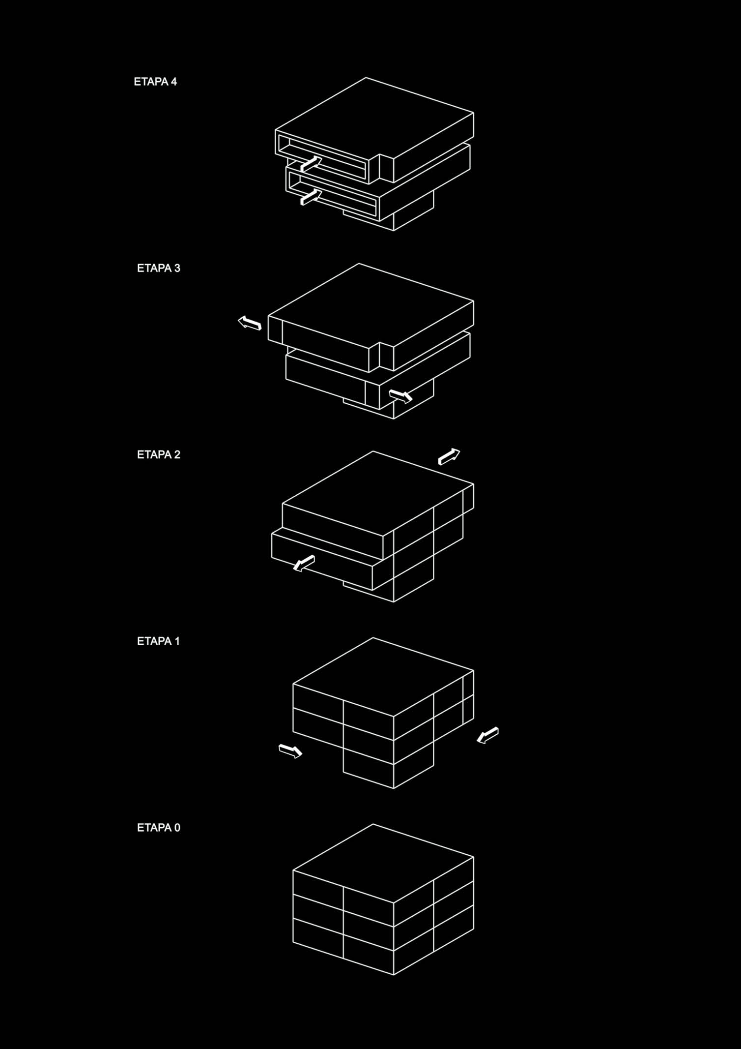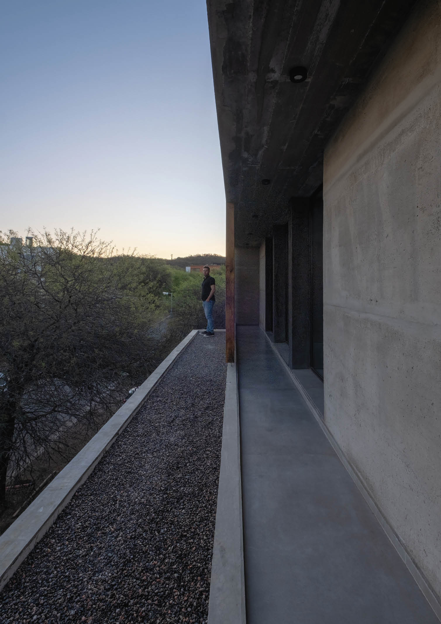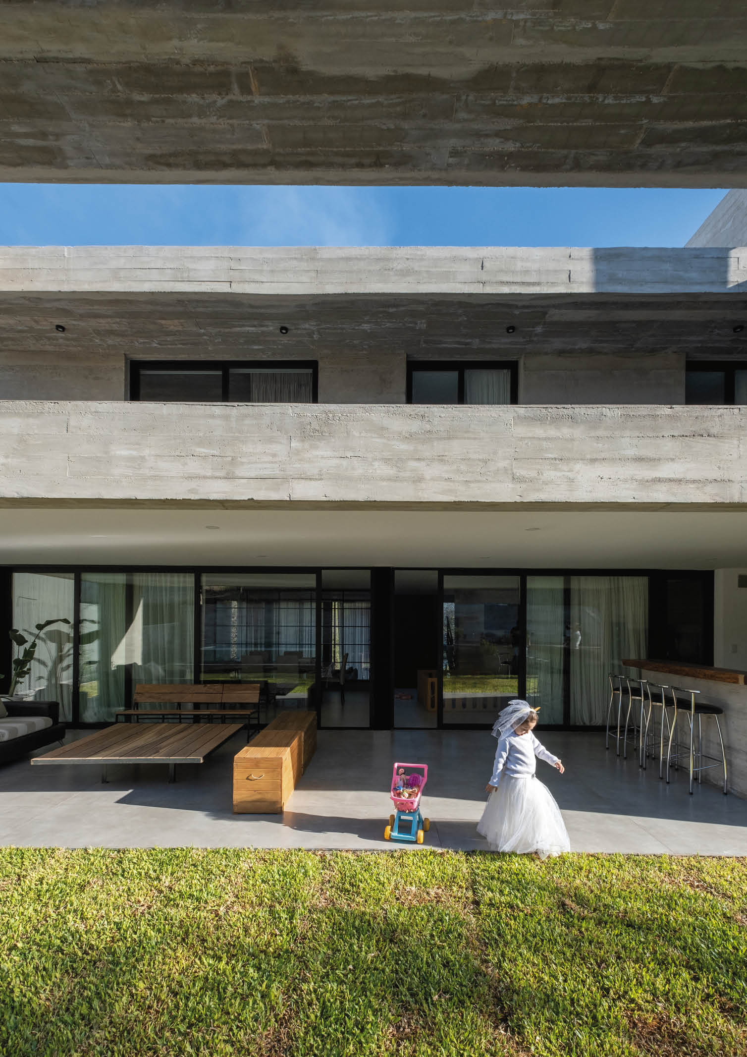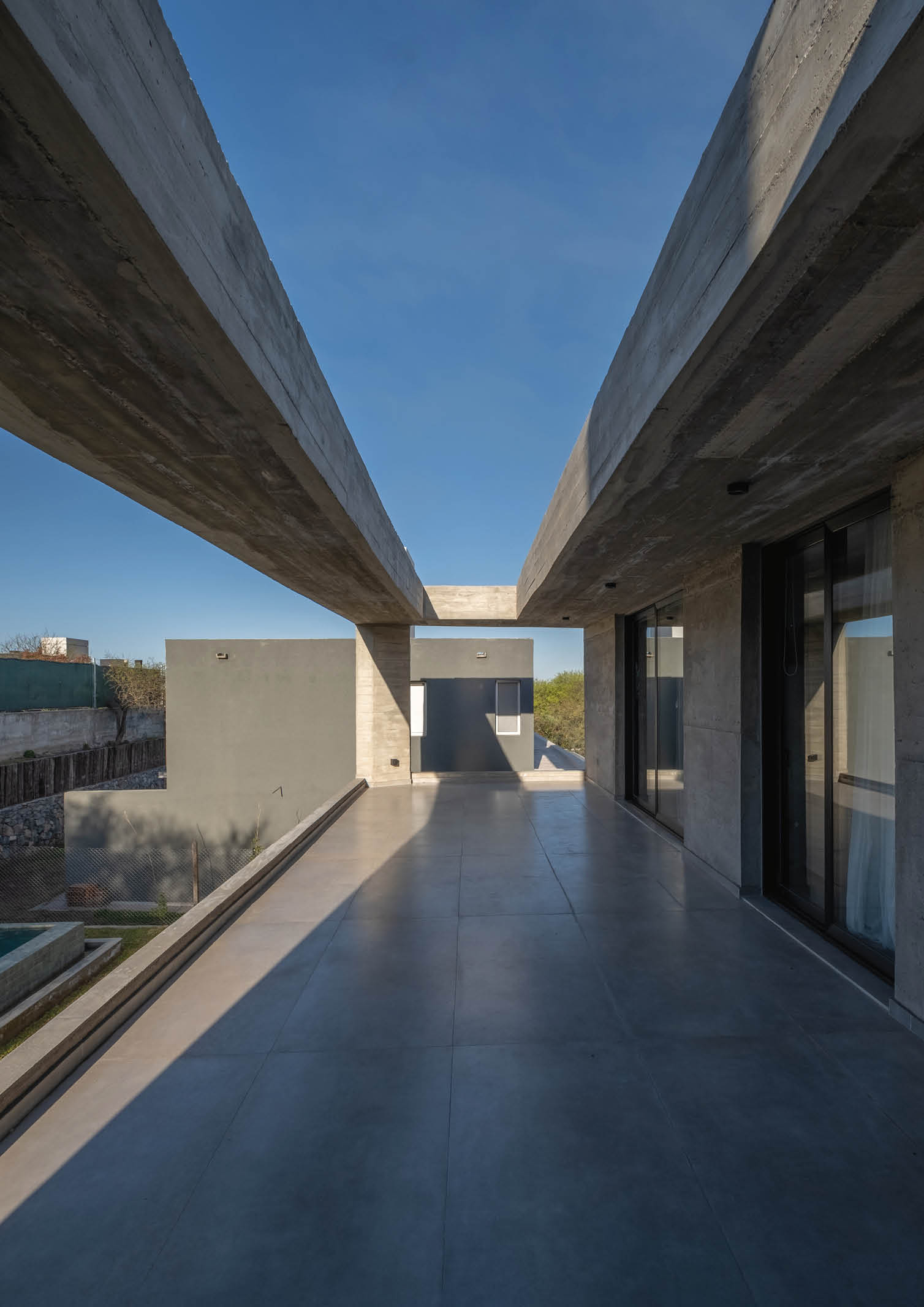 To accommodate the needs of the occupants in regards to the site, the architect came up with an idea of a pure and solid volume of concrete. The volume mutates into two superimposed blocks through the action of movement and offset. Each block has different programmatic packages. The architect explains that the superimposition allows the appearance of intermediate spaces that protect the fronts of the facades and enhance the interior-exterior interaction, generating galleries, terraces, and balconies both in the facade and in the relationship with the patio. These blocks are then emptied on the inside, allowing fluid and integrating spaces of different heights.