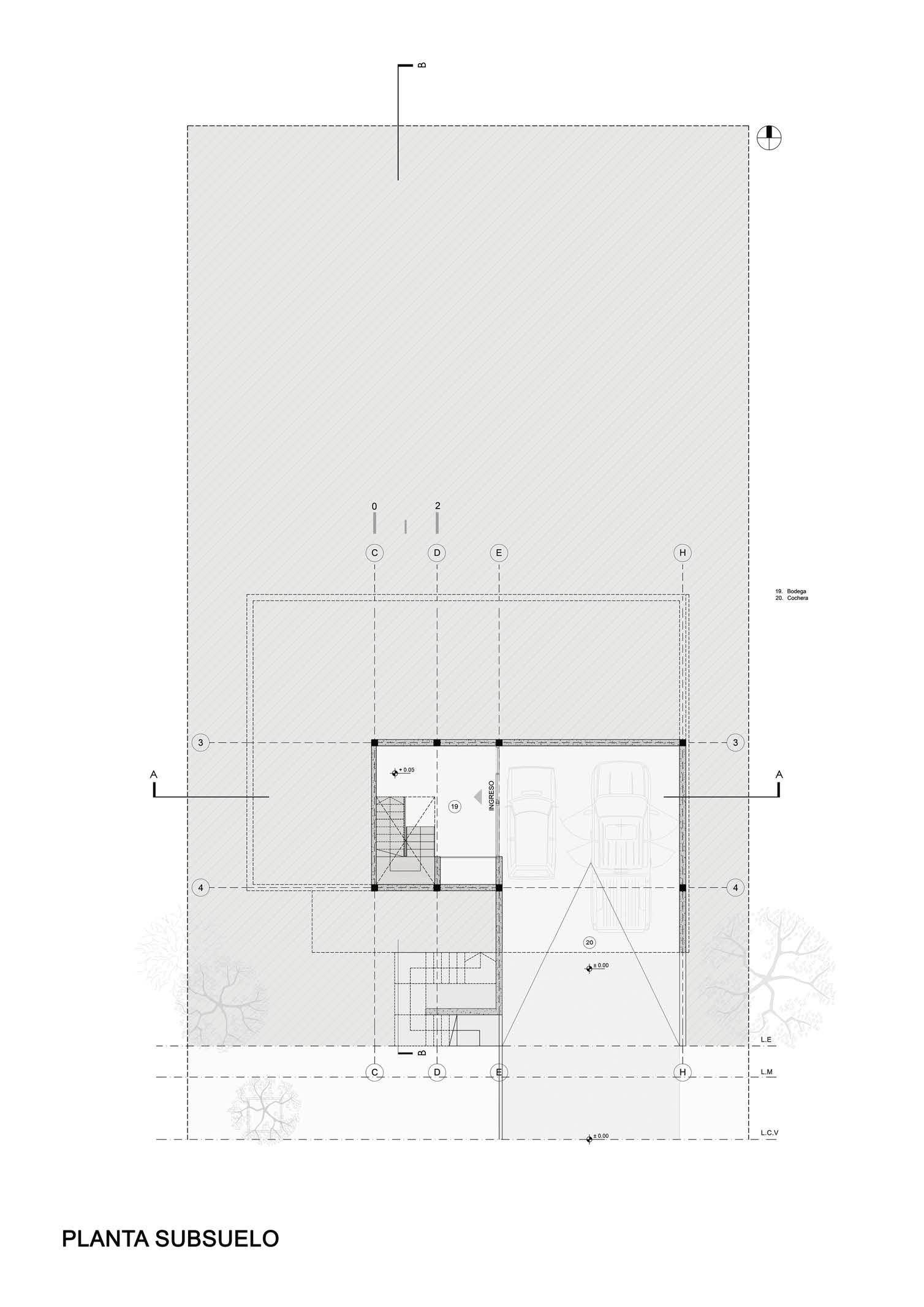 Meanwhile, a parking area and a semi-buried wine cellar are generated from the street at the pedestrian level, in a low space completely made of exposed concrete where the vertical circulation that articulates the three levels of the house is visible.