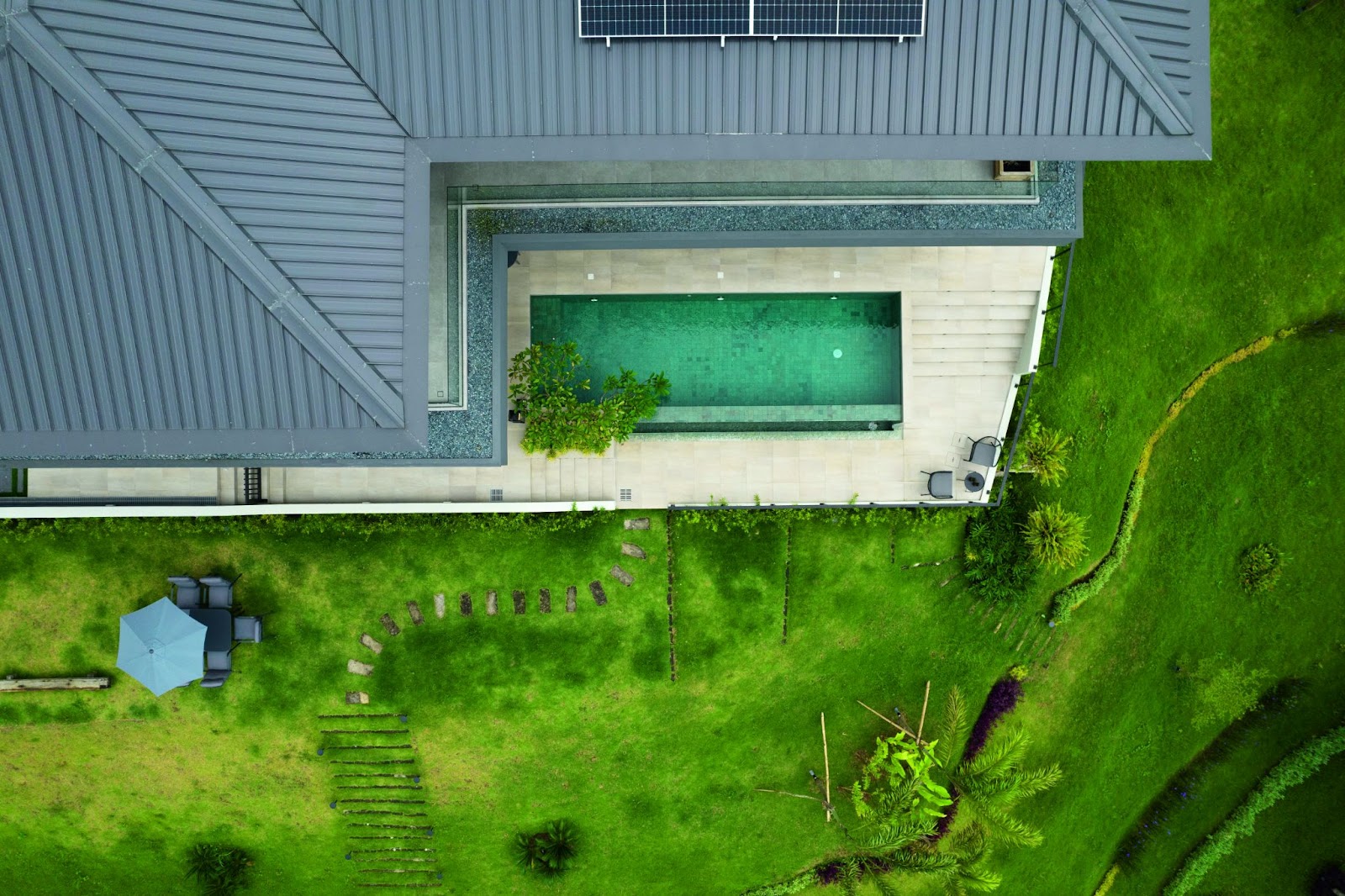 This dwelling’s eco-friendly systems allow it to have a non-disruptive natural connection. Instead of overly relying on artificial ventilation, the architect oriented the house’s structure and landscape to avoid harsh afternoon sunlight. Strategic jalousie window placement, deep eaves, and an outdoor layout provide enough natural air and shadows to reduce heat.