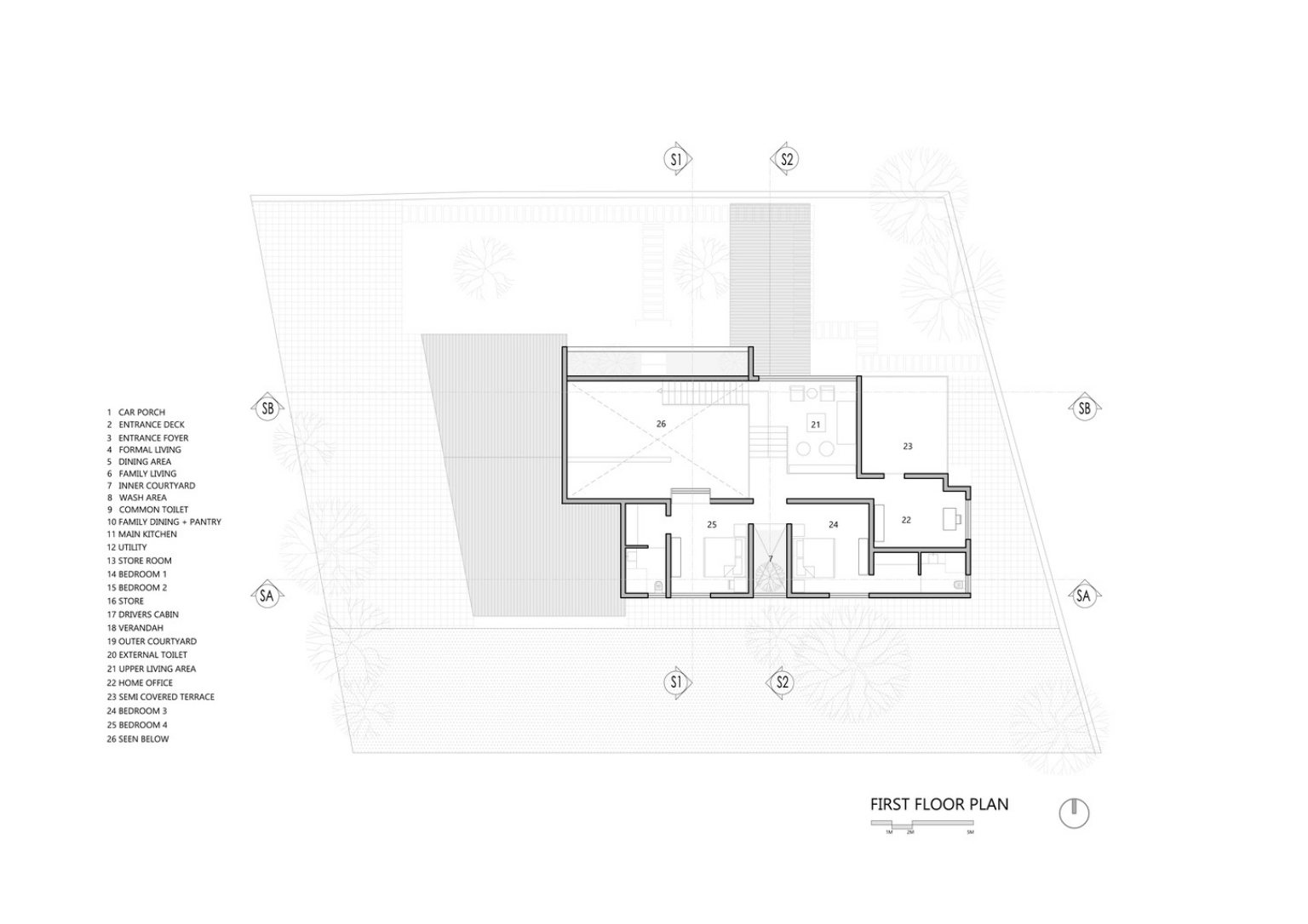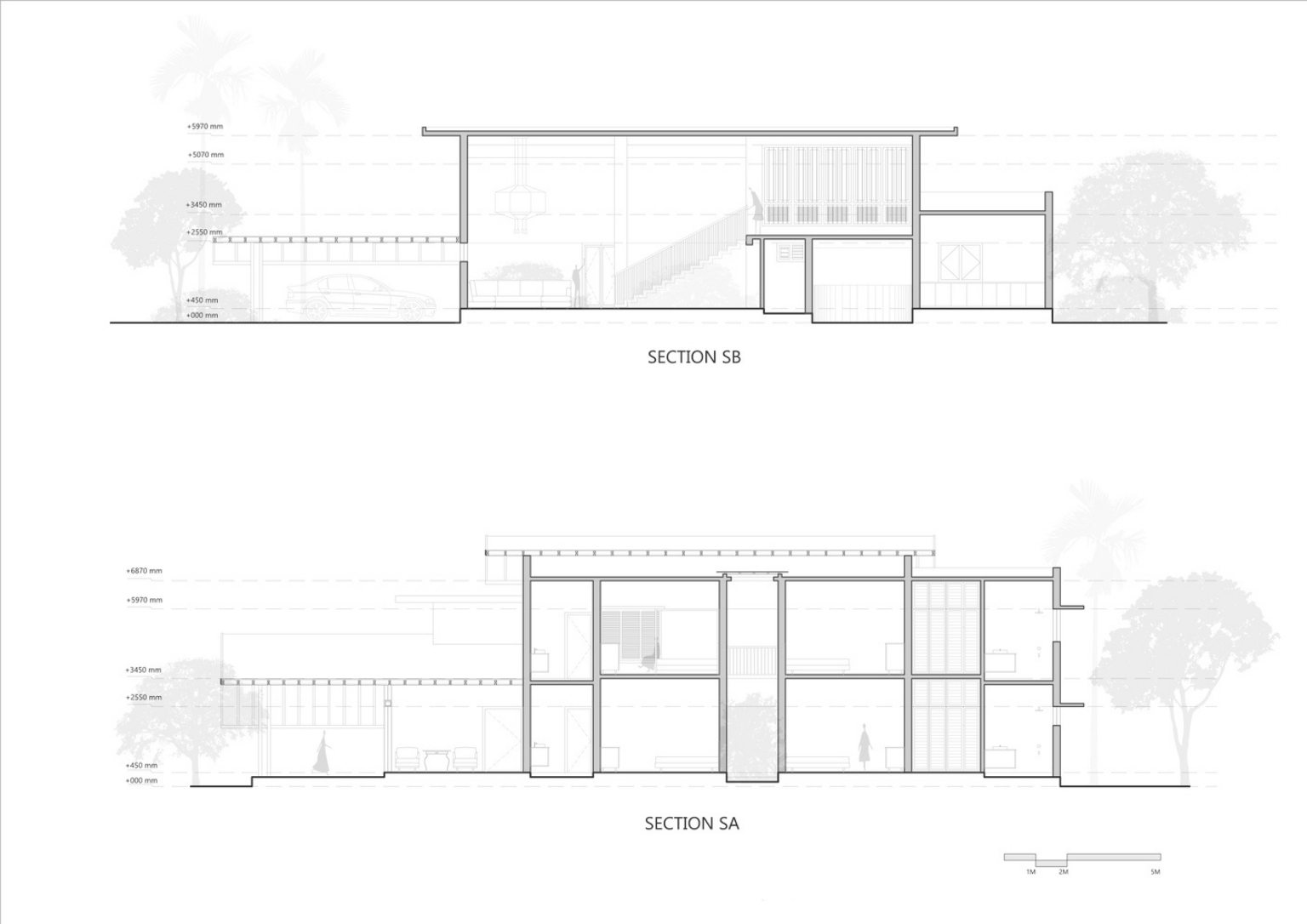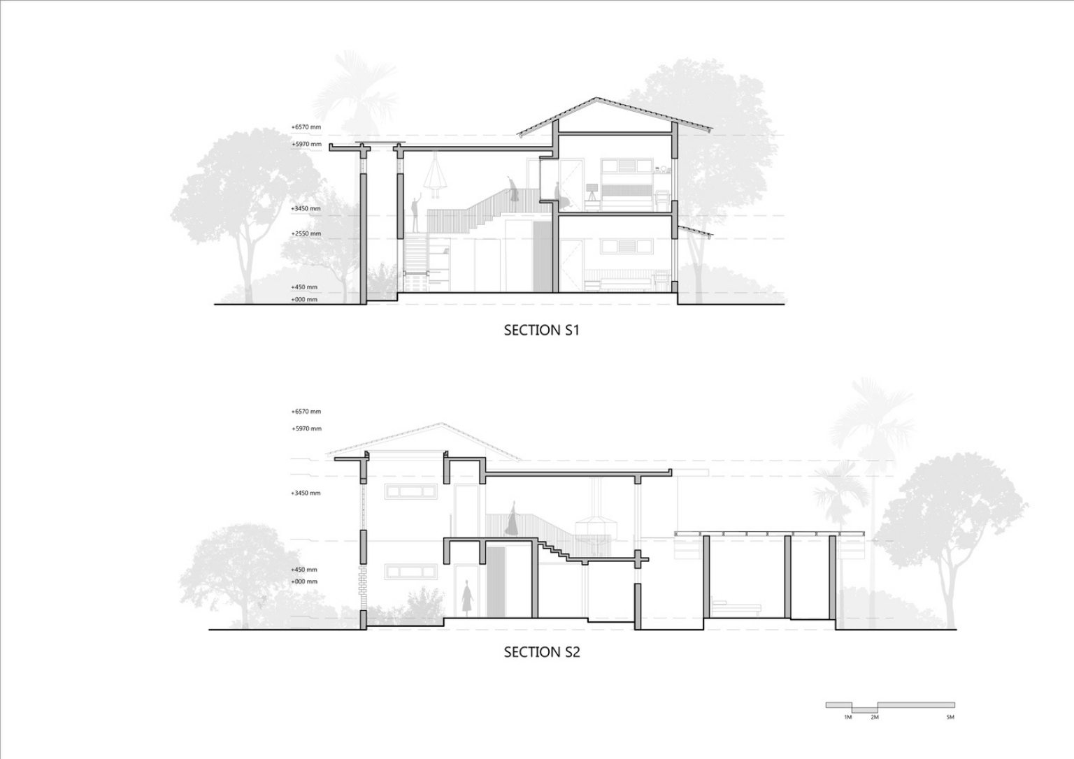 Moreover, all the common areas become a single entity through the mezzanine that makes the central core embrace the first level. On the southern zone of the site are thick trees that filter out heat and wind before it enters the double-height courtyard between bedrooms. The roof’s design follows tropical conditions with its overhang by the slopes. The large roof in the facade is a critical factor in creating the built form.