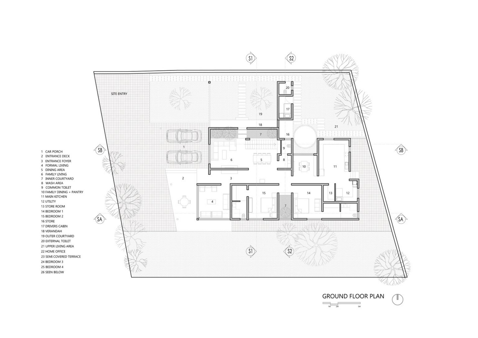 The structure highlights several communal spaces spread across the plan’s core. The house’s central area is double in height and serves as the heart of the design. It is the primary source of light and ventilation for all the other spaces. One common area faces north, filtering northern light and wind through double-wall masonry with interceding jallis. The client prefers areas that will allow them to spend time with friends and family, and these gathering zones are a definite answer to the requirement.