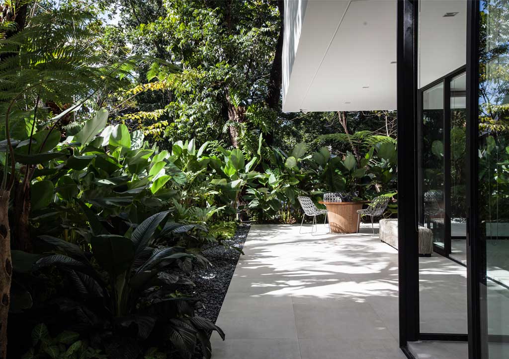 The lanai is sheltered by both natural and built elements with trees and cantilevers providing shade. A bare lanai design puts the nearby greenery front and center of the users’ attention. The monochromatic palette of grey, black, and white further elevates this effect. Elegant quality furnishing and a simple layout offers a more intimate and quiet experience. There are no pretenses in how the space presents itself; rather, it takes a step back and allows the beauty of the environment to shine.
