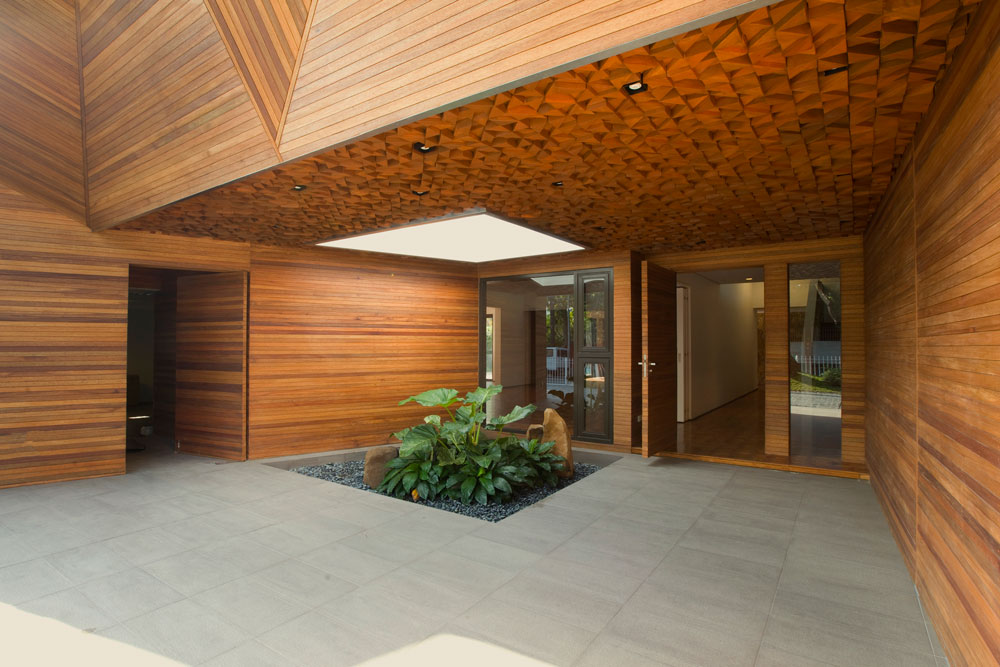 The ‘funneling’ is achieved through an impressive drop off-slash-foyer. It projects out of the façade, clad in wood slats that all seem to point towards the front door. Where the original façade partially hid this door behind arches, the new one features a prominent geometric feature that beckons visitors inside. Completing the facelift is a variety of materials consisting of broken piedra china stones for the massing surfaces, tanguile panels and steel frames for the entrance foyer.