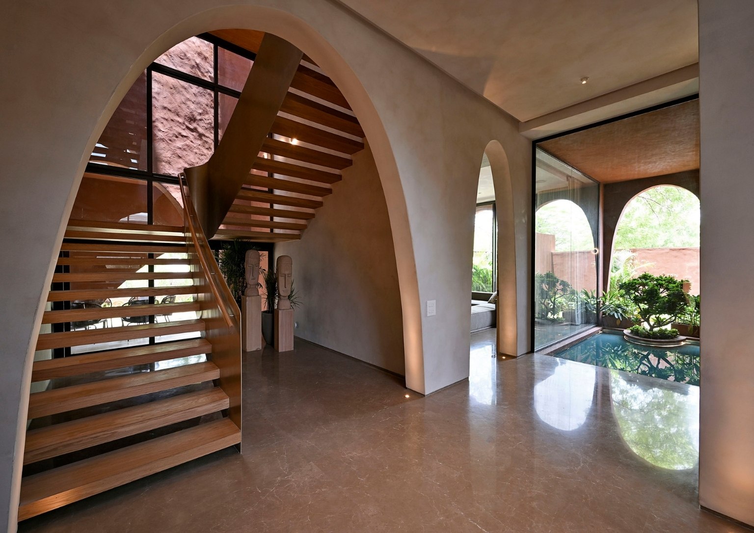 “The design creates energy-efficient spaces with reduced heat gain and indirect natural light in each part of the house. Built with locally sourced bricks, sandstone, and lime plaster with local craftsmen and contract labor from the immediate vicinity, water recycling, rainwater harvesting, and solar panels for energy generation. The house is built sustainably and is climate responsive,” Sanja Puri Architects explained.