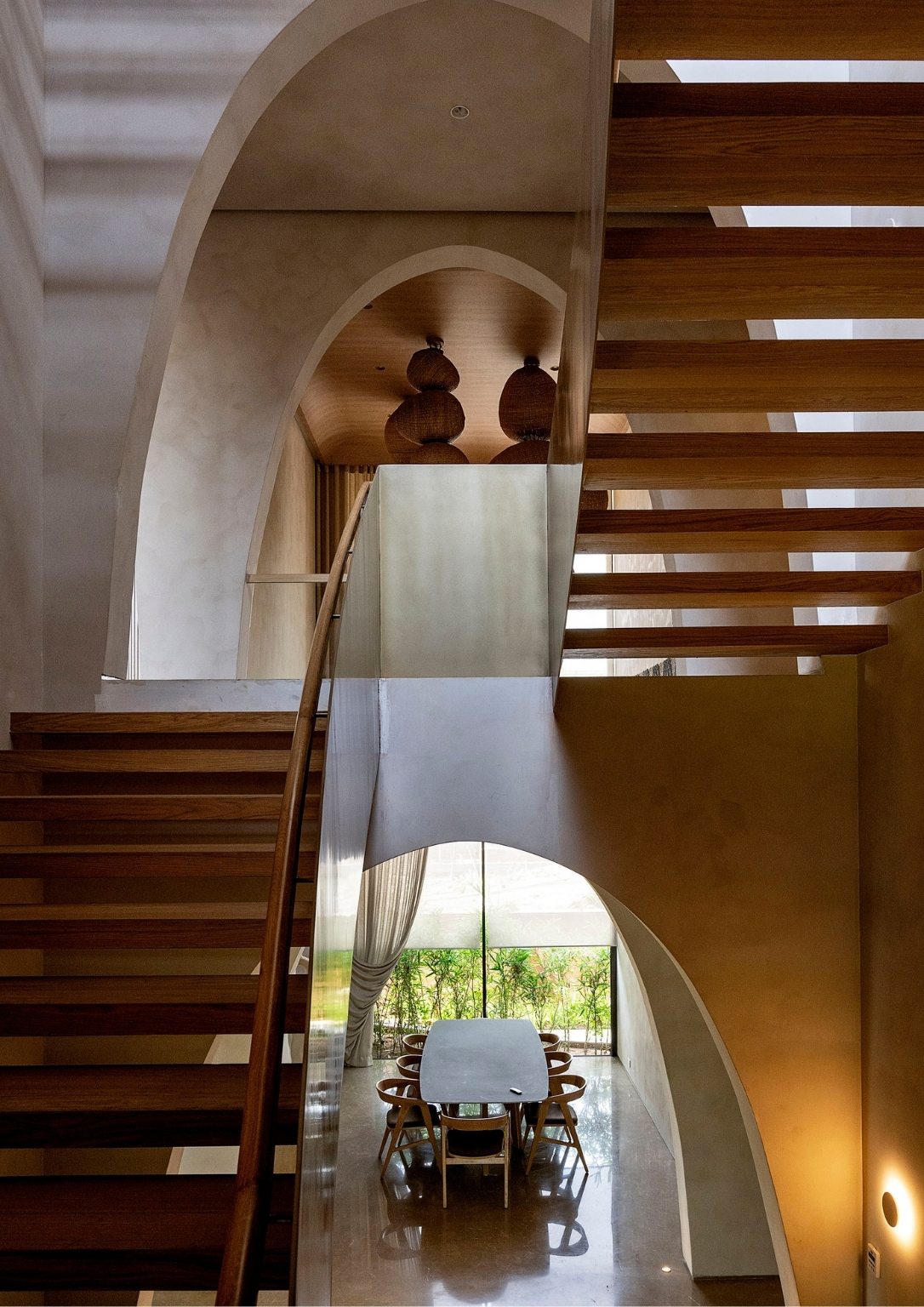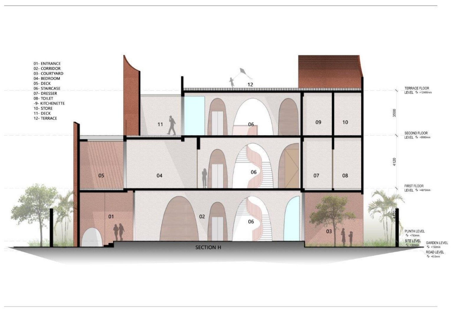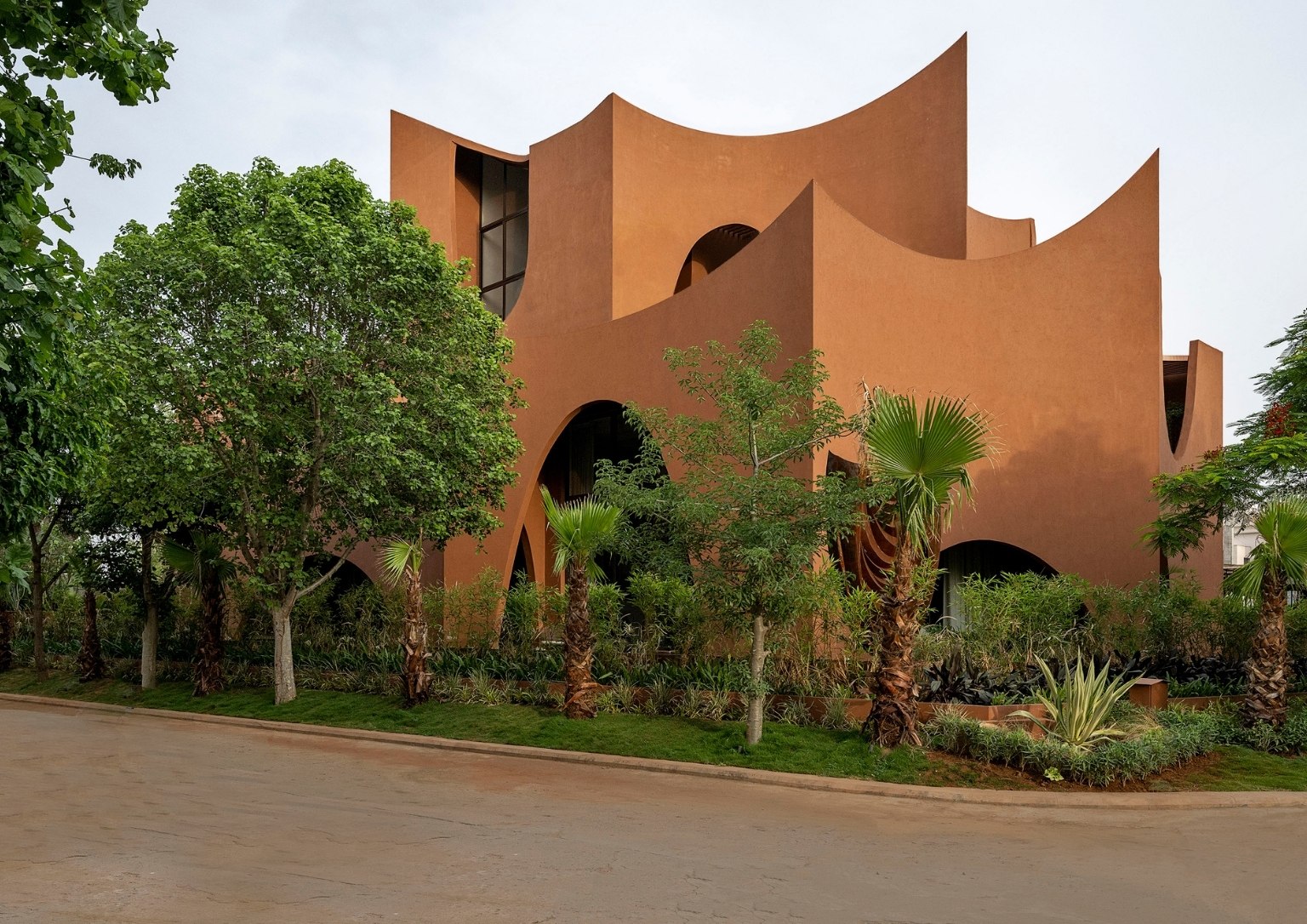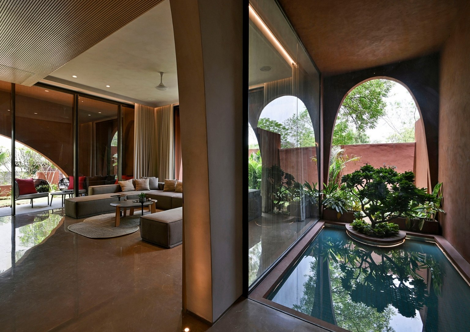 The surrounding of this contextual house features a curvilinear punctuated envelope that creates interstitial semi-open spaces all along the perimeter with deeper recesses on the garden-facing sides. According to the architect, this envelope reduces the heat gain substantially while providing sheltered open spaces around the house to each room.