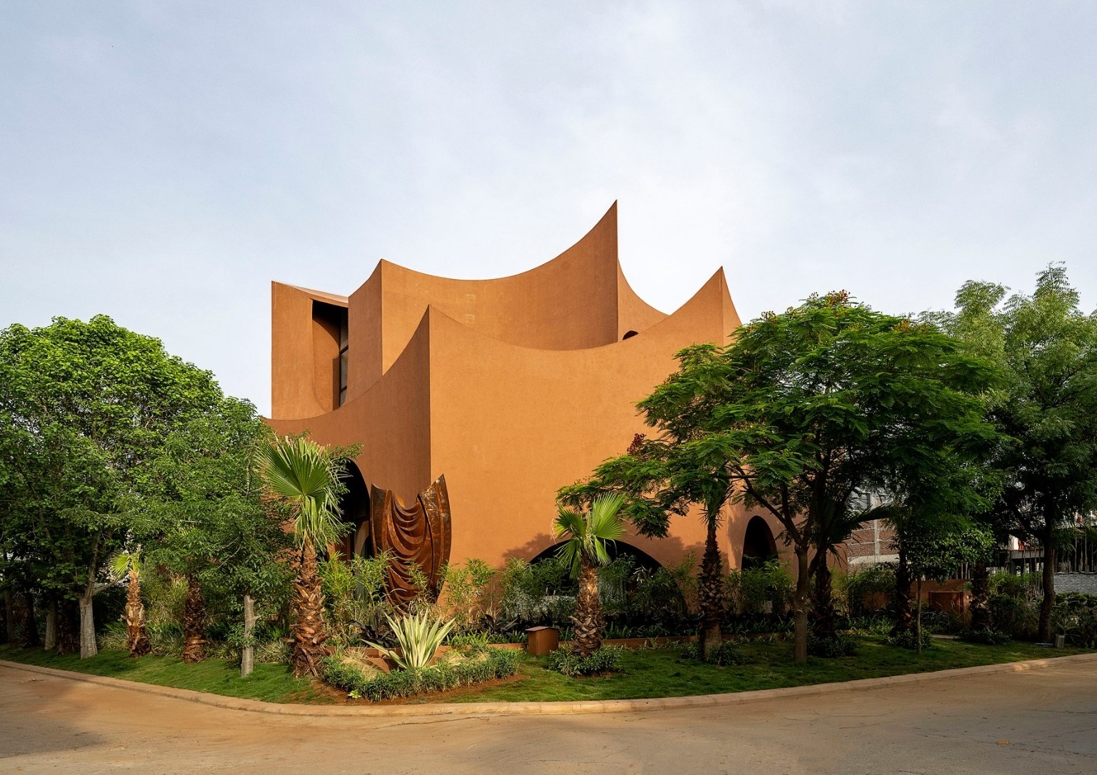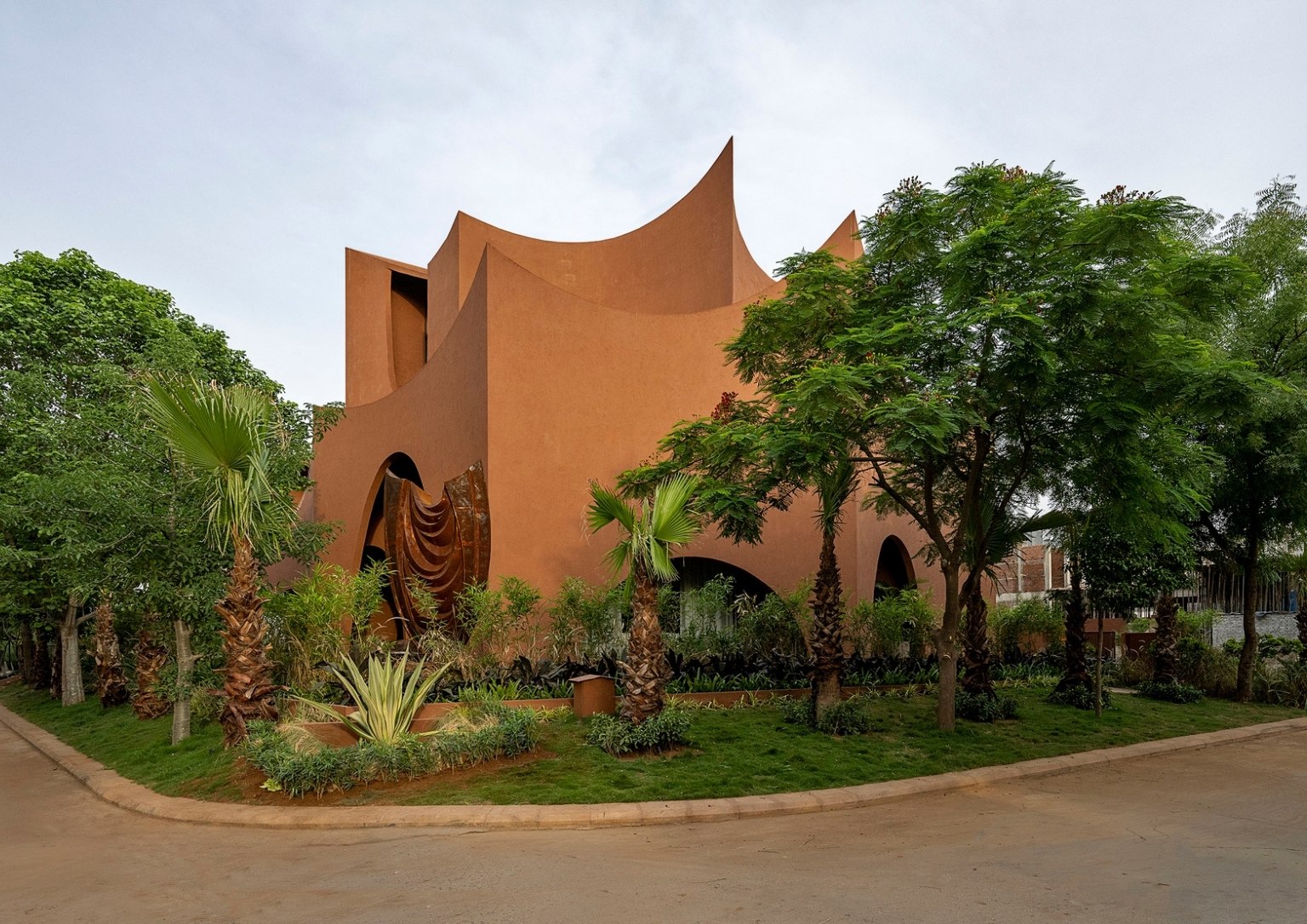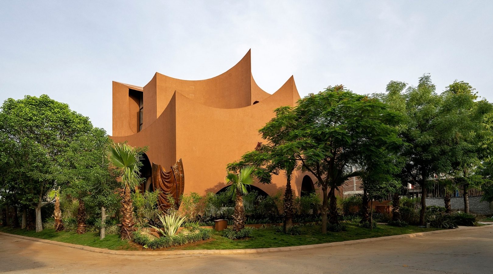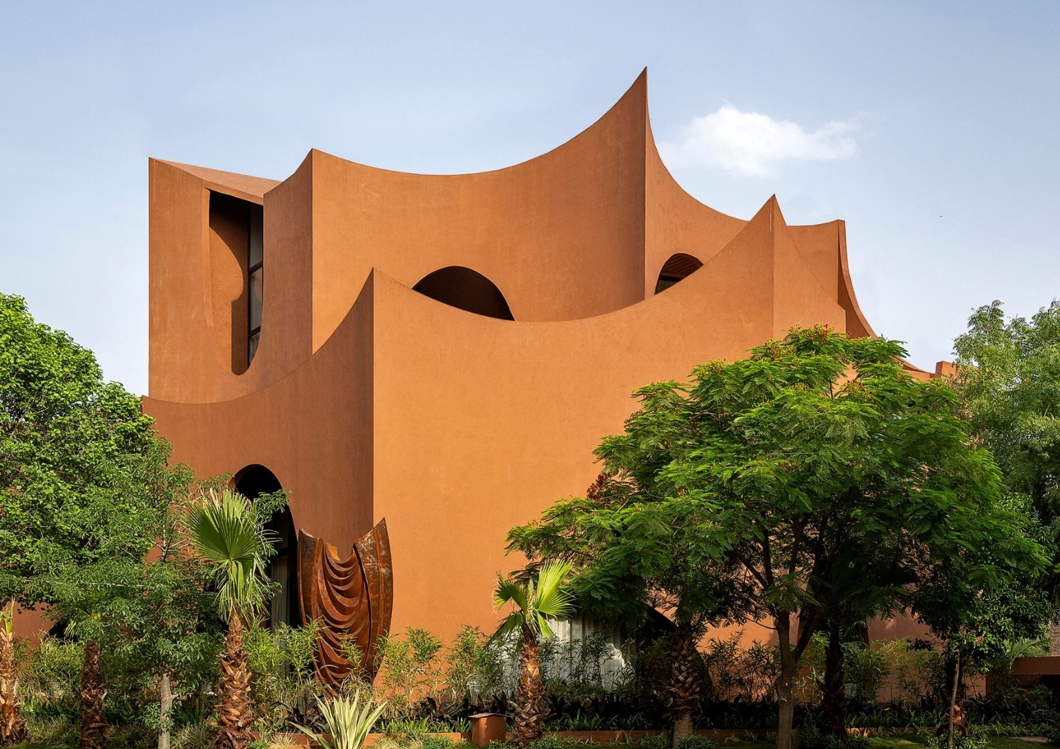 The surrounding of this contextual house features a curvilinear punctuated envelope that creates interstitial semi-open spaces all along the perimeter with deeper recesses on the garden-facing sides. According to the architect, this envelope reduces the heat gain substantially while providing sheltered open spaces around the house to each room.