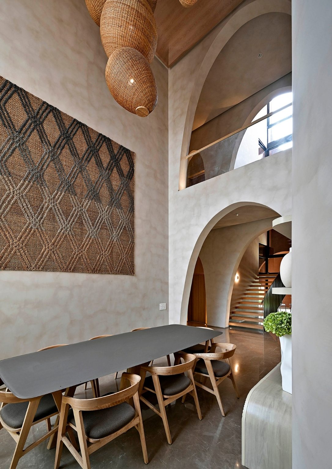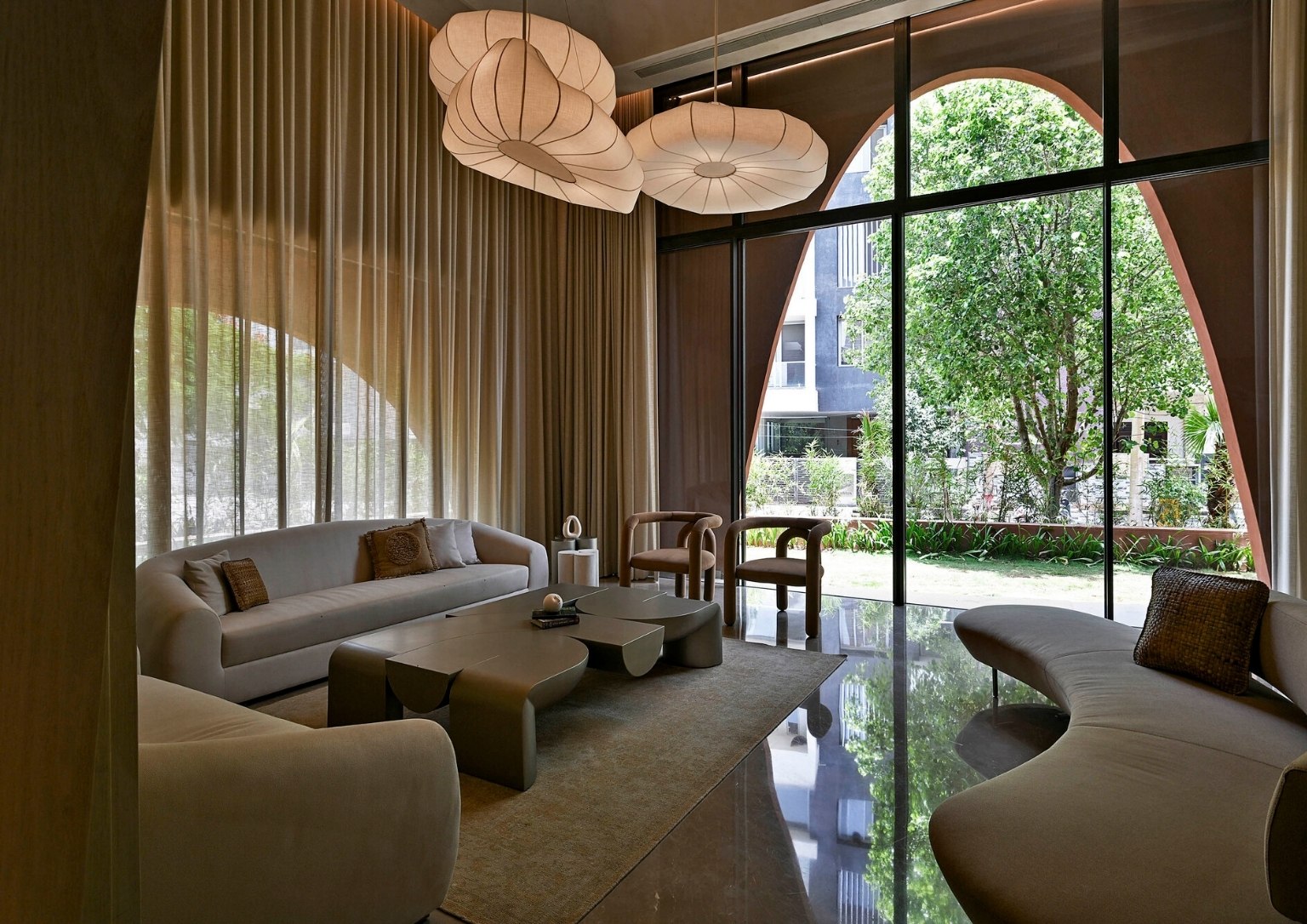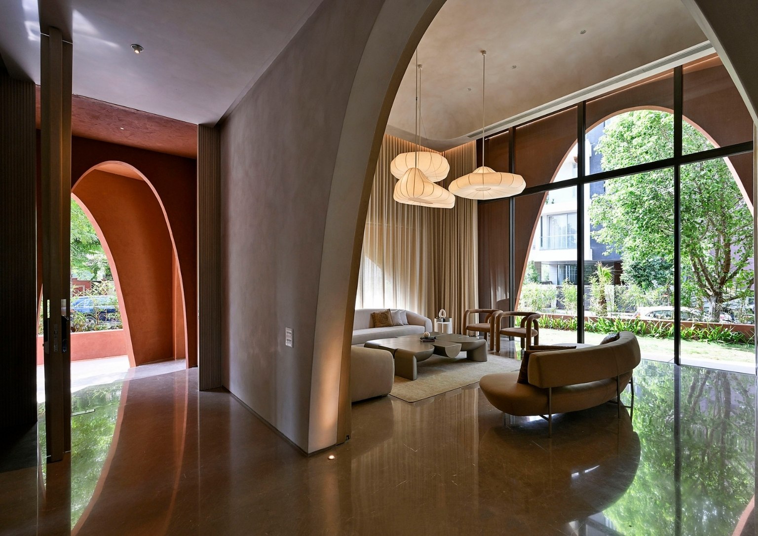 Sanja Puri Architects designed the residence for a family with three generations living together. It has three levels with four bedrooms, two living rooms, a gym, and a study. The heights within vary in each section. Each part of the house has an interesting play of volumes, such as bedrooms of a single volume, dining area of a double volume, and a living area of an intermediate 1.5 level volume.
