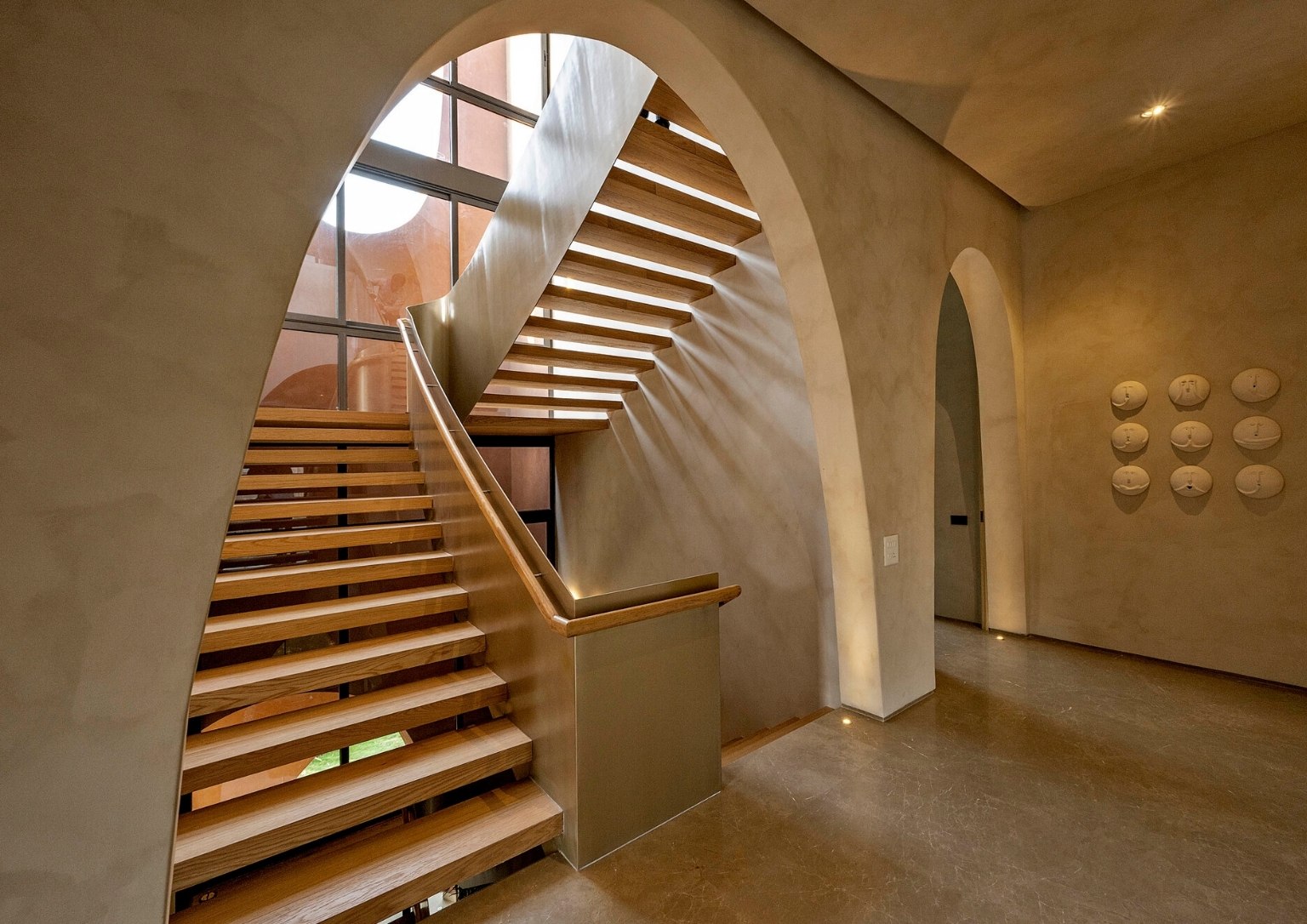 Since the location has a hot arid climate, the envelope keeps the entire house cool in the hot summer months with temperatures that can go as high as 40 degrees Celsius for eight months of the year. The architect designed this sculptural house to respond to its surroundings, the climate, and the owner’s needs, creating an interesting play of volumes, open enclosed, and semi-open enclosed spaces at every level.