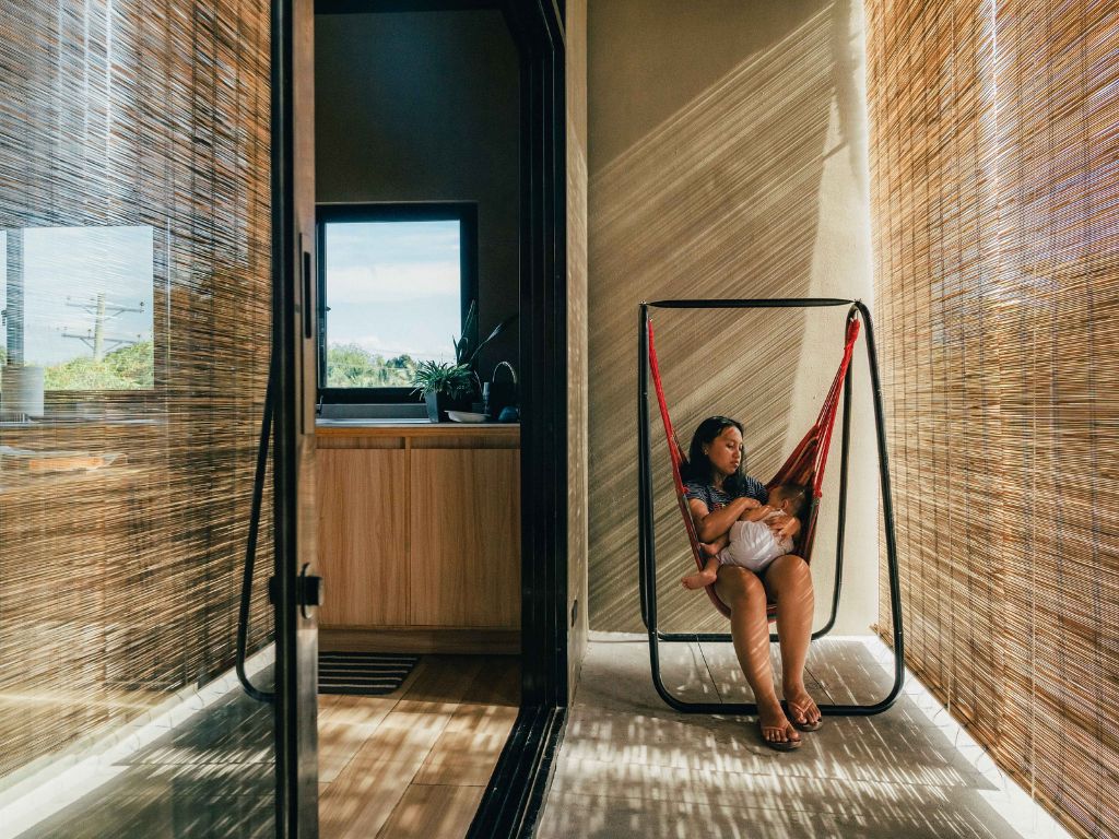 Wide corner ribbon windows at the west provide views of the mountains and street, taking in strong Habagat winds from the southwest and cool Amihan winds from the northeast. Bamboo blinds filter direct sunlight, and together with warm wood and concrete materials, create a cozy and inviting space. Large sliding doors open up to a roof garden at the southeast and extend the interior space to the outside. Floor to ceiling bamboo blinds installed along the roof eaves create an intimate transitory space between interior and exterior.