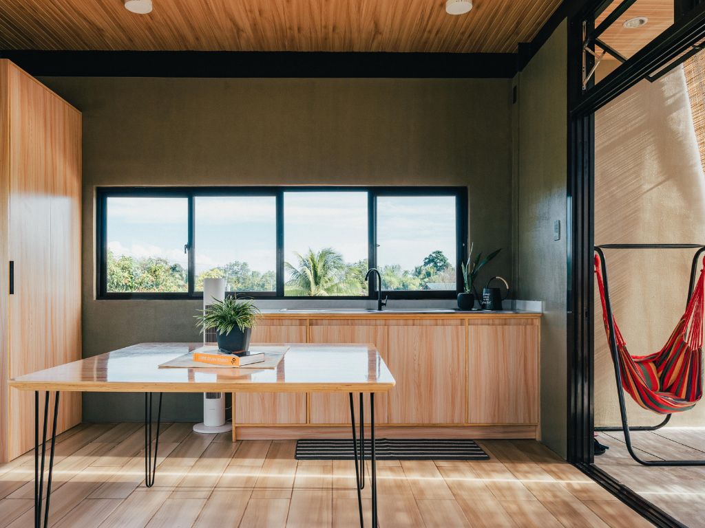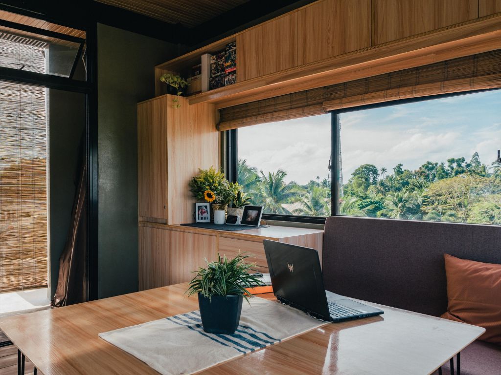 Located at the 3rd floor level of a family residence, this home office sits above the surrounding tree line in the urban area of Dumaguete City, Negros Oriental. At this altitude, the space enjoys free-flowing Amihan and Habagat winds and wide scenic views of the trees and sky. As part of a larger residential structure, they share amenities such as the toilet and bath, and communal areas among family members.
