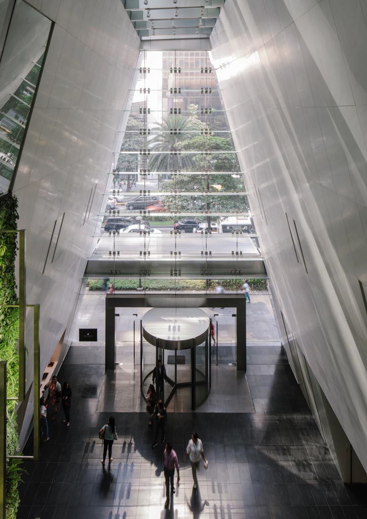 The concept of our architects was about transparency and openness and permeability. If you walk down Ayala Avenue, most of the buildings have this closed feeling. We wanted to change that, to make a building that is transparent and connects the pedestrian on Ayala Avenue to that of De la Rosa. So we created this almost cathedral-like space using these glass walls and the skylight up above. At certain parts of the day, like noon, you get stunning sunlight streaking into the space.