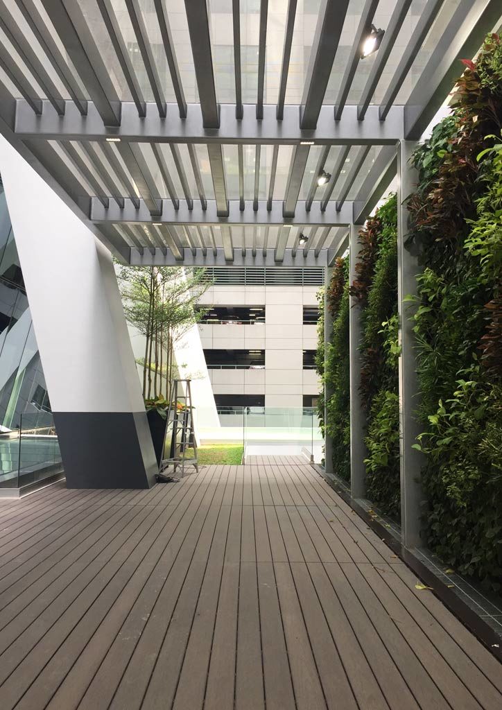Maybe the ones on EDSA, but they’re all dying? (Laughter) Emphasis on the living green wall! This is a hydroponic wall irrigated from behind. We devised these LED grow lights. We did light meter testing, what’s the correct distance—a lot of science went into this. The concept came from the architects, SOM, and there’s a company in Singapore, Vertical Green, that did the irrigation. The plants are thriving very well.