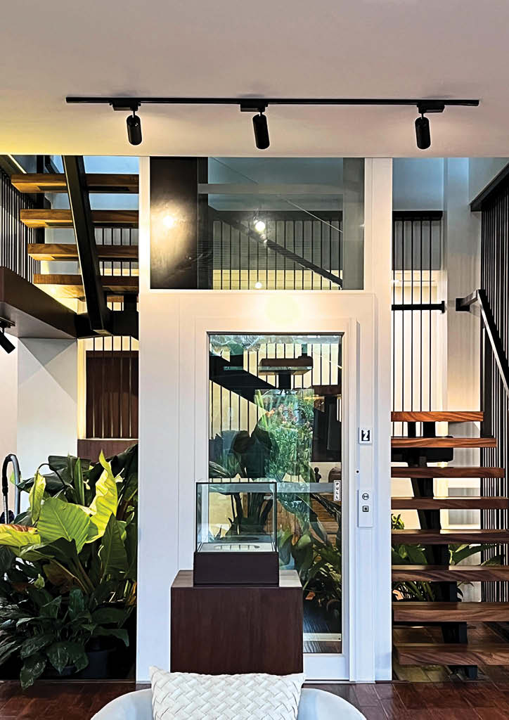 The home lift has glass sides, allowing you to have a full view of the house. It is surrounded by a pocket garden on the ground floor. On the other hand, the stairs are wooden acacia planks supported by tubular steel rods. You can see through the slats across the room.