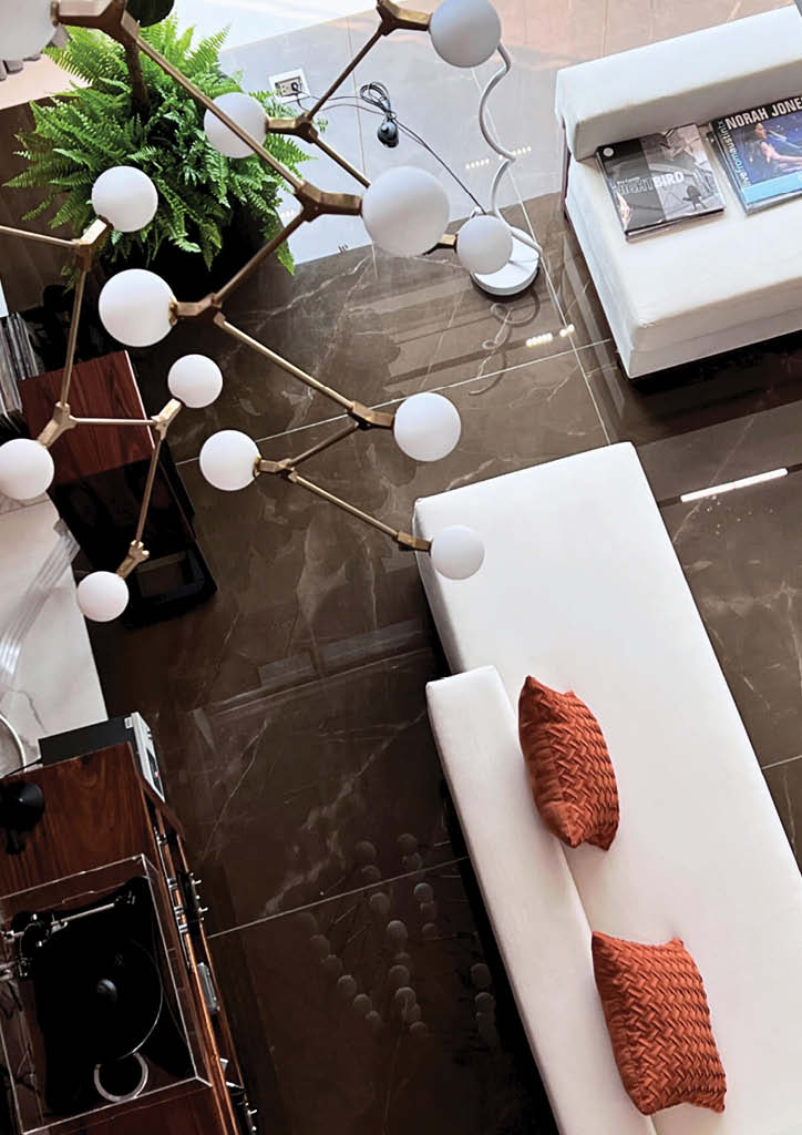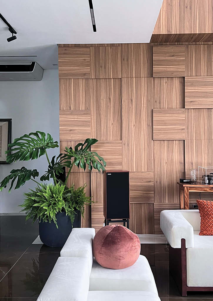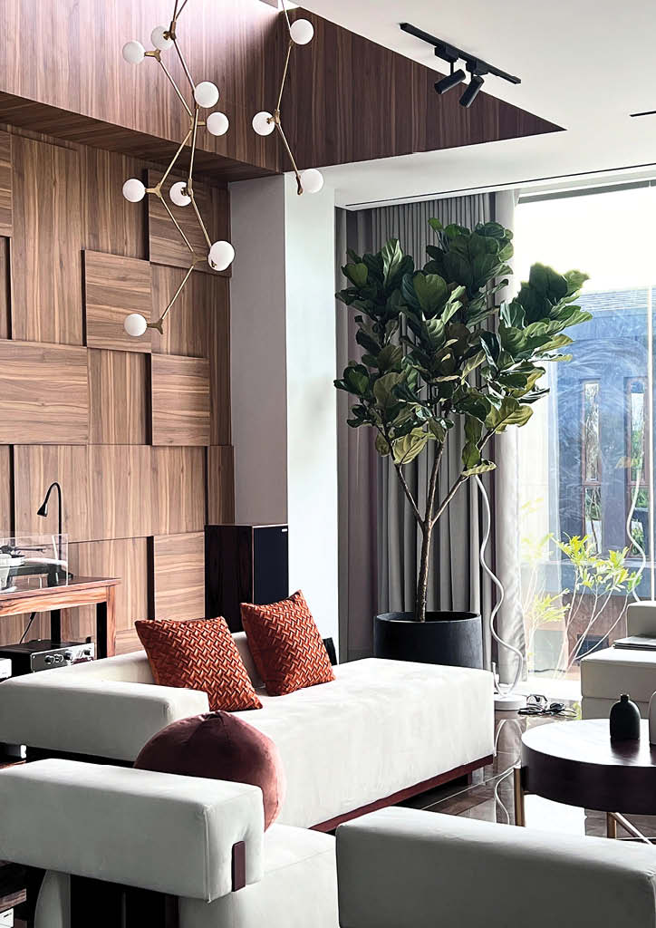 Since the majority of the materials were wood and glass, we made sure to brighten each space with a variety of stone tiles, textiles, and finishes. For instance, fixtures could either have a matte finish or glossy sheen while seating could be leather with embroidered cushions. As for the sintered stone tiles, I had to make a custom order for the dimensions I needed. I wanted full slabs of 1500mm x 3000mm to minimize the appearance of terminations and grouts when the biggest size available in the market was 600mm x 1200mm. I also made it a point to put in furniture in low heights. This draws the eyes to different areas of the room.