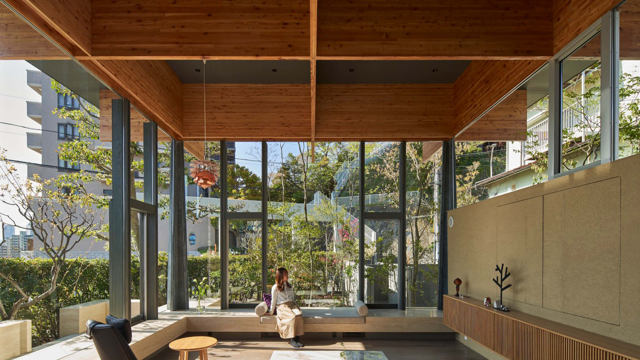 Noting the disadvantages of the south side, UID Architects crafted a three-dimensional space that integrates both the site’s microtopography and an expansive roof with 1,000 millimeter x 64 millimeter laminated wood woven in a 2,700-millimeter grid pattern supported by six cross-shaped steel pillars. Alongside the topography, this large and flat roof provides excellent privacy all around while still keeping the interiors open to the sites of the surrounding space.