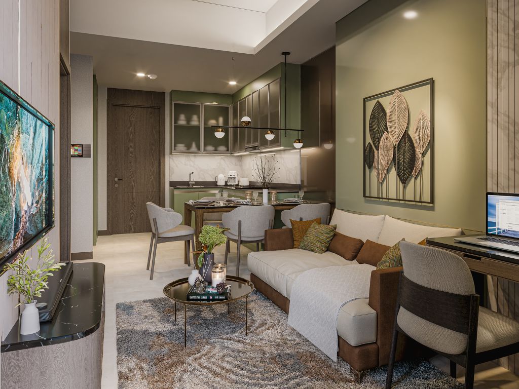 All units come with a private balcony and thoughtful built-ins, including engineered wood finishes throughout the living space. For ultimate comfort, essential appliances like an air conditioner, refrigerator, cooktop, washer, and dryer are included. Penthouse units get an extra perk – a dishwasher!