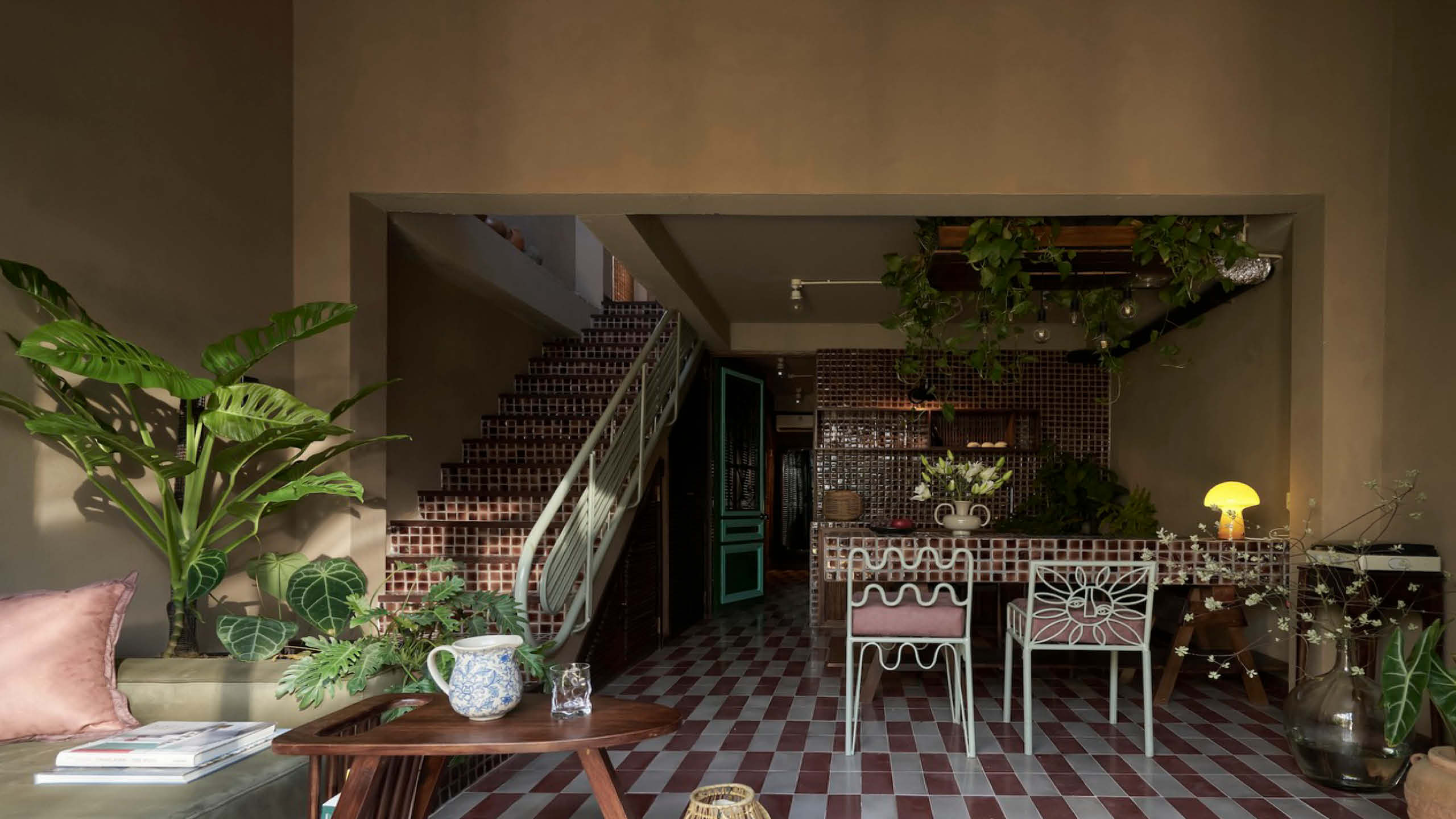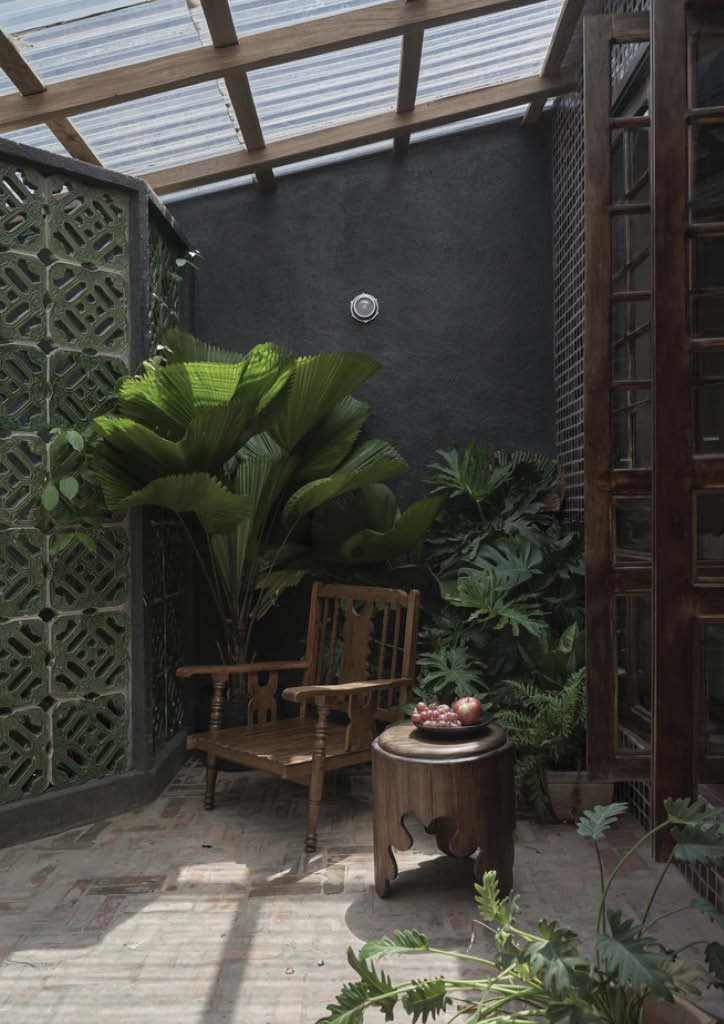 To create focal points around the house, there are small but meticulously arranged tiles planted in various areas. The exterior meanwhile balances out the interior’s warm earthiness. Alongside cooler tones, the home has glazed ceramic tiles shaded in green hues and ornamented with ethnic patterns. With an earthen front yard featuring clay bricks, the exterior presents a contrast that highlights the rustic fence and adds a unique touch to the home.