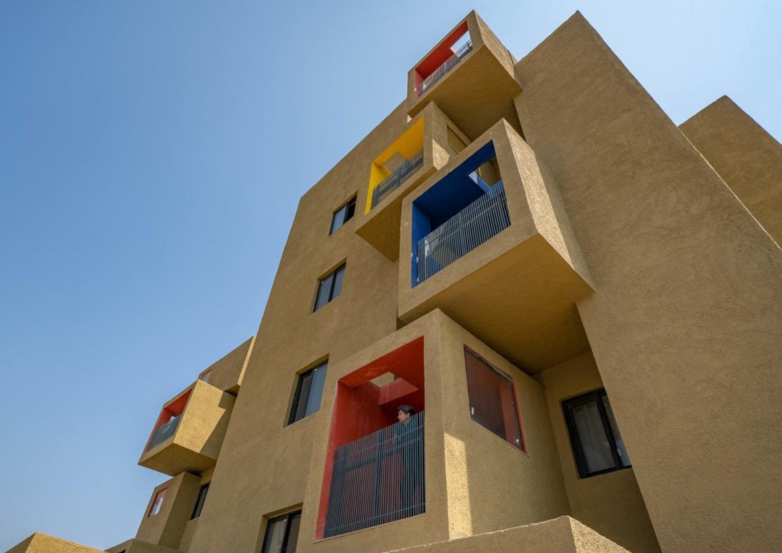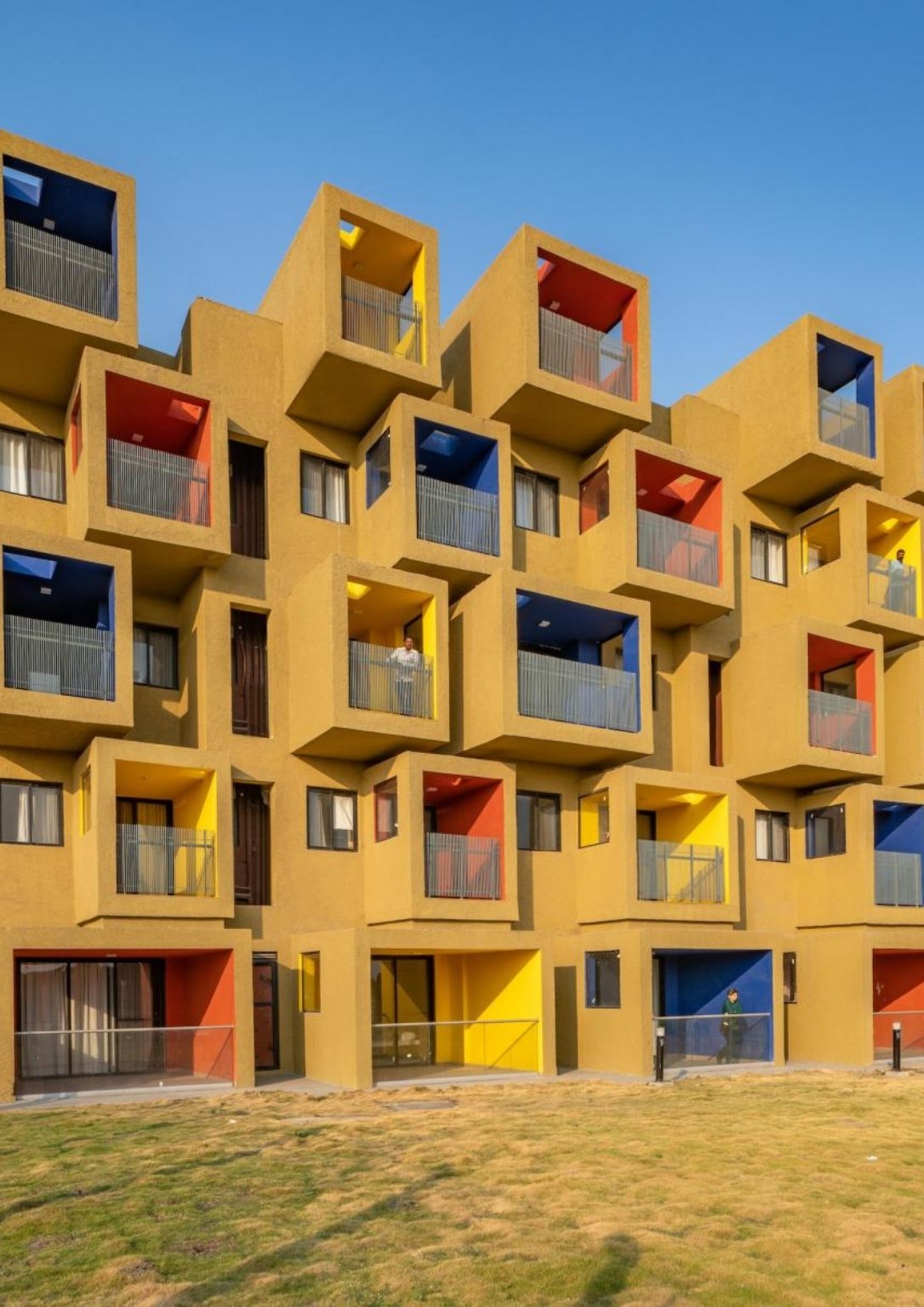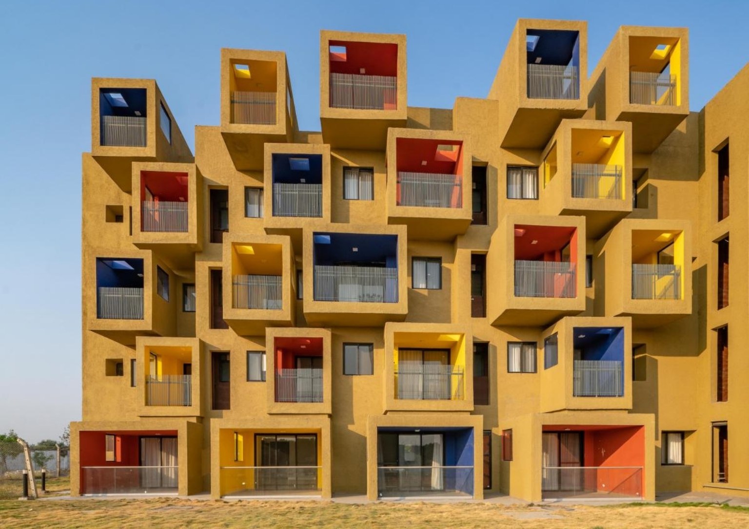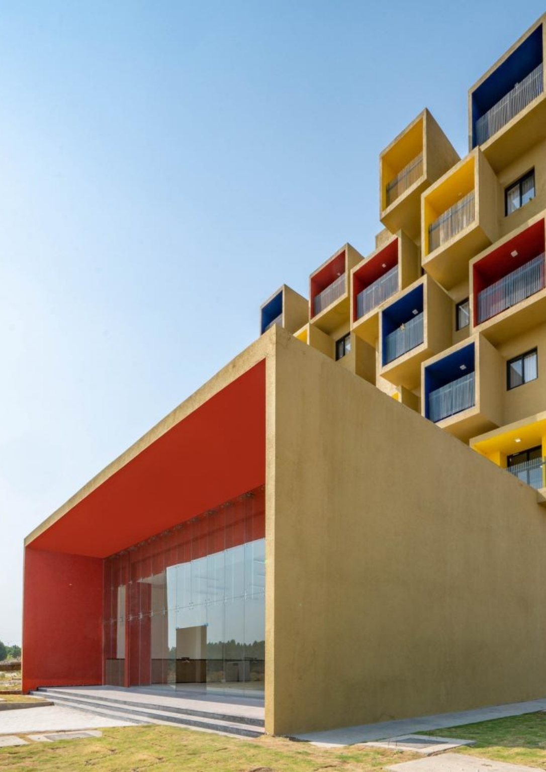 Holi, India’s annual festival to celebrate color shows the country’s love for pigments. Anchored on this idea, Sanjay Puri Architects creates Studios 90 in Kodla, Karnataka. The structure is a stack of colored cuboids representing Indian culture through the use of the richest primary colors. Red, blue, and yellow coat the cantilevered balconies of each apartment. Yellow-ochre is the structure’s most dominant shade hinting at the country’s most common food hue. The creative use of colors forms an exceptional identity for this residential project.